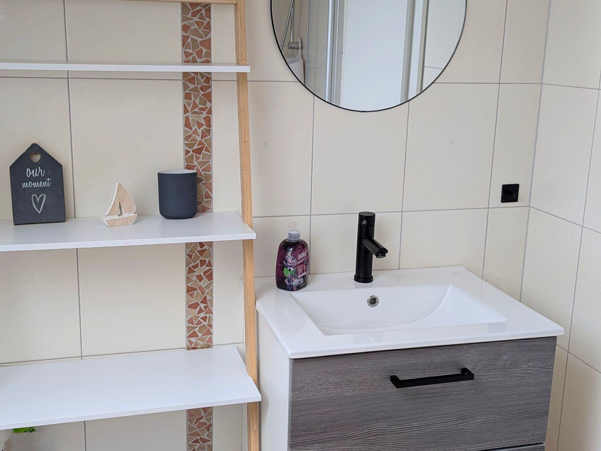 -Badezimmer: Dusche, Waschbecken, Schrank