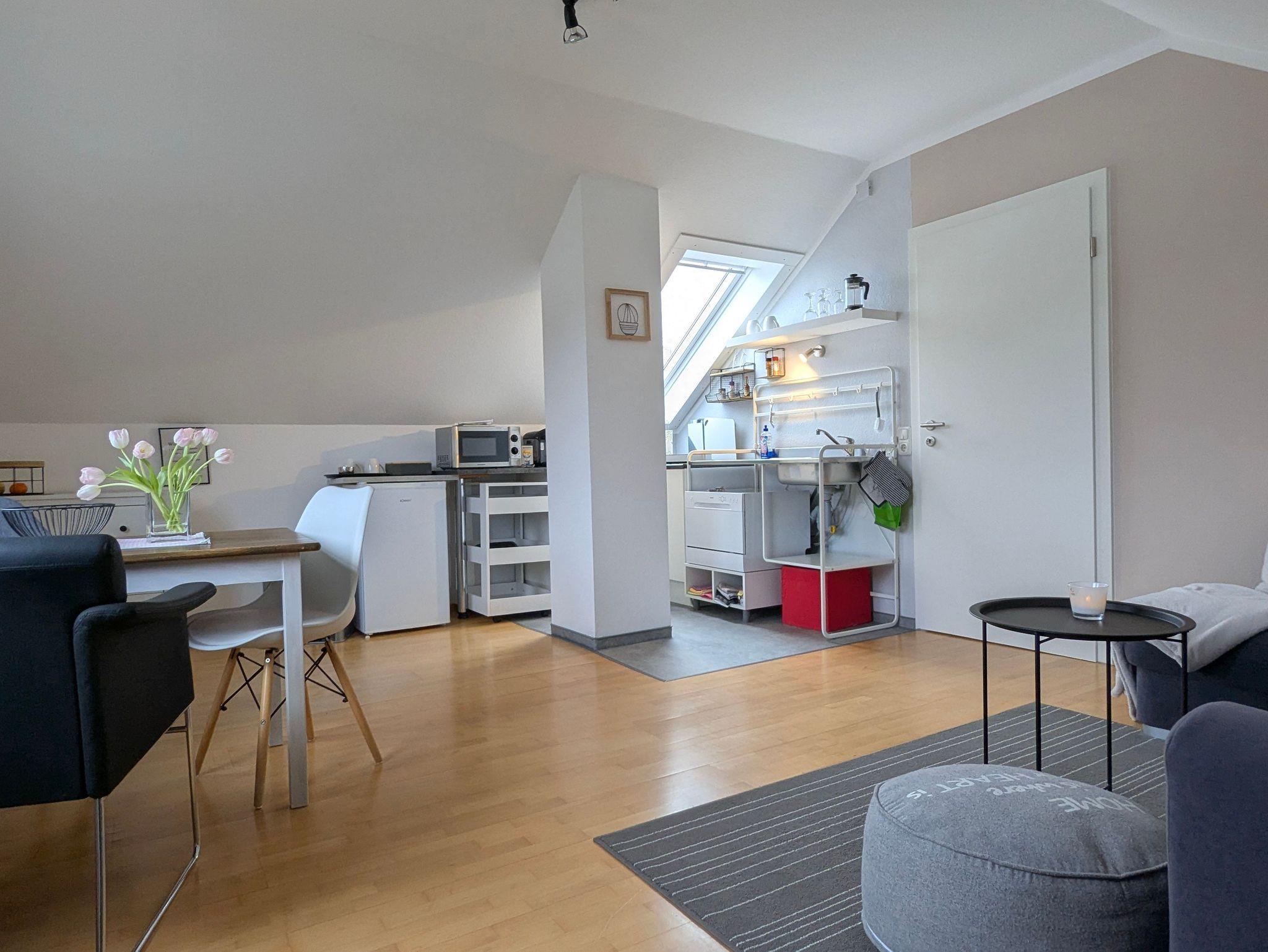 - eine Wohnzimmer & Pantry Küche ausgestattet mit: Schlafcouch, Esstisch, Stühle, Mikrowelle, Spülmaschine, Kühlschrank, Induktionskochplatten, Wasserkocher, Fernseher, Kaffeemaschine