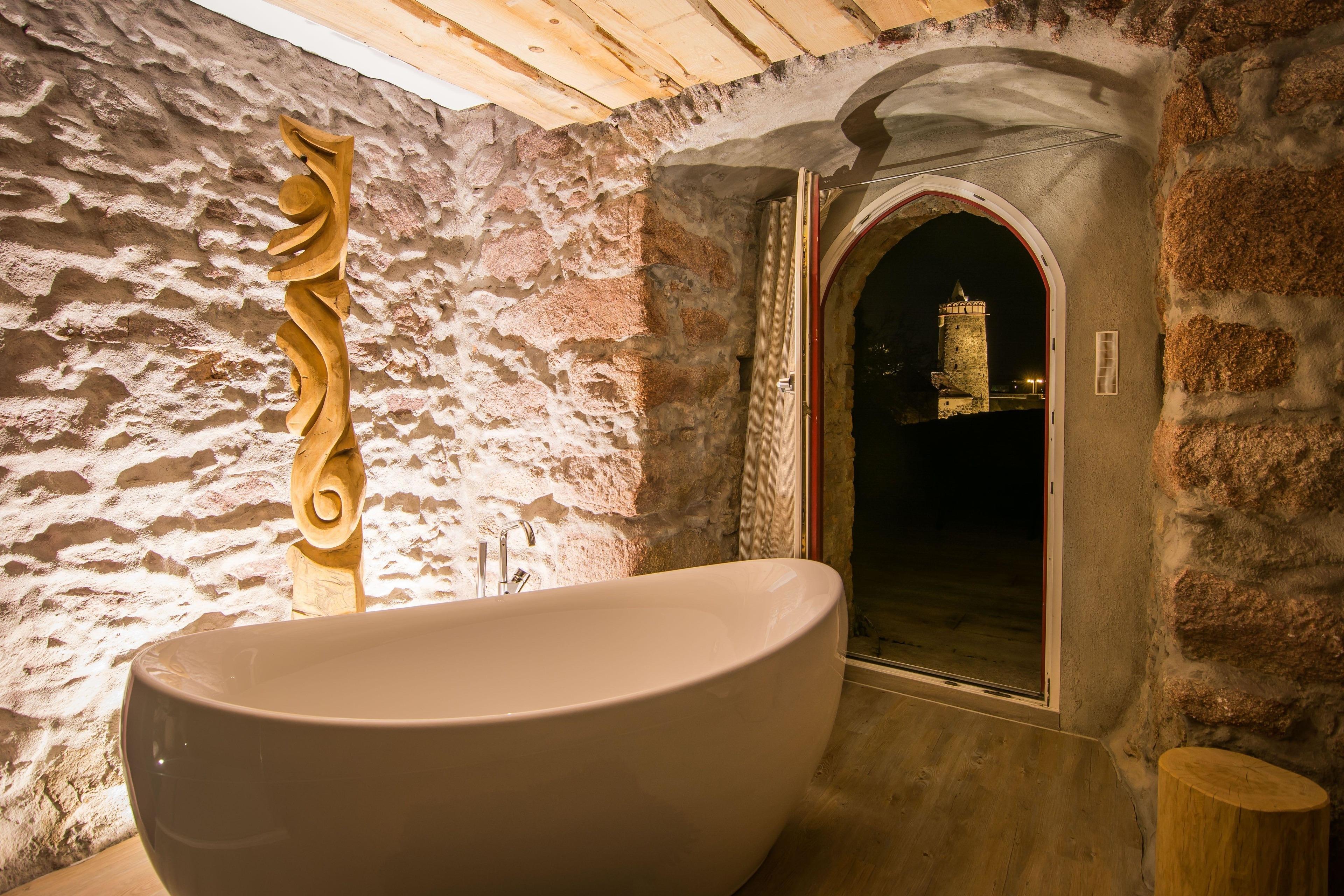 Die Suite besteht aus einer offenen zweietagigen Galerie, einem eigenen Wellnessbereich mit finnischer Sauna und freistehender Wanne, umrandet von 500 Jahre altem und liebevoll restaurierten Natursteinmauerwerk, welches dem Rundbau einen eigenen Charme verleiht. Im Oberrang der Galerie befindet sich eine vollausgestattete moderne Küche mit einem gemütlichen Frühstücksbereich sowie einem einladenenden Hochbett auf einer freistehenden hölzernen Plattform mit Blick in den durch eine Glastür abgetrenten Wellnessbereich. Unterhalb des Hochbetts, im unteren Teil der Galerie befindet sich eine gemütliche Kuschelecke, welche auch als Schlafgelegenheit für weitere Gäste geeignet ist.