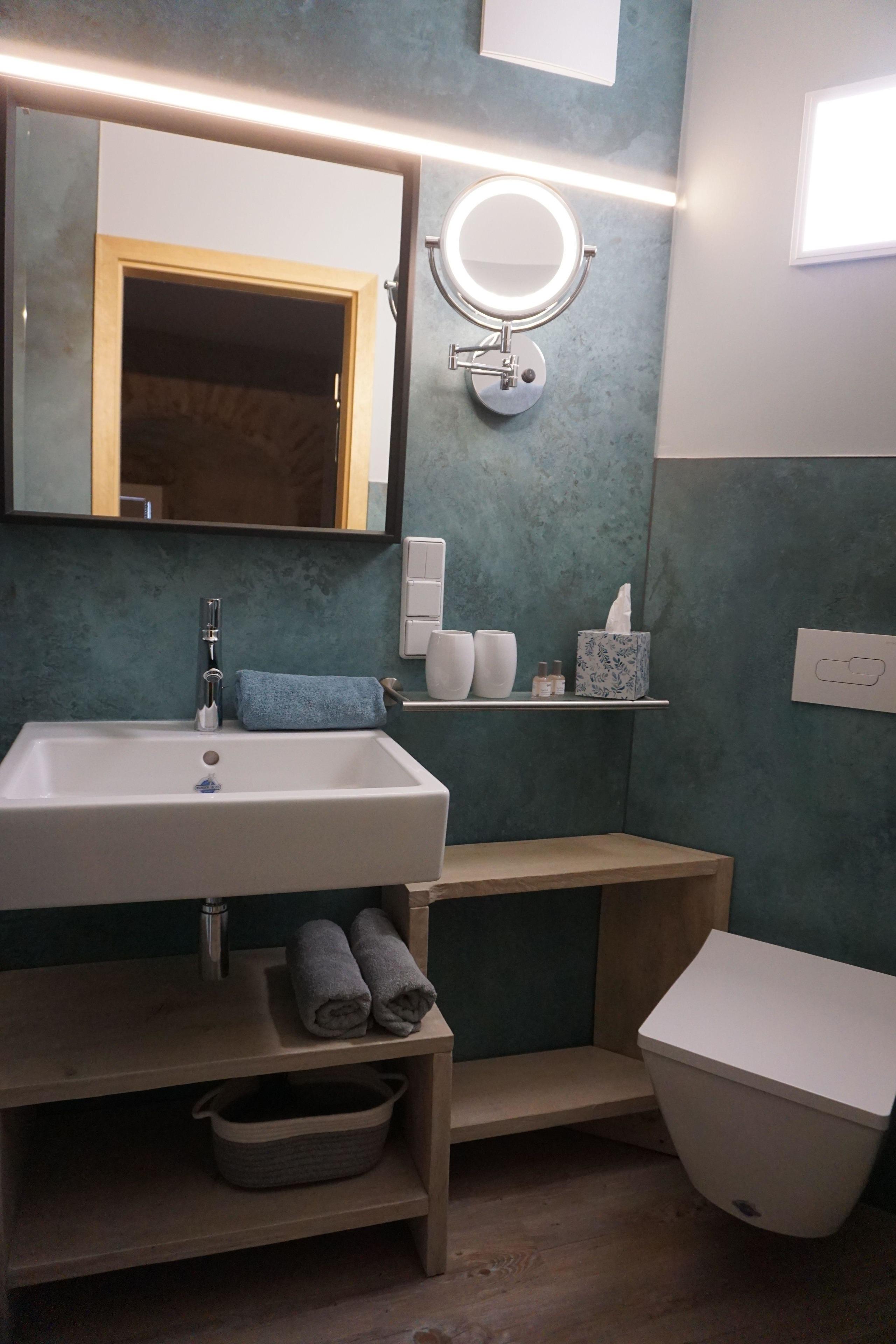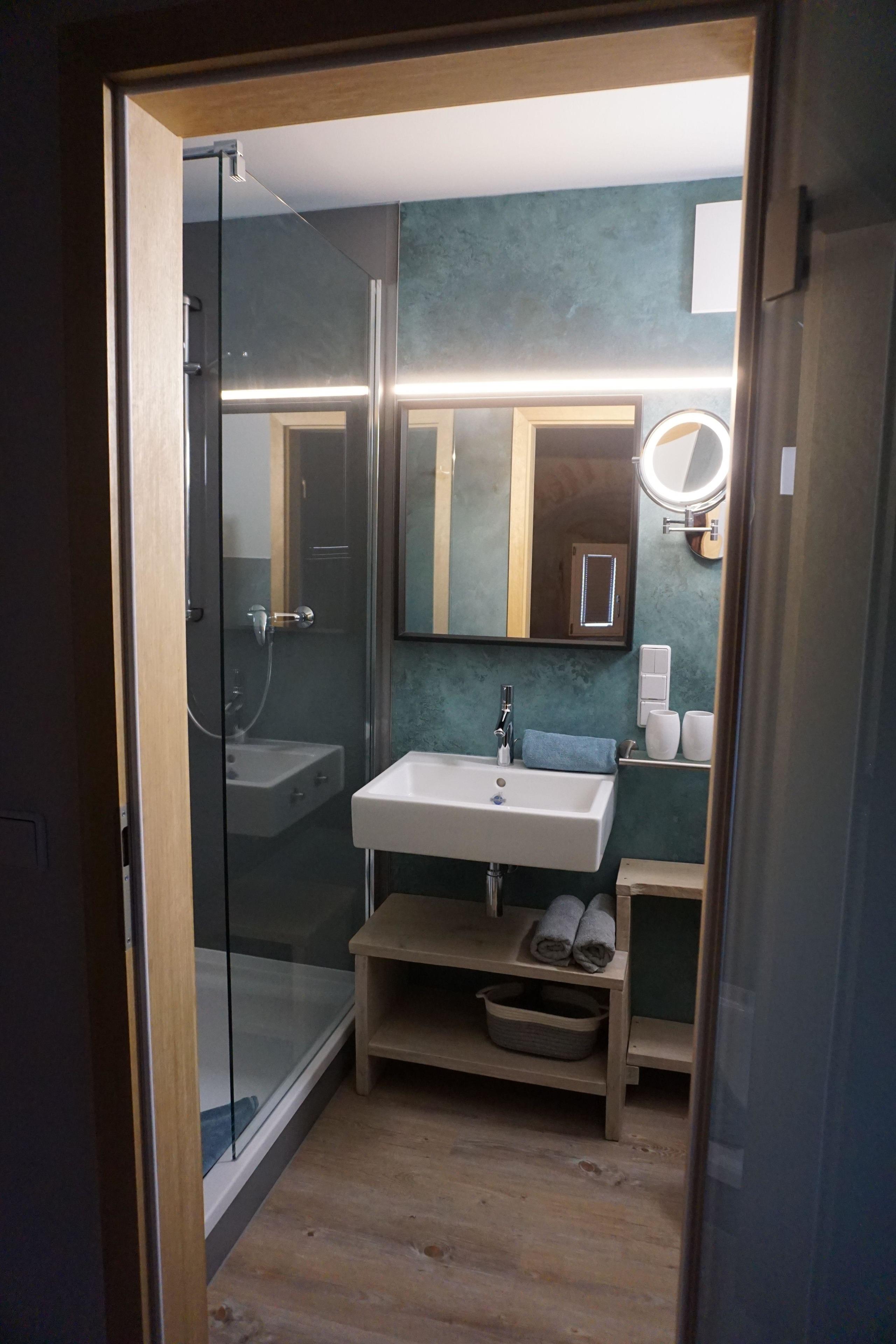 Das Turmzimmer ist von malerischem Natursteinmauerwerk umrandet, besitzt eine Kaffeeküche, die Unabhängigkeit beim Frühstück garantiert sowie ein eigenes Bad. Die Fenster sorgen für eine lichtdurchflutete Atmosphäre. Insgesamt vereint das Zimmer den historischen Charme alten Mauerwerks mit einem modern Ambiente.