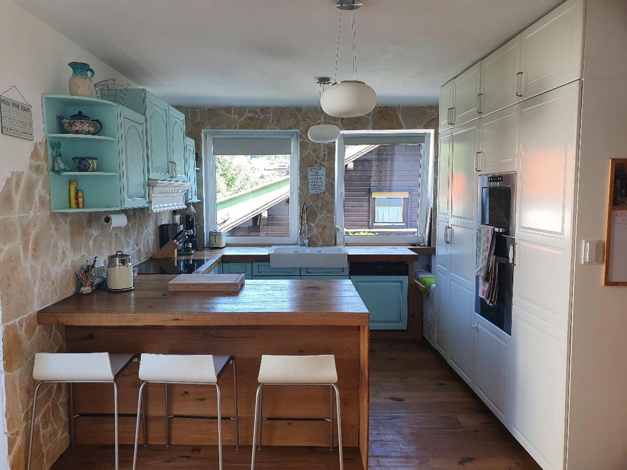 eine voll ausgestattete Küche mit Frühstücksbar.