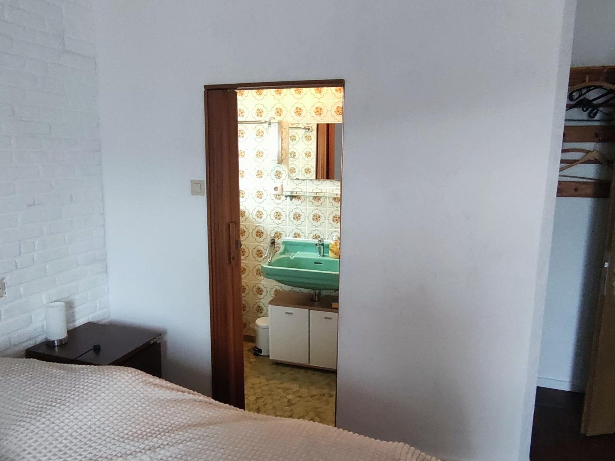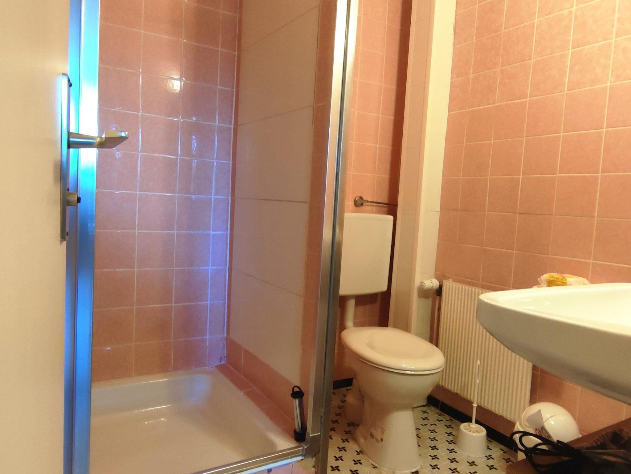 Badezimmer mit Dusche, Waschbecken und WC, jeweils im Schlaf- und im Wohnbereich. Der Android TV im Schlafzimmer funktioniert über