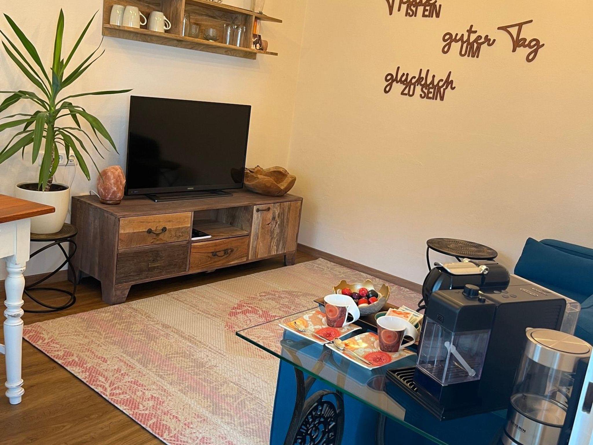 Nach dem Motto „die Liebe steckt im Detail“, haben wir unsere Ferienwohnung Auszeit-Glück in 2024 mit viel Liebe und Herzblut für Sie neugestaltet und eingerichtet. Freuen Sie sich auf eine Wohnung zum Ausspannen & Wohlfühlen mit 1 Schlafzimmer, das mit 1 hochwertigen Doppelbett (1,60 m x 2,00 m ) 1 Bank und 1 modernen Kommode mit Kleiderstange in Rohroptik möbliert ist und über Verdunklungsvorhänge verfügt. Das Wohnzimmer bietet Ihnen einen heimeligen Essbereich, eine integrierte kleine Kaffeebar mit Nespressomaschine inklusive Milchaufschäumer, eine gemütliche Couch, ein Sideboard mit kleiner Spiele- & Bücherauswahl, sowie einem Erste-Hilfe-Set, einem Flachbildschirmfernseher und Internet. Im Eingangsbereich ist eine kleine, separate Küche integriert. Diese verfügt über einen Kühlschrank mit Gefrierfach, zwei Induktionskochplatten, Toaster, Wasserkocher und die gängigsten Küchenutensilien. Das Bad mit Tageslicht ist ausgestattet mit einer modernen Dusche. Zur Wohnung gehört außerdem eine kleine Terrasse, auf der Sie in der Früh die Sonne und nachmittags den Schatten genießen können. Diese ist ausgestattet mit 1 kleinen Tisch, 2 Stühlen und einem Kugel-Holzkohle-Grill. Ein Staubsauger, ein kleiner Wäscheständer und Putzutensilien sind vorhanden. Das WLAN ist kostenfrei, das Rauchen ist nur im Außenbereich auf den dafür vorgesehenen Flächen gestattet. Wir freuen uns auf Sie!