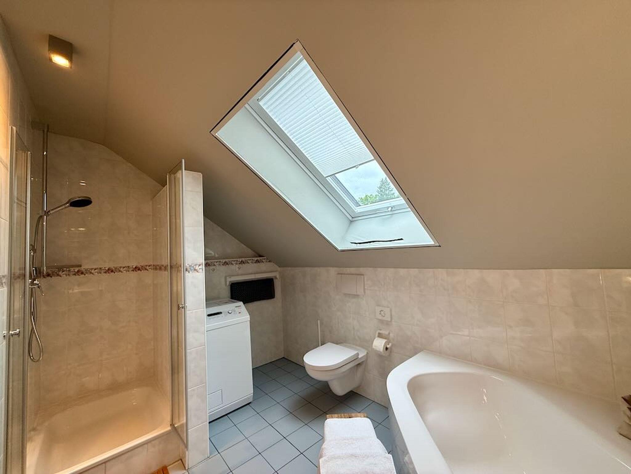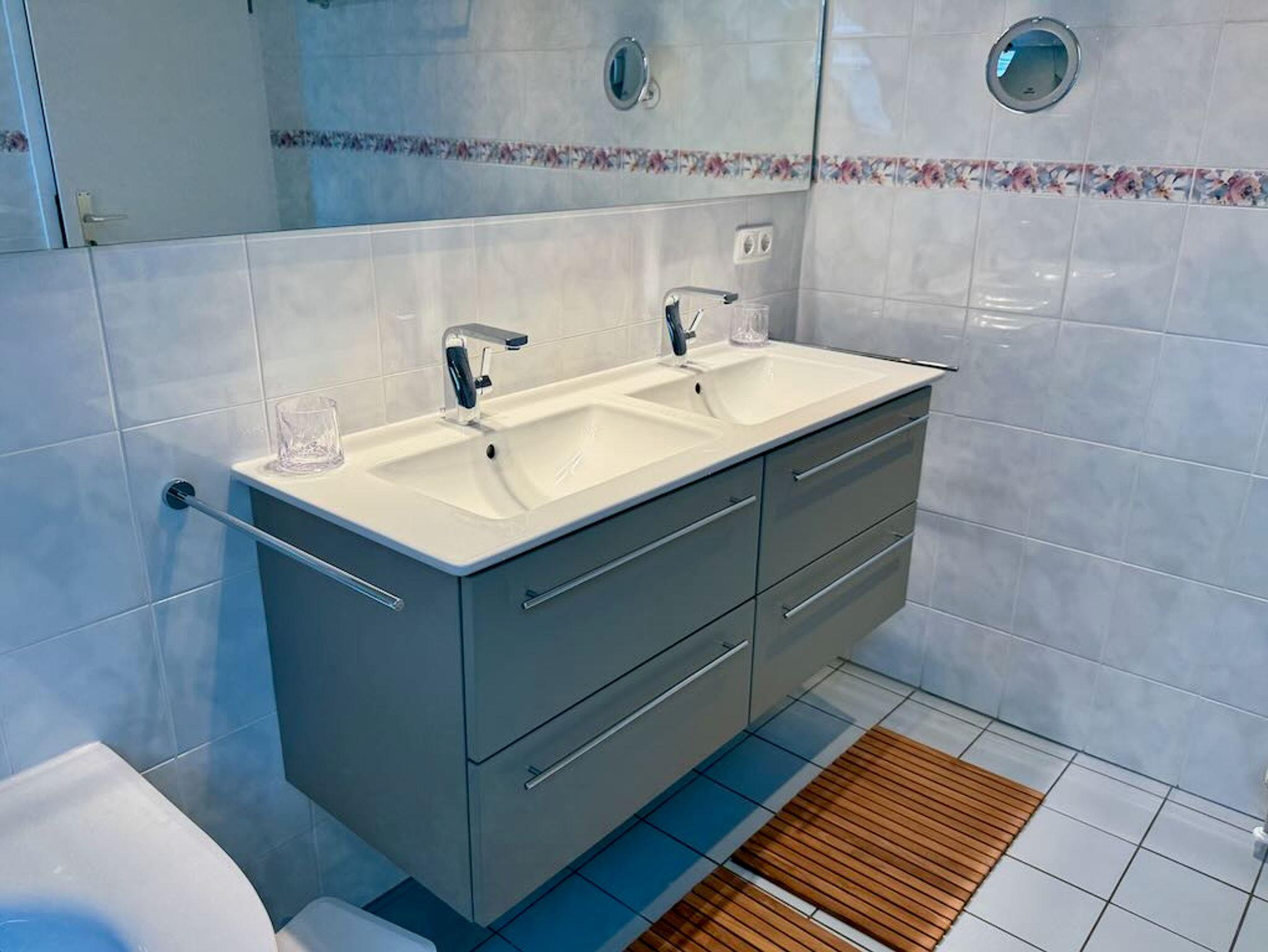 Das Badezimmer unserer Ferienwohnung präsentiert sich als modernes Tageslichtbad und luxuriöser Rückzugsort, der zum Wohlfühlen einlädt. Es ist ausgestattet mit hochwertigen Armaturen, edlen Materialien sowie einem Doppelwaschbecken und einem ansprechenden Design. Die geräumige Dusche und eine entspannende Badewanne bieten vielfältige Möglichkeiten zur Erfrischung und Erholung. Helle Farben und die natürliche Belichtung schaffen eine einladende und saubere Atmosphäre. Hier finden Sie alle Annehmlichkeiten, um sich nach einem ereignisreichen Tag zu revitalisieren und verwöhnen zu lassen.