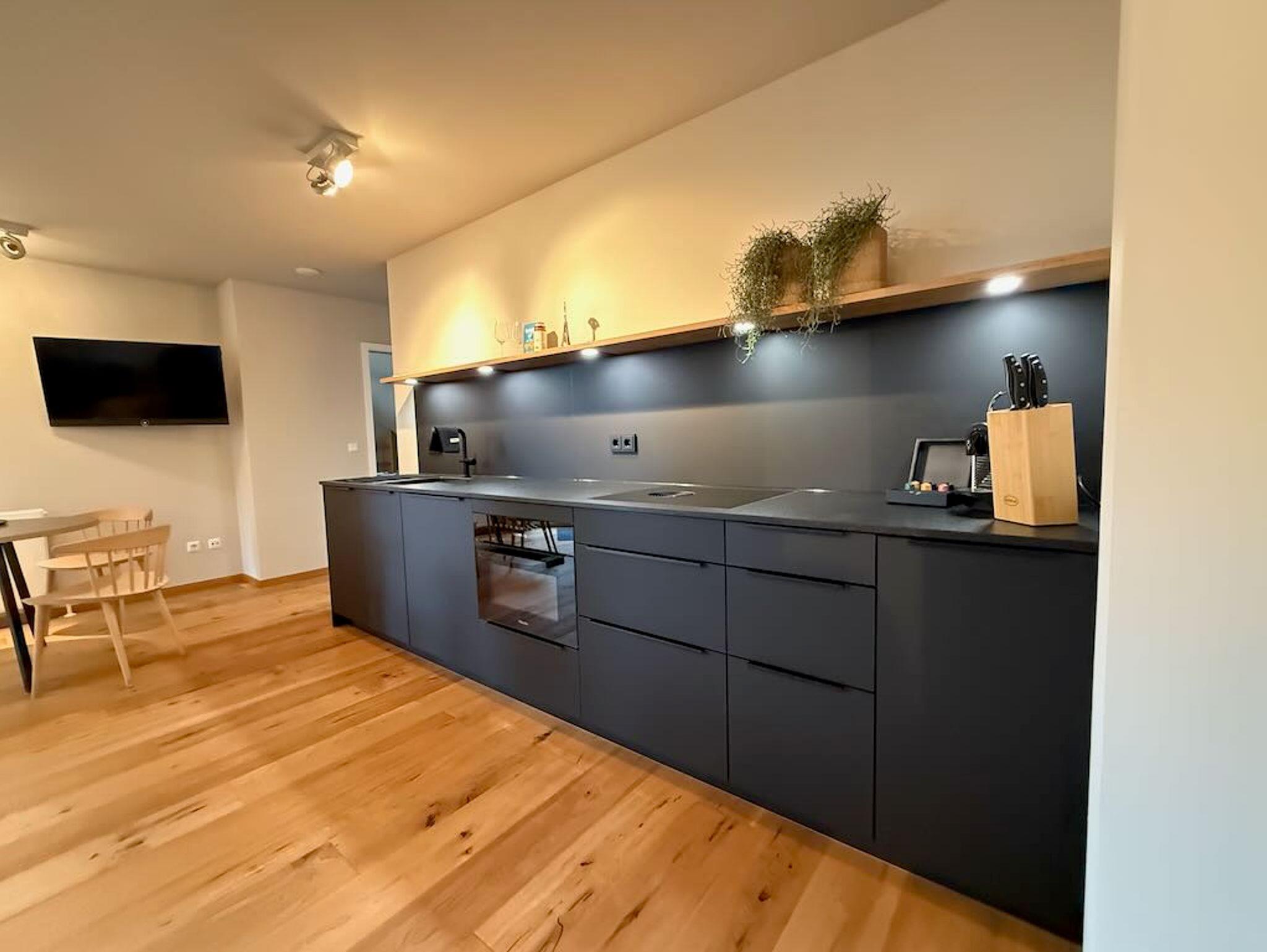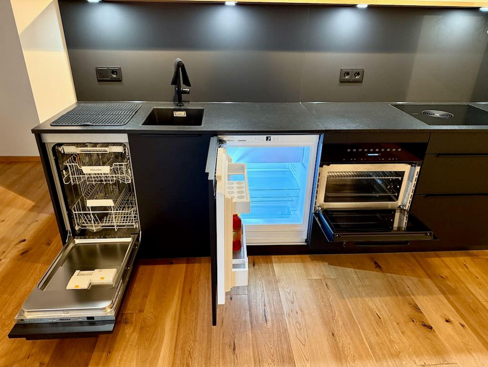 Die Küche der Ferienwohnung Elsa ist harmonisch in den offenen Wohnbereich integriert und verbindet modernste Funktionalität mit edlem Design. Sie ist komplett mit hochwertigen Geräten von Miele, Bora, etc. ausgestattet und lässt keine Wünsche offen, um kulinarische Kreationen zu zaubern. Die Küche verfügt über eine Geschirrspülmaschine, einen Kombi-Mikrowellenbackofen und einem Kühlschrank mit Gefrierfach. Elegante Oberflächen und eine durchdachte Anordnung der Elemente schaffen ein inspirierendes Kochambiente. Ob ein schnelles Frühstück oder ein festliches Abendessen – hier finden Sie alles Notwendige. Die offene Gestaltung fördert die Geselligkeit und macht das Zubereiten von Speisen zu einem Vergnügen in einem luxuriösen und modernen Ambiente.