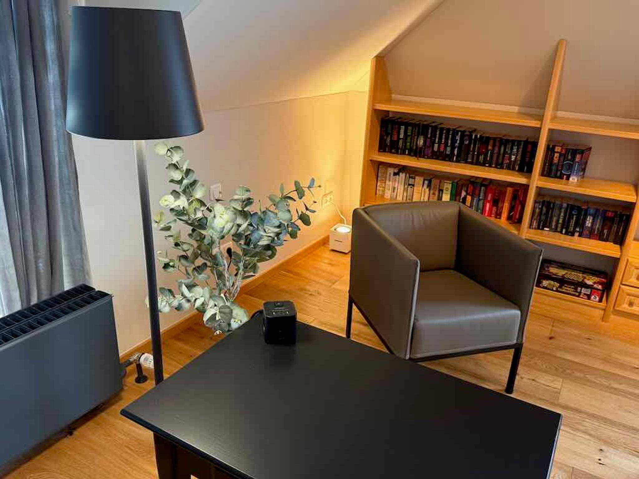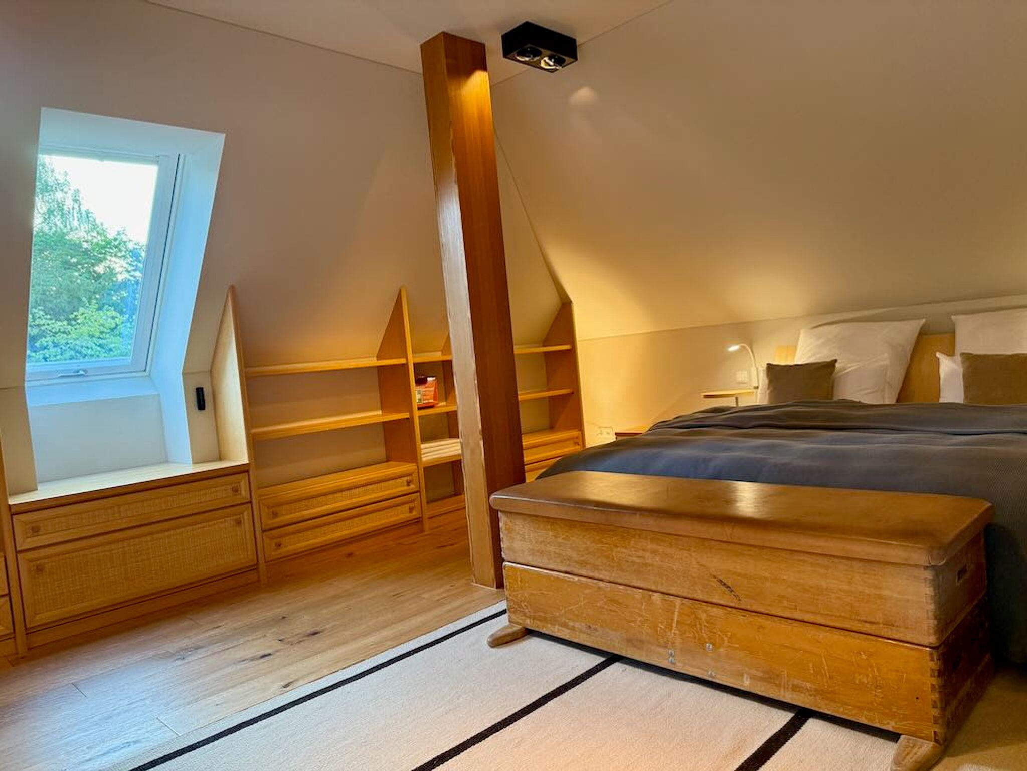 Das Schlafzimmer ist eine Oase der Ruhe und des luxuriösen Komforts, maßgeschneidert für einen erholsamen Schlaf. Ein bequemes Bett von 2x2 Metern mit hochwertiger Bettwäsche garantiert süße Träume und einen erfrischenden Start in den neuen Tag. Die elegante und moderne Einrichtung, geprägt durch viel helles Naturholz, schafft eine beruhigende Atmosphäre, die zum Entspannen einlädt. Dezente Beleuchtung trägt zur angenehmen Stimmung bei und sorgt für Gemütlichkeit. In diesem Raum befindet sich zudem die praktische Büroecke, ideal für Momente der Konzentration. Von hier aus haben Sie auch direkten Zugang zum Balkon, der frische Luft und eine Erweiterung des Raumes bietet. Dieser private Rückzugsort ist perfekt, um nach einem ereignisreichen Tag in Bayreuth neue Kraft zu schöpfen.