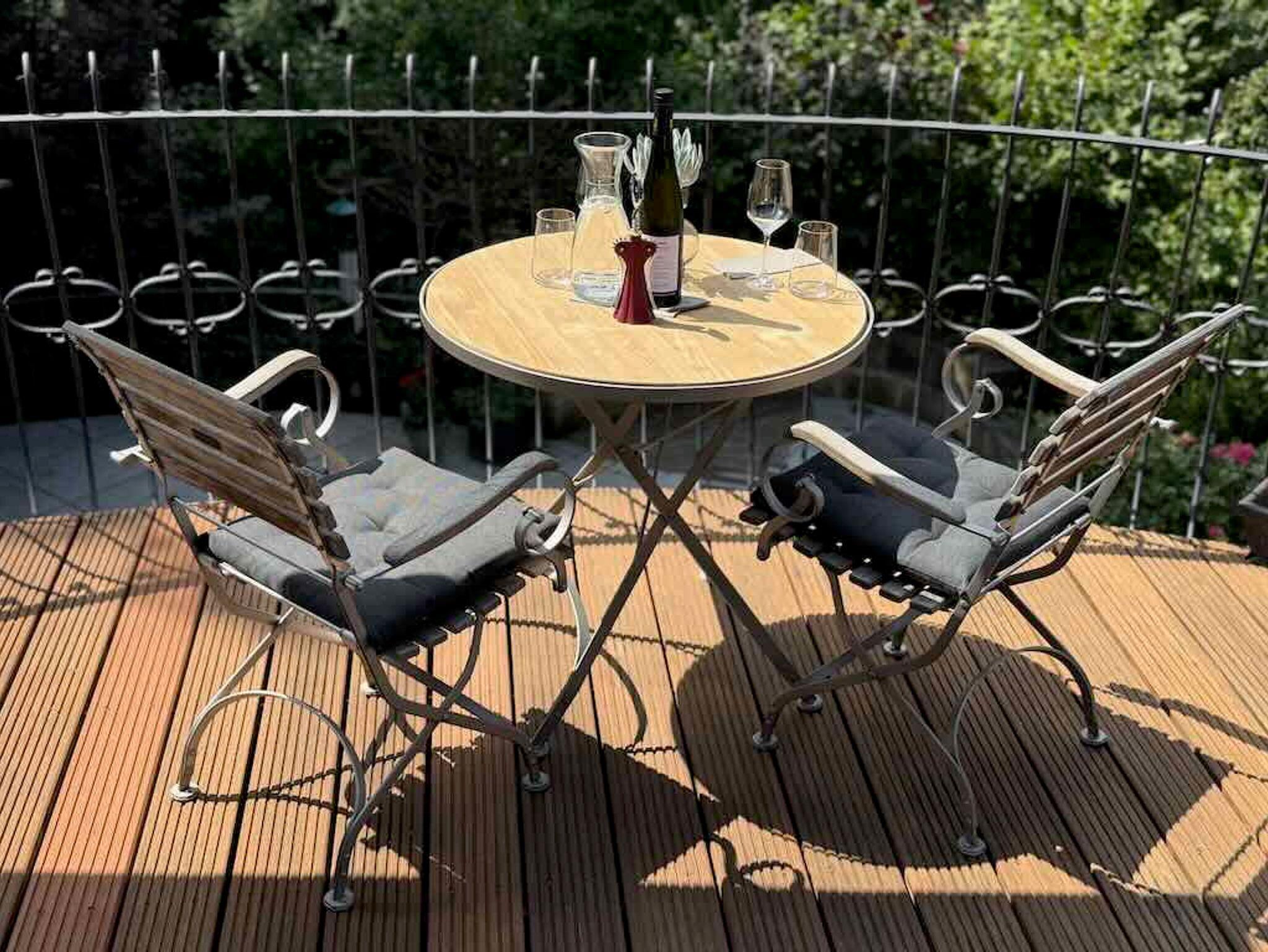 Der Balkon der Ferienwohnung Elsa ist Ihre persönliche Oase der Ruhe und Erholung im Freien. Das Besondere: Sie können ihn direkt vom Wohnzimmer als auch vom Schlafzimmer aus betreten, was Flexibilität und Komfort bietet. Genießen Sie von hier aus einen wunderschönen Blick auf den Garten und lauschen Sie den Festspielfanfaren, die bei Aufführungen herüberklingen. Ausgestattet mit komfortablen Möbeln lädt er zu entspannten Stunden ein, sei es bei einer Tasse Kaffee am Morgen oder einem Glas Wein am Abend. Dieser Außenbereich erweitert Ihr Wohnerlebnis auf luxuriöse Weise und bietet eine willkommene Auszeit.