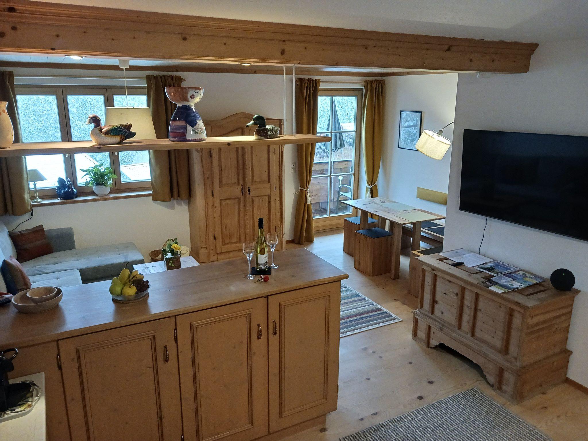 Auf einer Ebene befindet sich ein offener Koch-Wohnbereich mit gemütlicher Wohnlandschaft und eine Essecke. Ein kleiner Balkon mit einem traumhaften Blick auf die umliegenden Berge und das idyllische Bayrischzell lädt zum Verweilen ein.