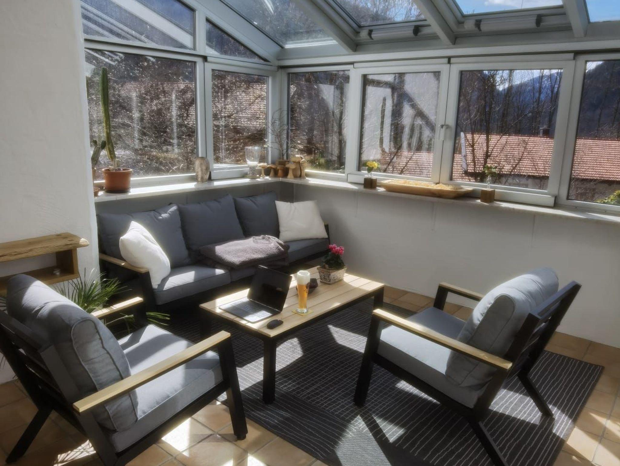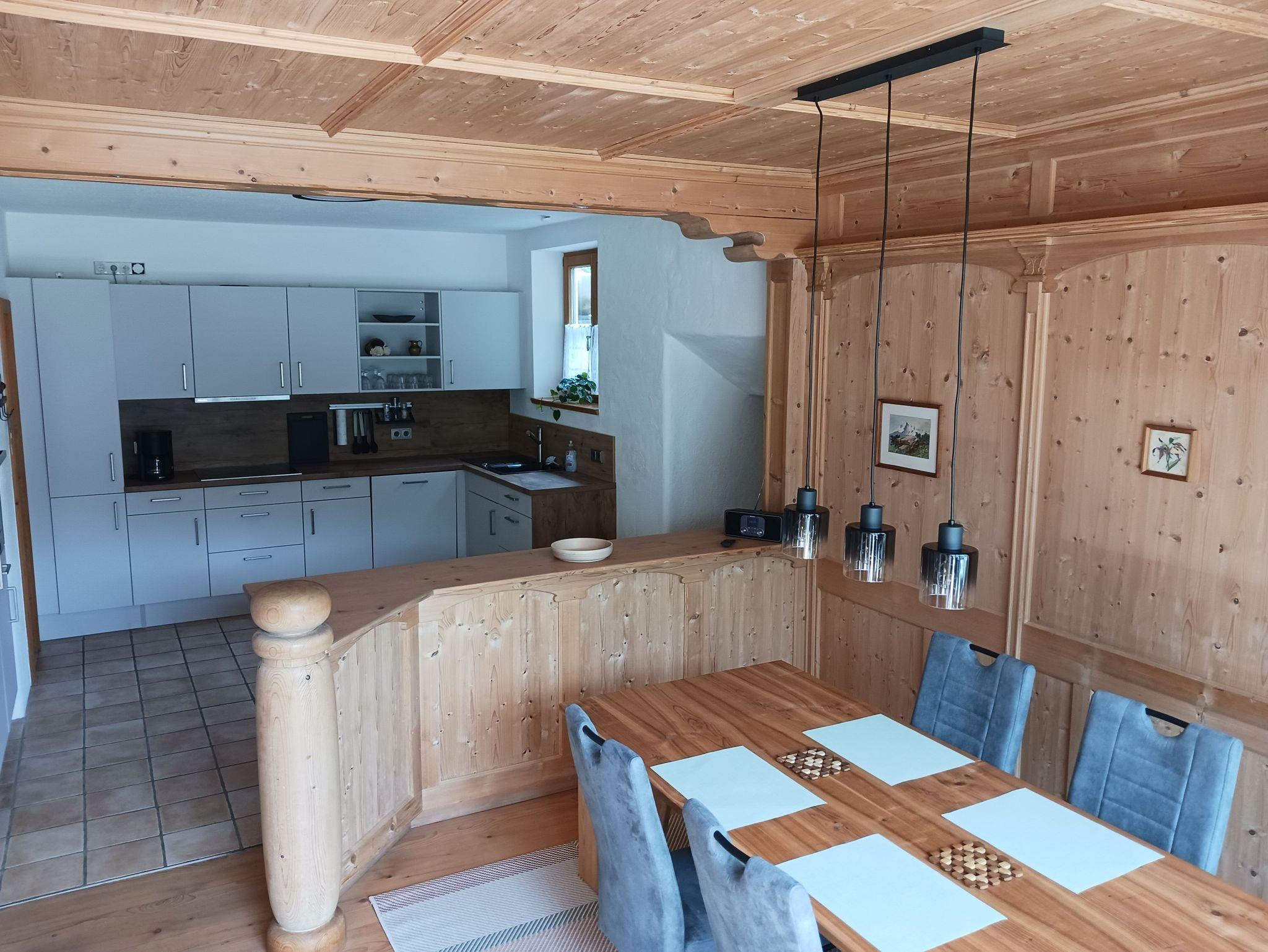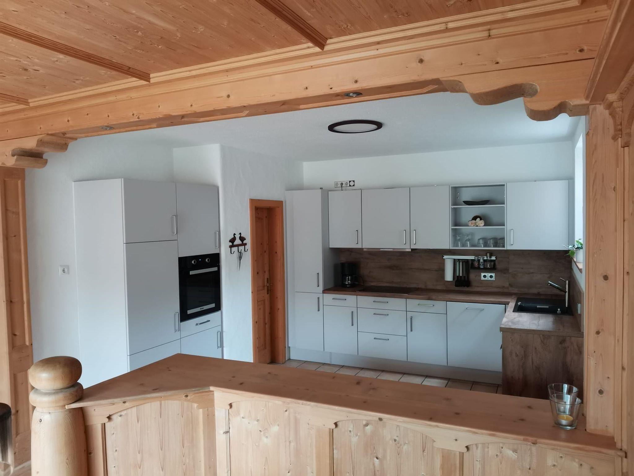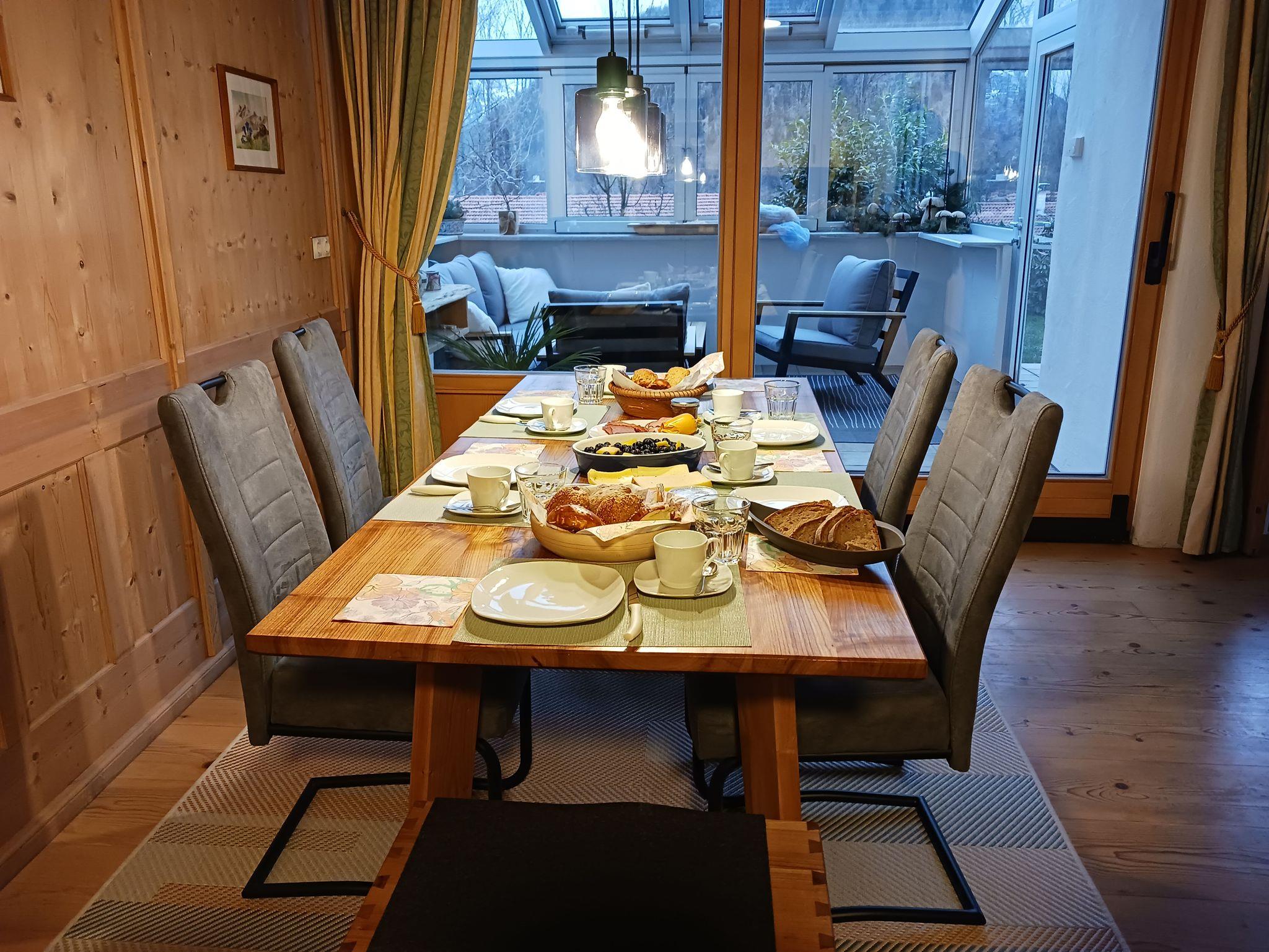 Im Erdgeschoss befindet sich ein offener Koch-Essbereich, ein gemütliches Wohnzimmer mit Kamin und direktem Zugang zum Wintergarten und zur sonnigen Terrasse mit atemberaubendem Blick auf die Berge und das idyllische Bayrischzell.