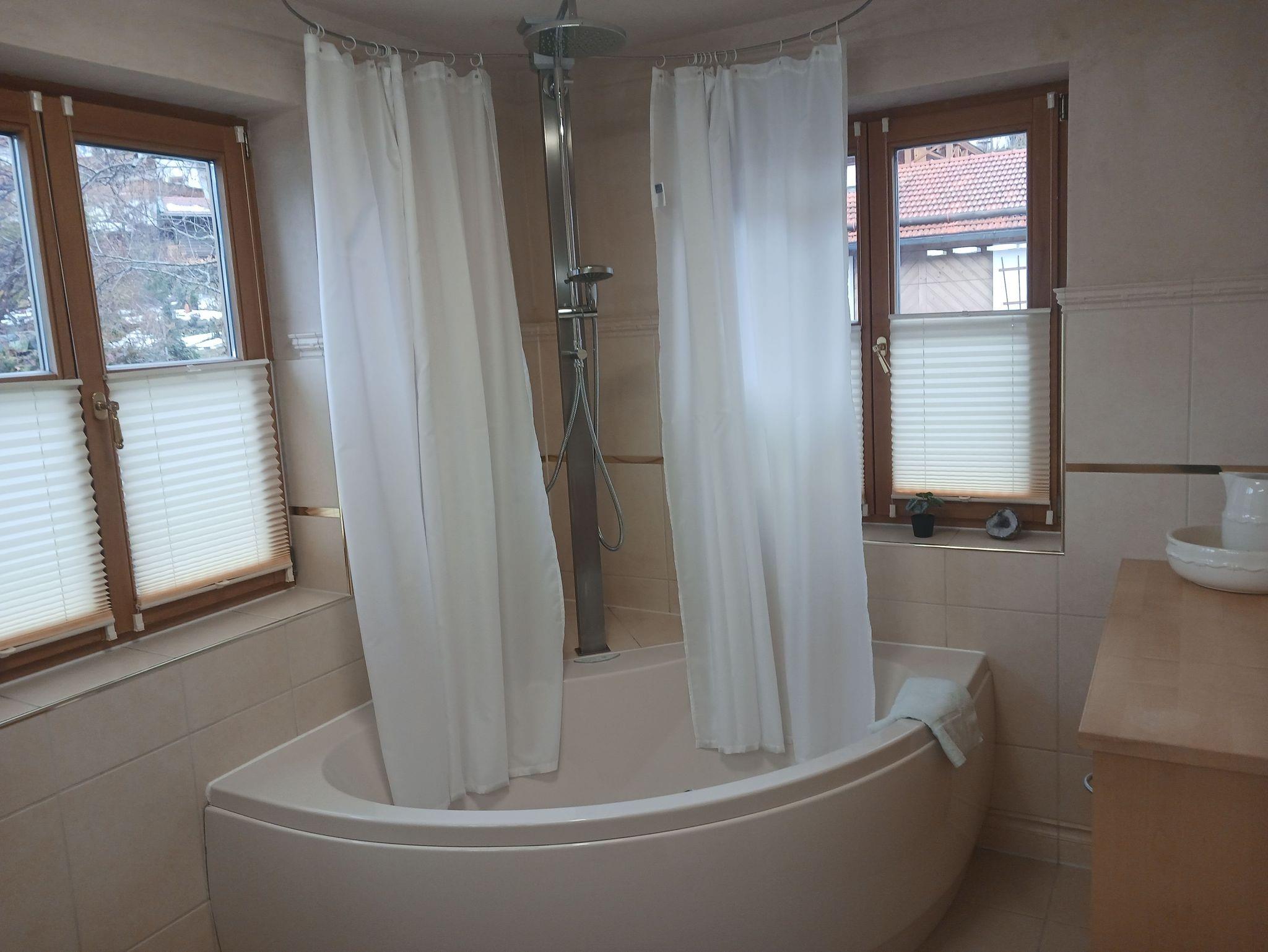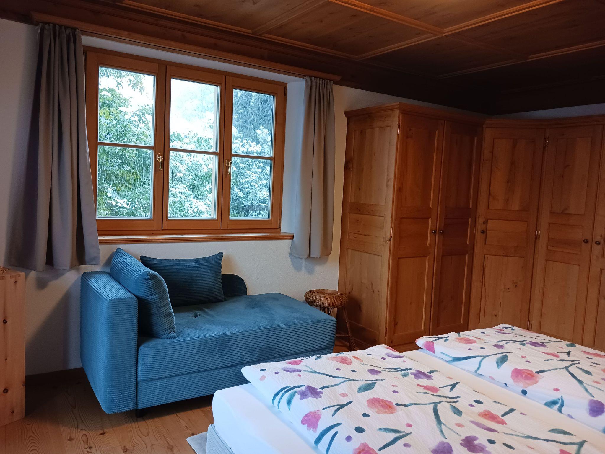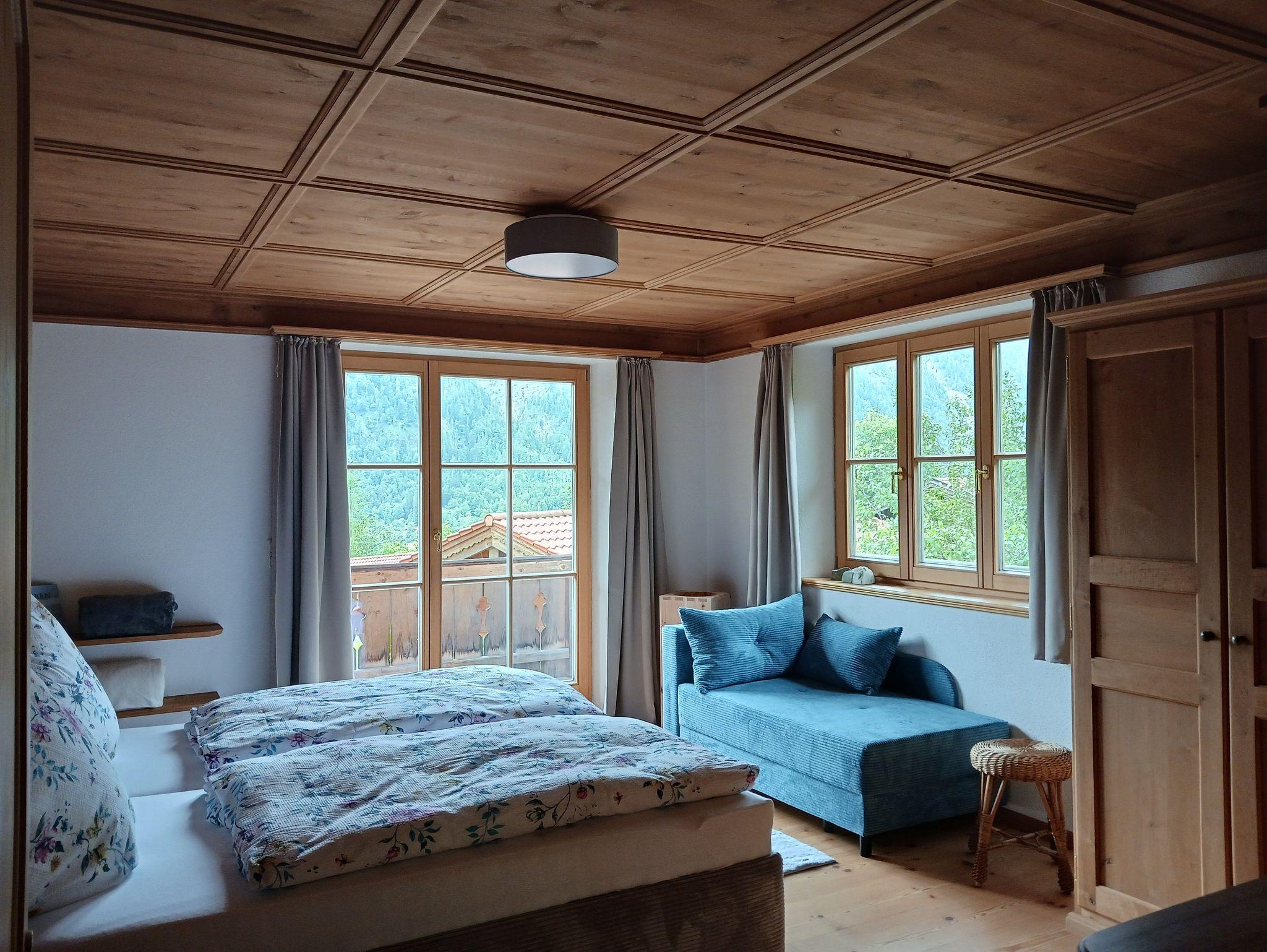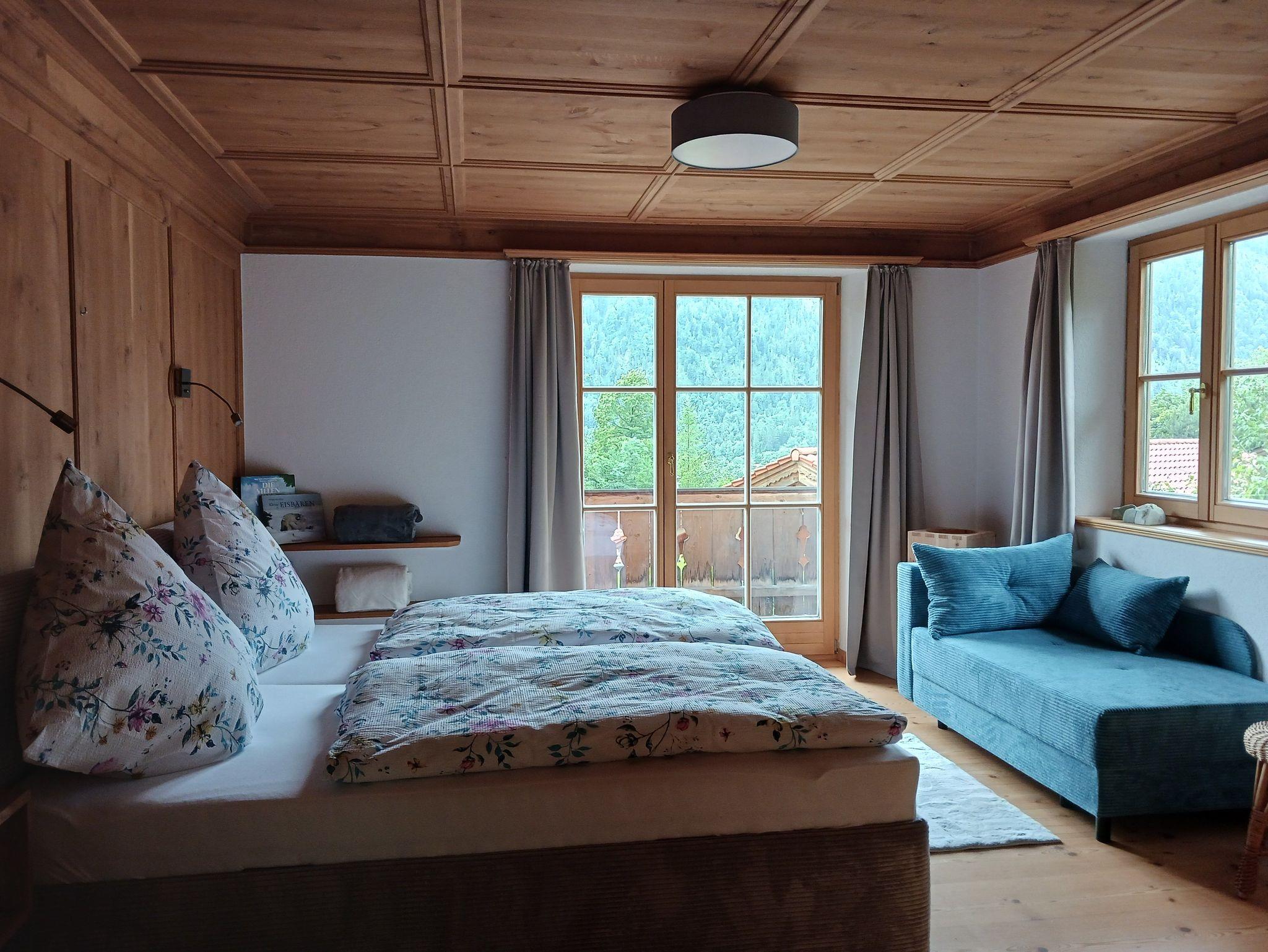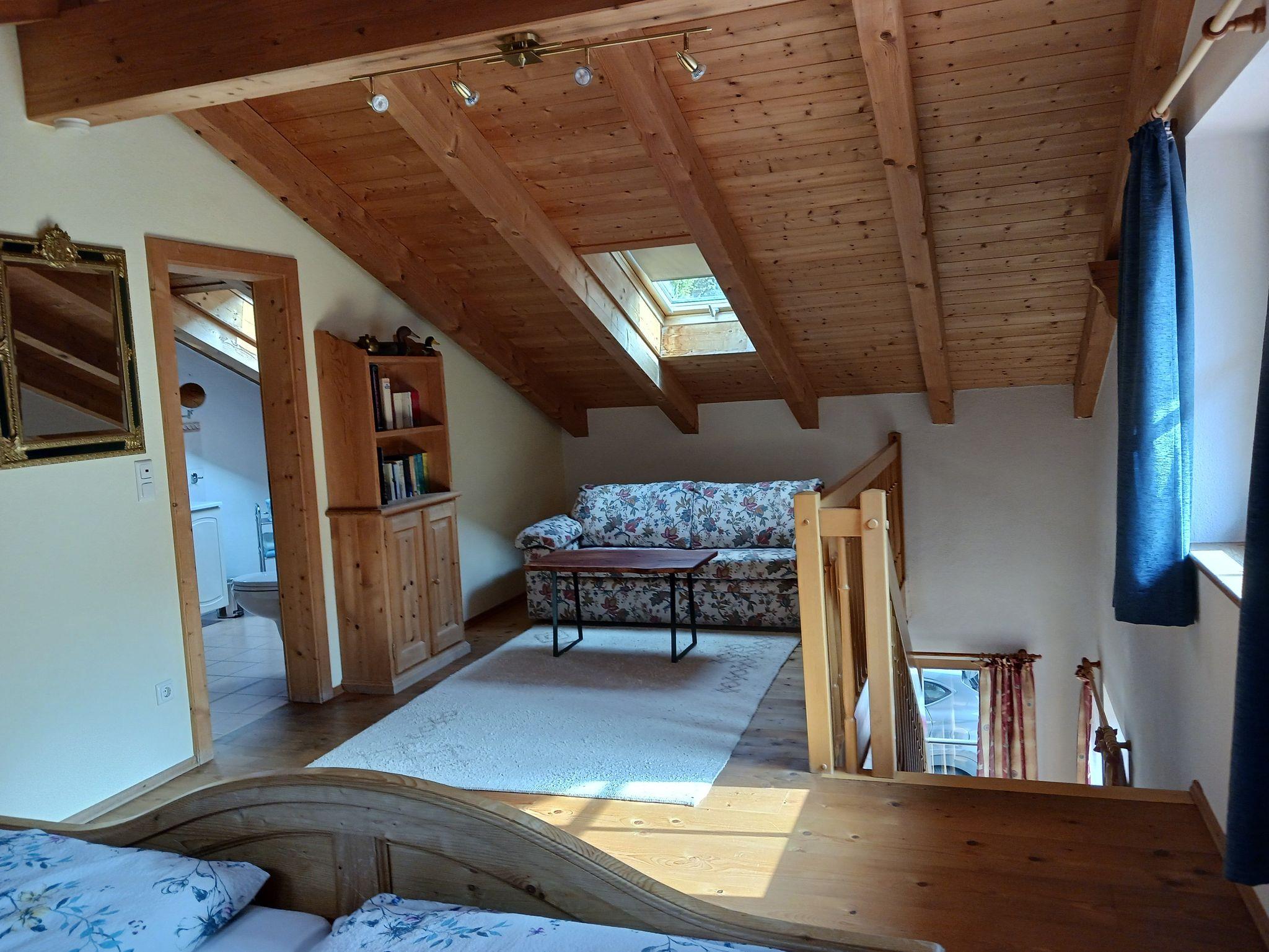 Im Obergeschoss finden sie ein großzügiges Schlafzimmer mit komfortablen Doppelbett und einer Schlafcouch. Alle Schlafzimmer sind mit Insektenschutzrollos ausgestattet. Der Zugang zum großen Balkon ermöglicht es ihnen, die frische Bergluft im heilklimatischen Kurort zu genießen. Ebenso ein Badezimmer mit Whirlpool-Badewanne und eine Garderobe.