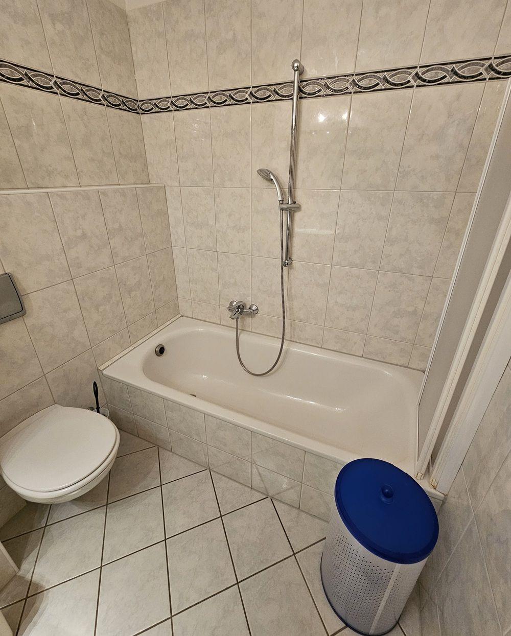 Badezimmer: Funktional mit Dusche, Waschbecken, WC, Spiegel und Föhn.