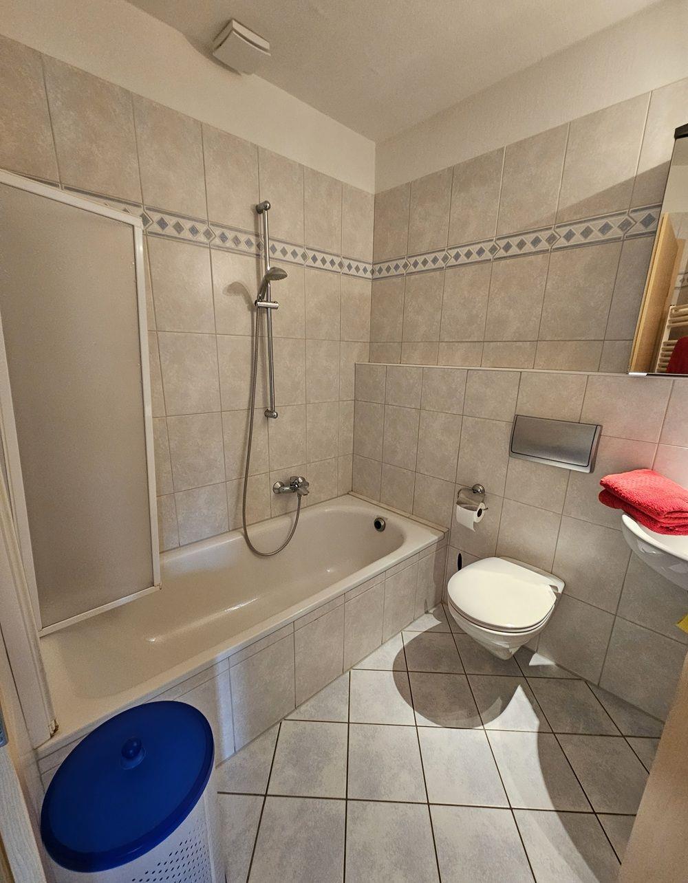 Badezimmer: Eine Dusch-Badewanne, Waschbecken, WC und Ablageflächen für deine Utensilien.