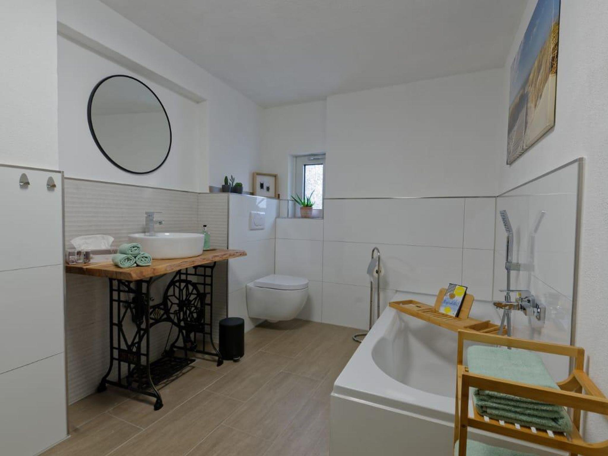 Badezimmer mit ebenerdiger Dusche und Badewanne. Ein Schlafzimmer mit Doppelbett und ein Schlafzimmer mit einem Hochbett (Liegefläche unten 140cm, oben 90cm).