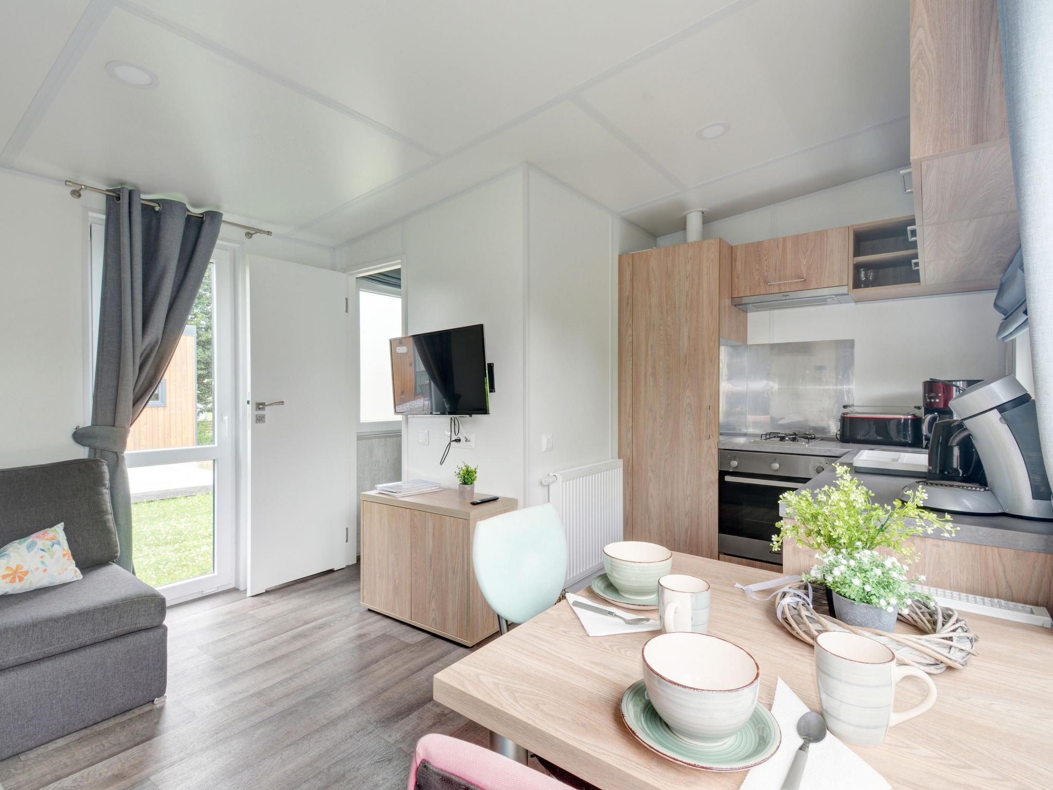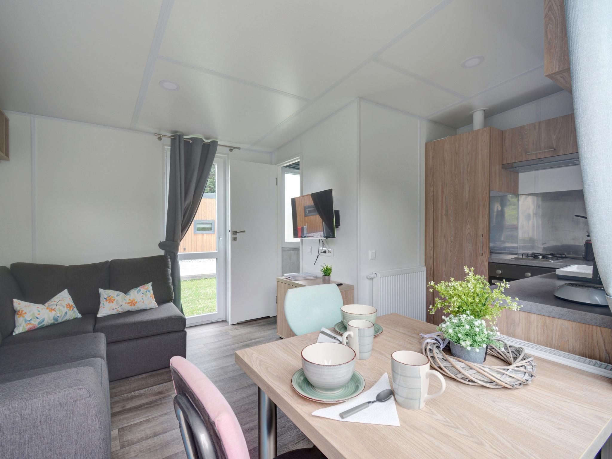 "Tiny Haus Heidi", 2-room mobile home 25 m2. Object suitable for 2 adults + 2 children. Cosy furnishings: living/sleeping room with 1 sofabed (120 cm, length 170 cm), satellite TV. 1 room with 1 french bed (140 cm, length 200 cm). Open kitchen (oven, Gas stove, 2 gas rings, toaster, kettle, electric coffee machine). Shower/WC. Gas heating. Small terrace. Terrace furniture, barbecue, deck chairs (2). Facilities: Internet (WiFi, free). Parking at 50 m. Please note: non-smoking house.