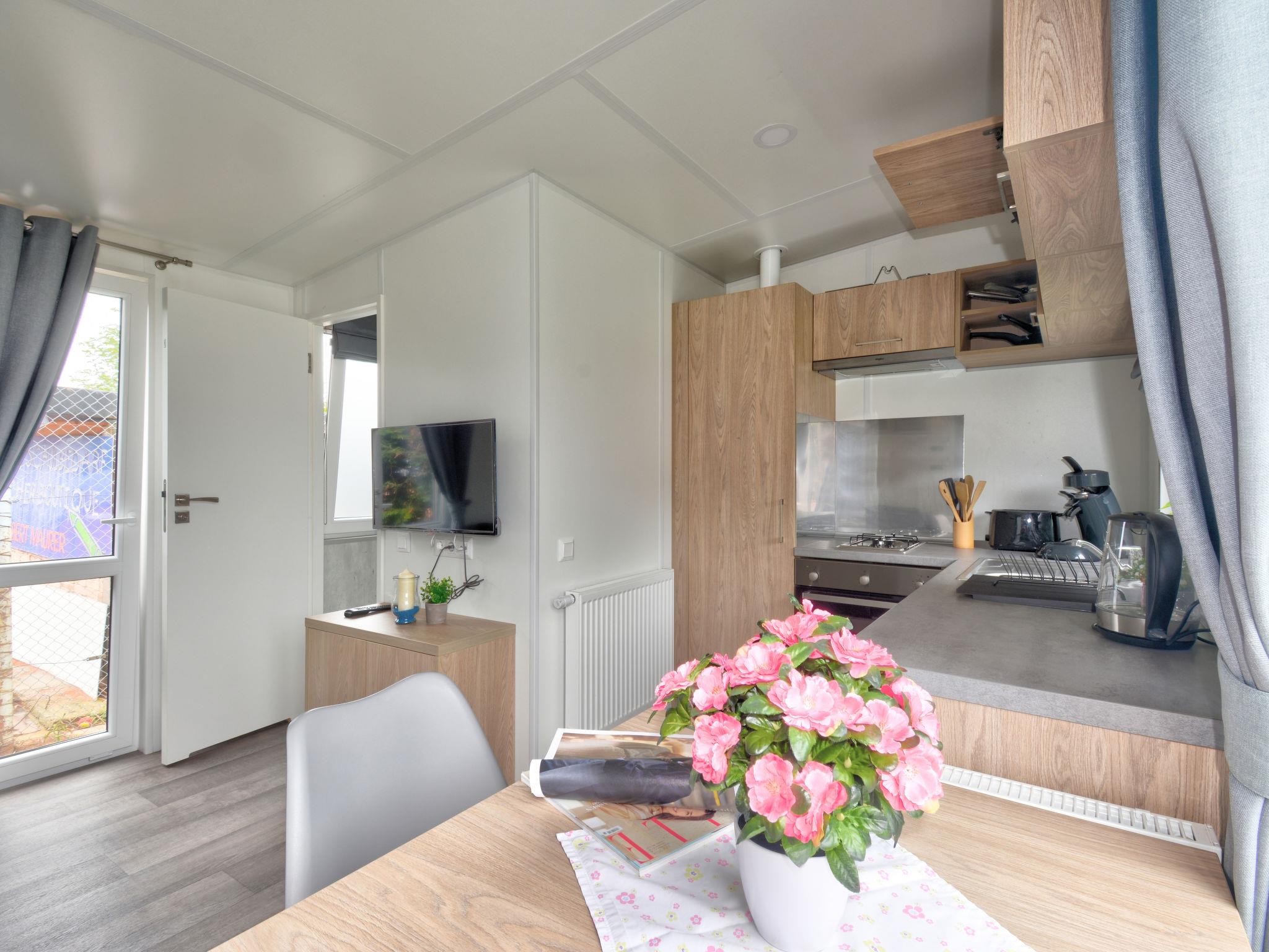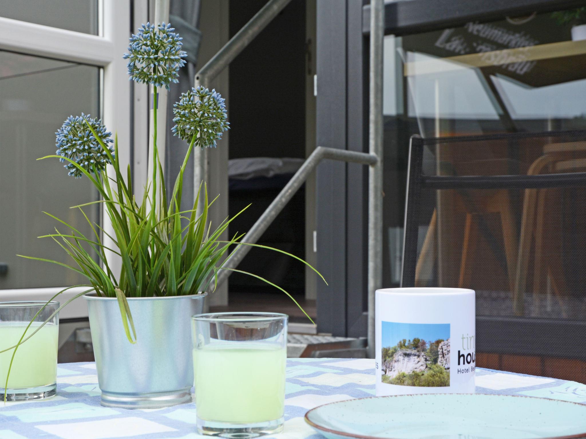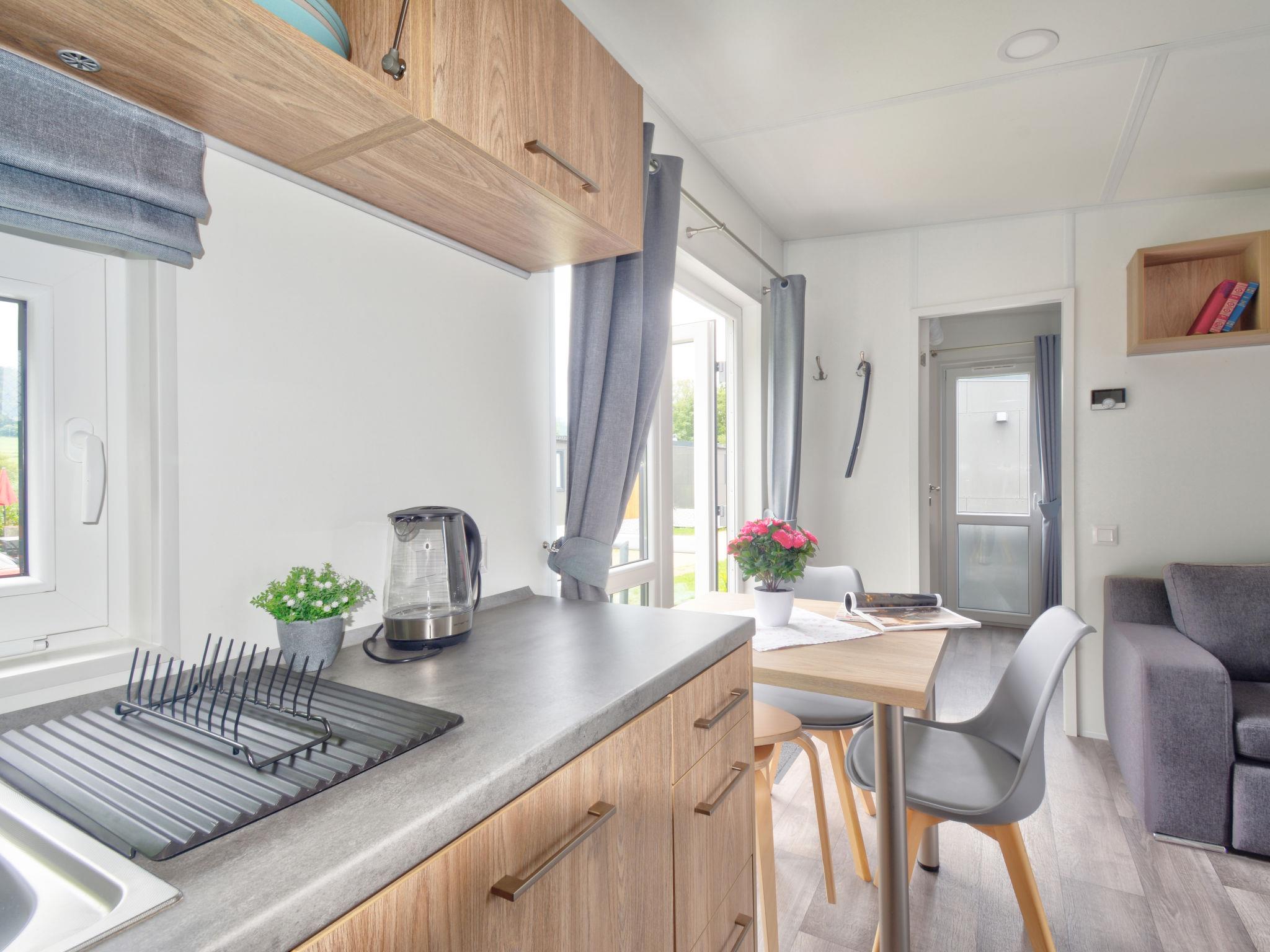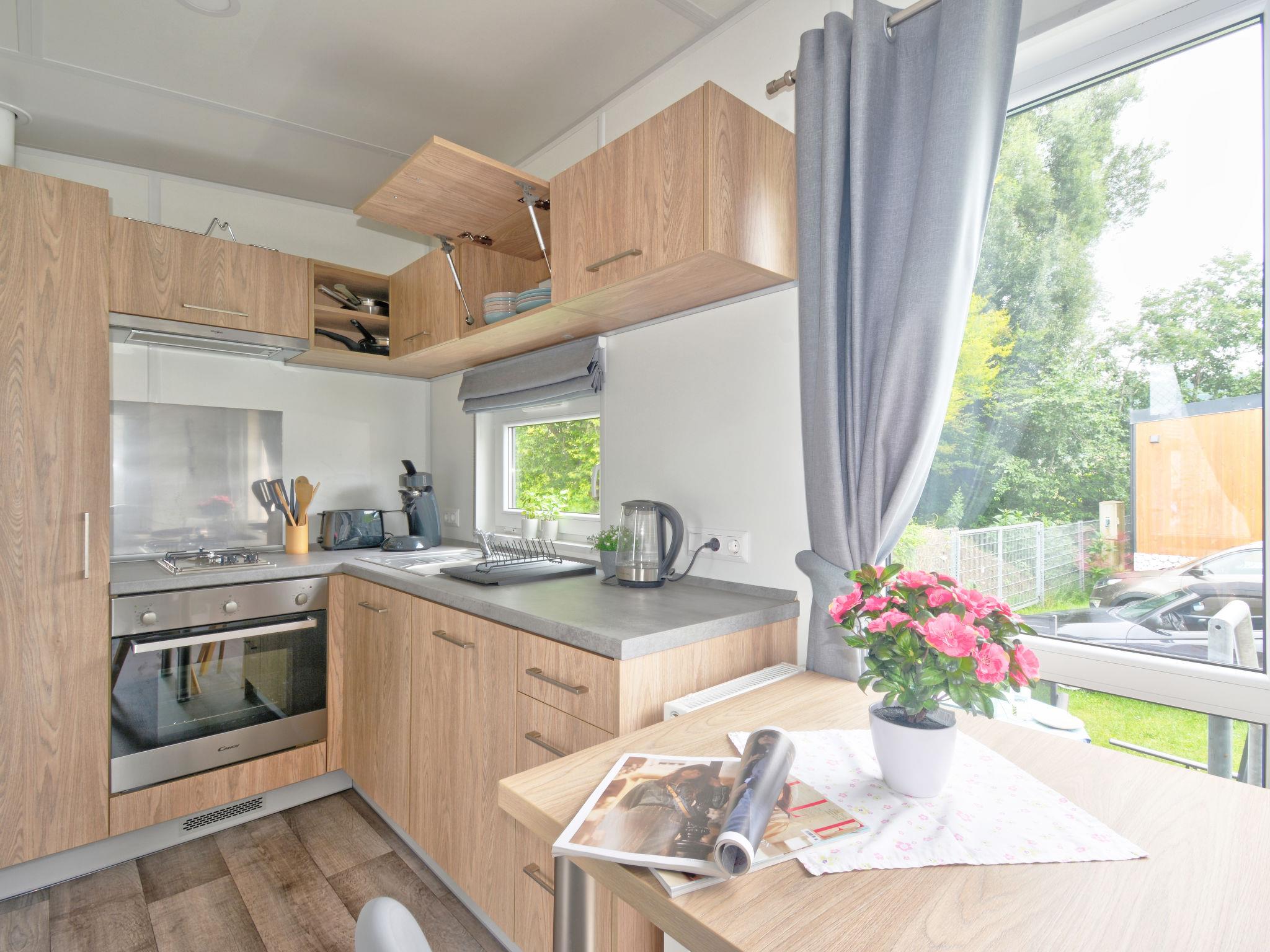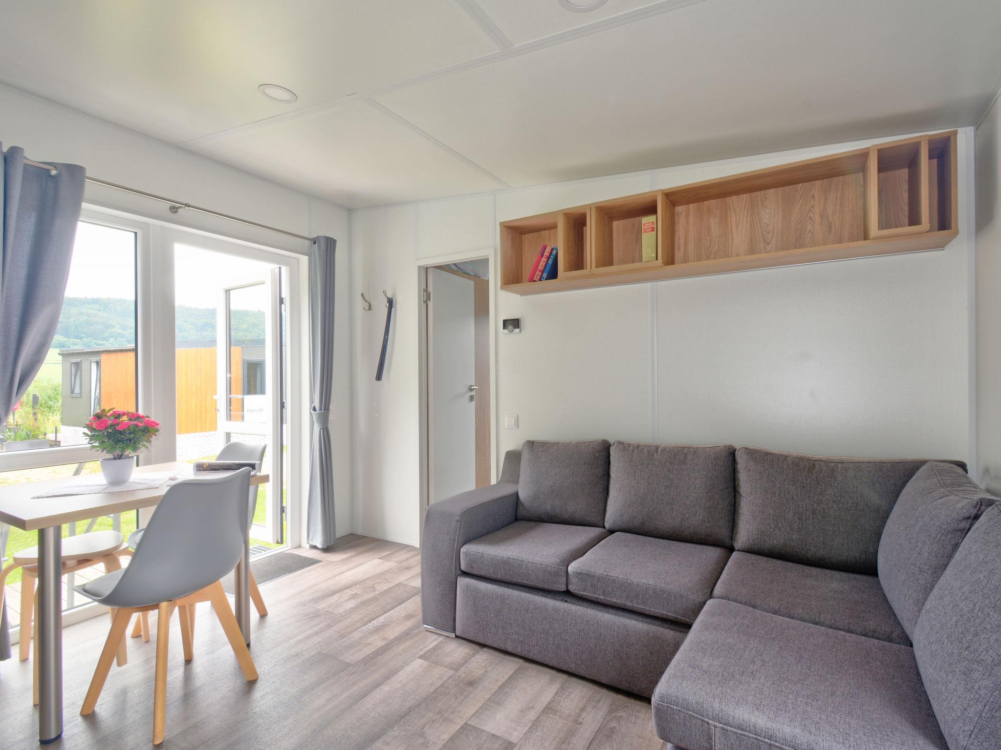 "Tiny Haus Carpe Diem", 2-room mobile home 25 m2, on the ground floor. Object suitable for 2 adults + 2 children. Cosy furnishings: living/sleeping room with 1 sofabed (120 cm, length 170 cm), dining table and satellite TV (flat screen). Exit to the terrace. 1 room with 1 french bed (140 cm, length 200 cm). Kitchenette (oven, Gas stove, 2 gas rings, kettle, electric coffee machine). Shower/WC. Gas heating. Terrace. Terrace furniture. Parking (1 car) at the house. Please note: non-smoking house. Smoke alarm.