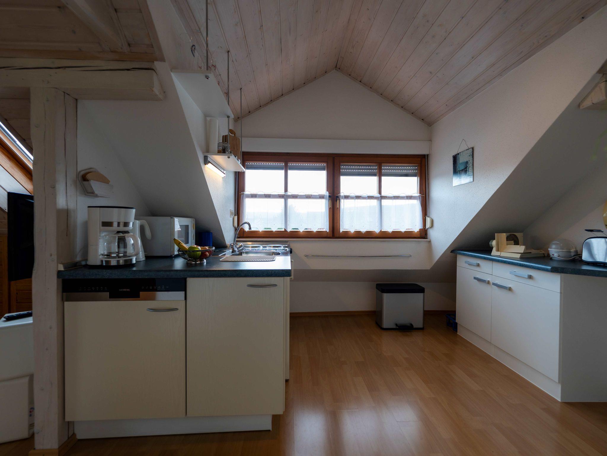 Die Küche ist für 2 Personen ausreichend eingerichtet und besitzt eine Mikrowelle mit Heißluft- und Grillfunktion, eine Brotschneidemaschine, einen Toaster, eine Kaffeemaschine, einen Wasserkocher und einen Eierkocher. Die kleine Küchenzeile verfügt über eine Edelstahlspüle und einen Herd mit 2 Kochstellen. Der Kühlschrank ist mit einem 3 Sterne Gefrierfach ausgestattet.