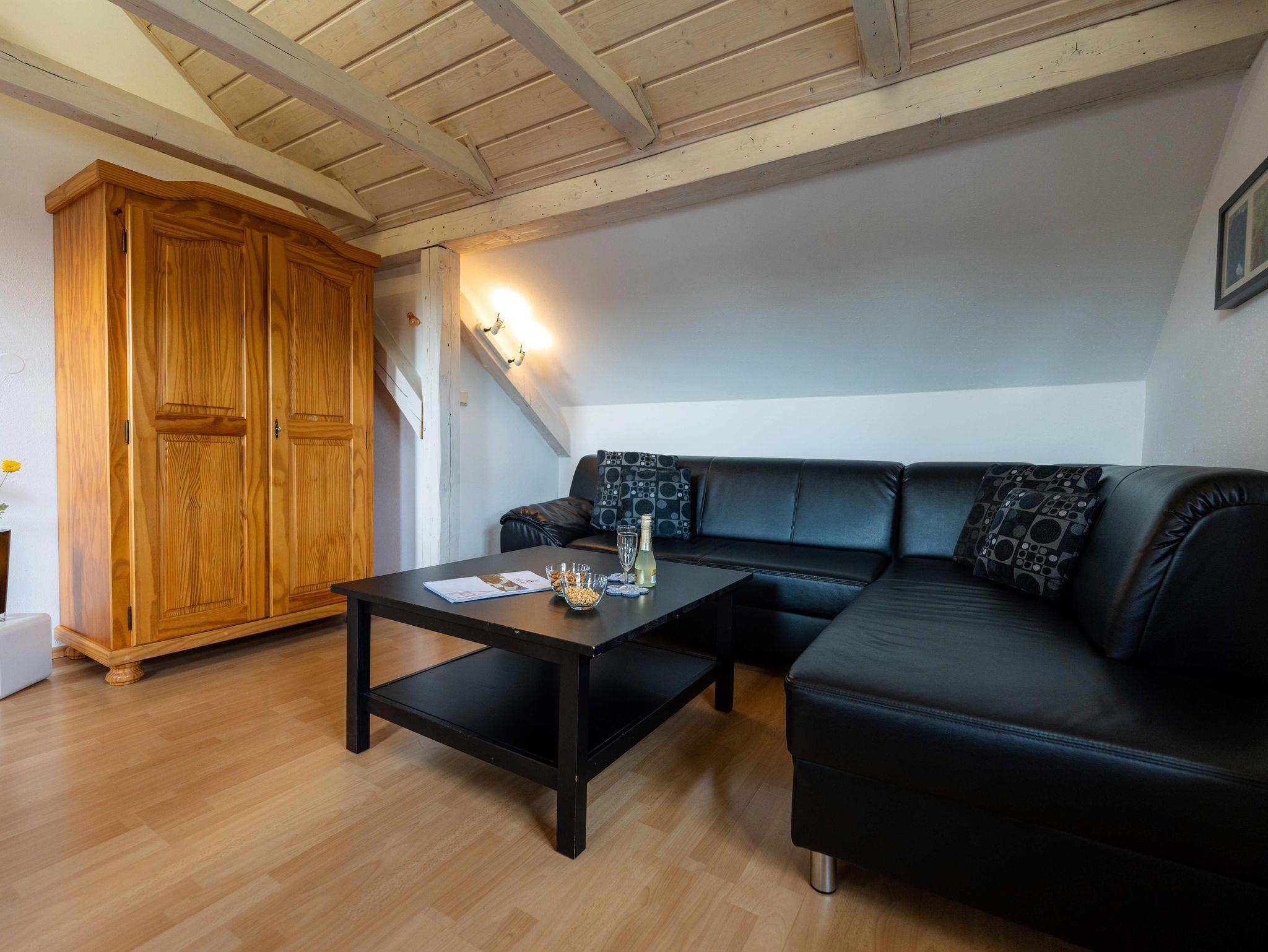Das helle, freundliche Wohnzimmer mit Essbereich ist mit einer modernen Ledercouch mit Schlaffunktion, einem Wohnzimmertisch und einem Schrank ausgestattet. Fernseher (SAT) ist ebenfalls vorhanden.