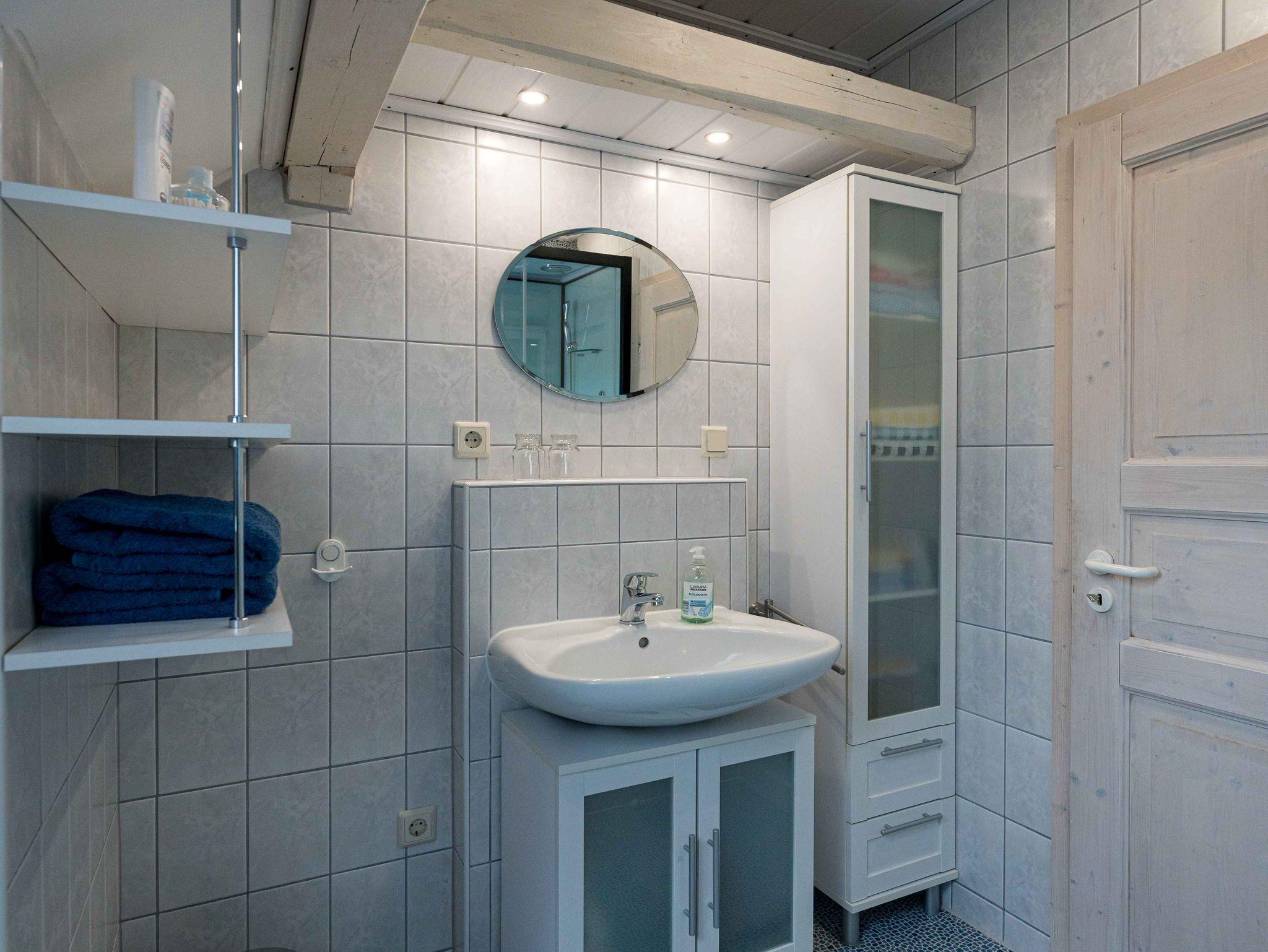 Ihr Badezimmer umfasst eine Dusche, WC und ein Waschbecken mit Unterschrank. Ebenso einen Hochschrank mit ausreichend Hand- und Badetücher, sowie ein Regal zur Ablage, einen Spiegel und einen Schubladenschrank . Zusätzlich ist es mit einem Sitzhocker, einem Fön, und einem Kosmetikspiegel ausgestattet.