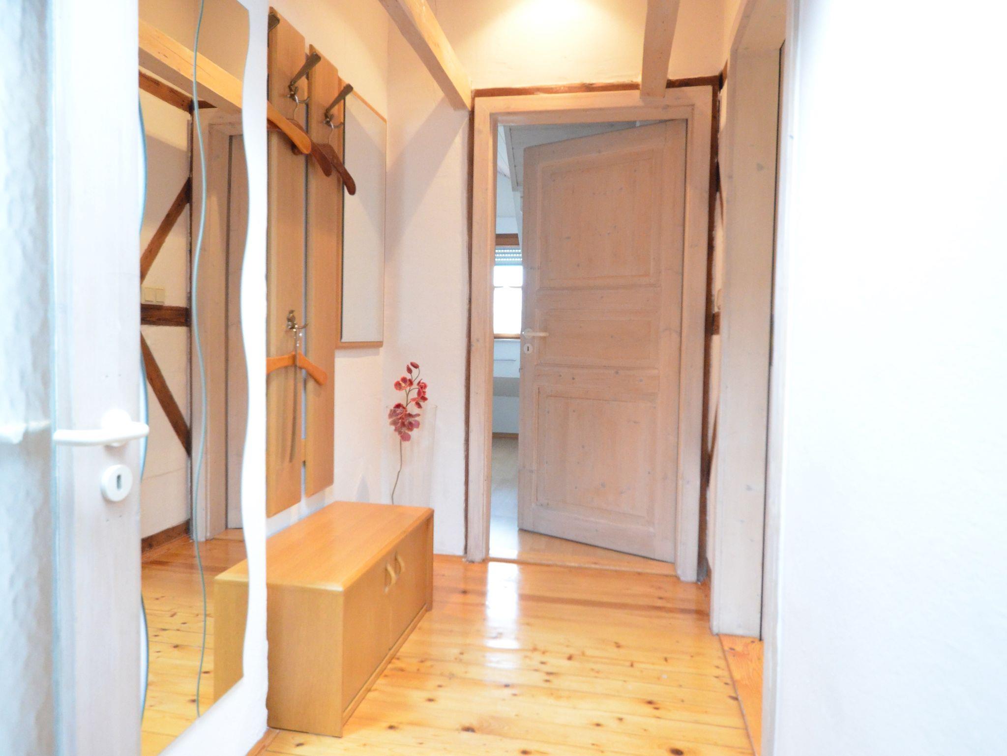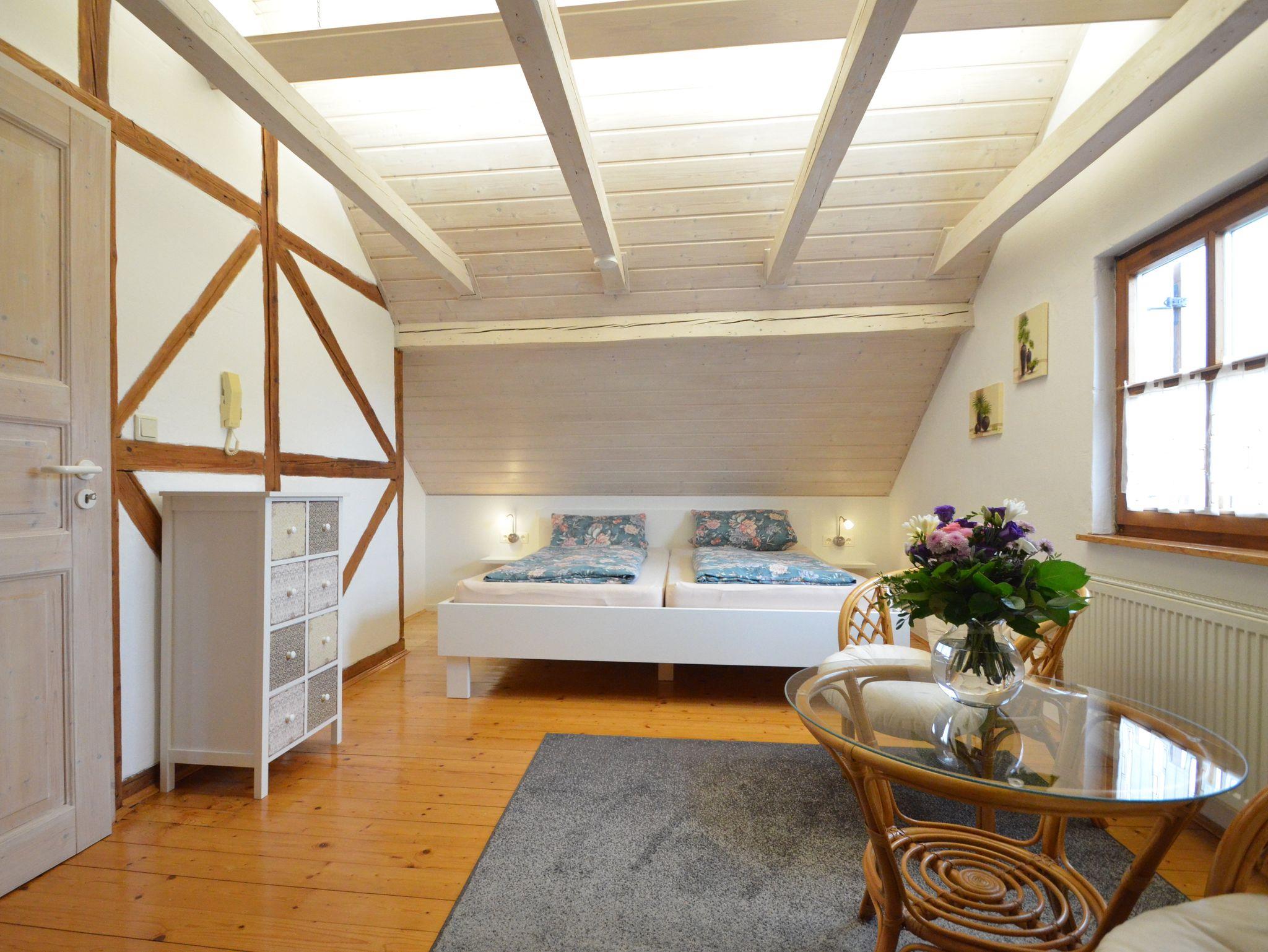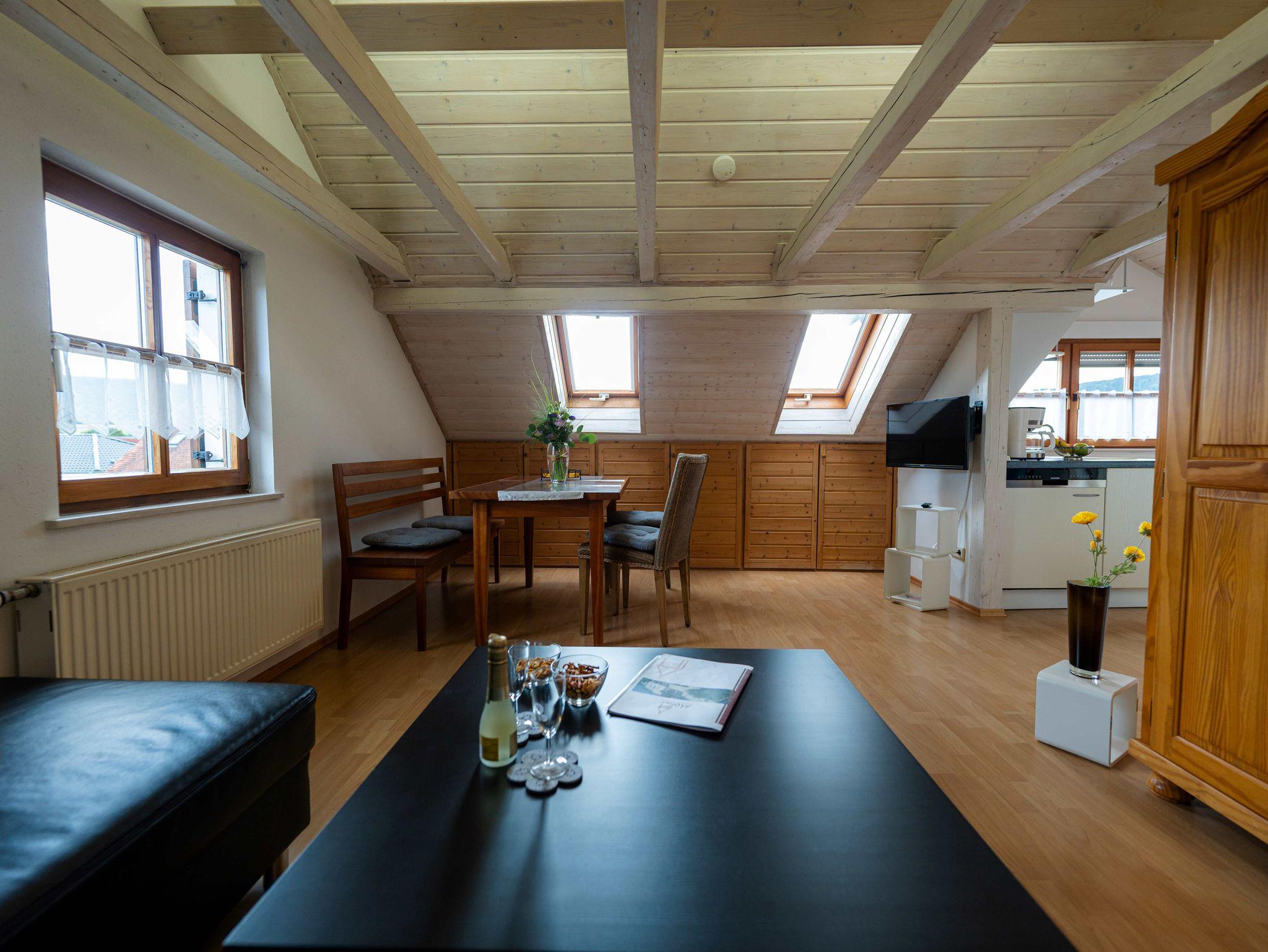 Unsere Dachgeschossferienwohnung mit herrlichem Ausblick auf Schloss Hirschberg und auf den Arzberg hat eine Wohnfläche von 70 m² und befindet sich im 2. Stock. Sie ist über ein eigenes Treppenhaus erreichbar und bietet ein großzügiges Platzangebot für 2 Personen. Durch die Dachschrägen und die sichtbare Balkenkonstruktion hat unsere Wohnung einen attraktiven Charakter. Aufgrund der vielen Fenster im Wohnbereich wird sie sehr hell und freundlich. Selbstverständlich können diese mit elektrischen Rollläden und Fensterläden ausreichend verdunkelt werden. Ca. 200 m zum Freibad, Nähe Radweg, 10 Gehmin. zur Stadtmitte.