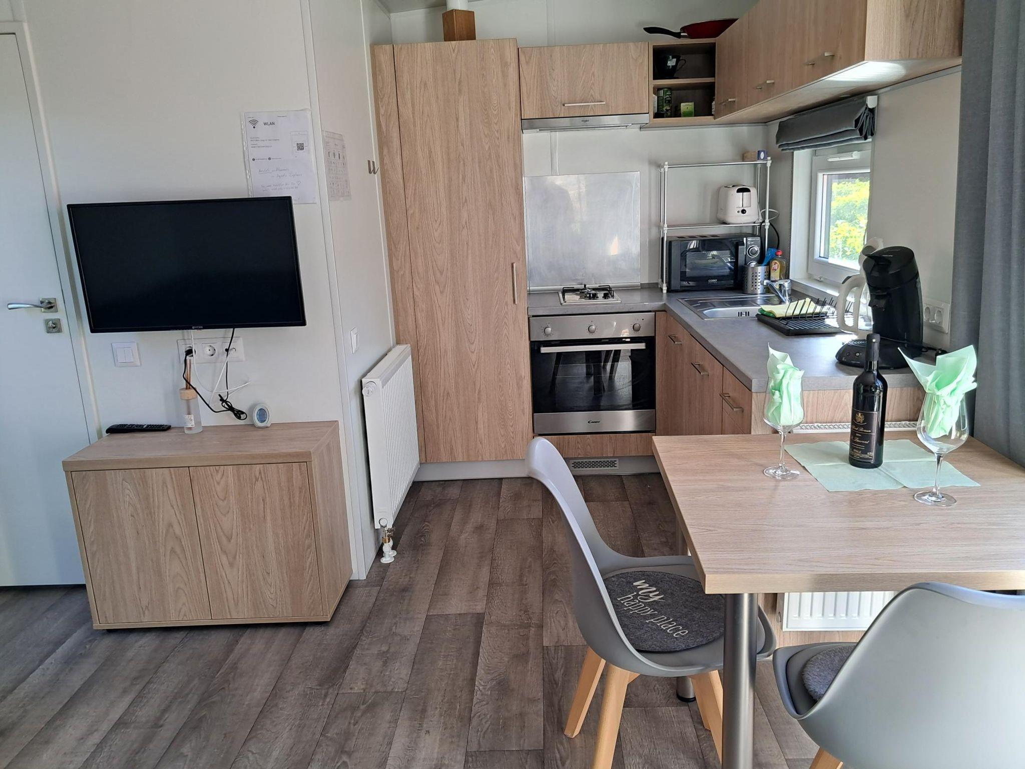 Unser Neues schönes Tinyhouse bietet Platz für 2 Erwachsene u. 2 Kinder. Das gemütliche Wohnzimmer mit Schlafsofa u. Flachbild TV lädt zum Verweilen ein. Die Küche ist komplett ausgestattet, mit Kühlschrank incl Gefrierfach, Gasherd mit Backofen, Microwelle, Wasserkocher, Toaster u. Kaffeemaschine