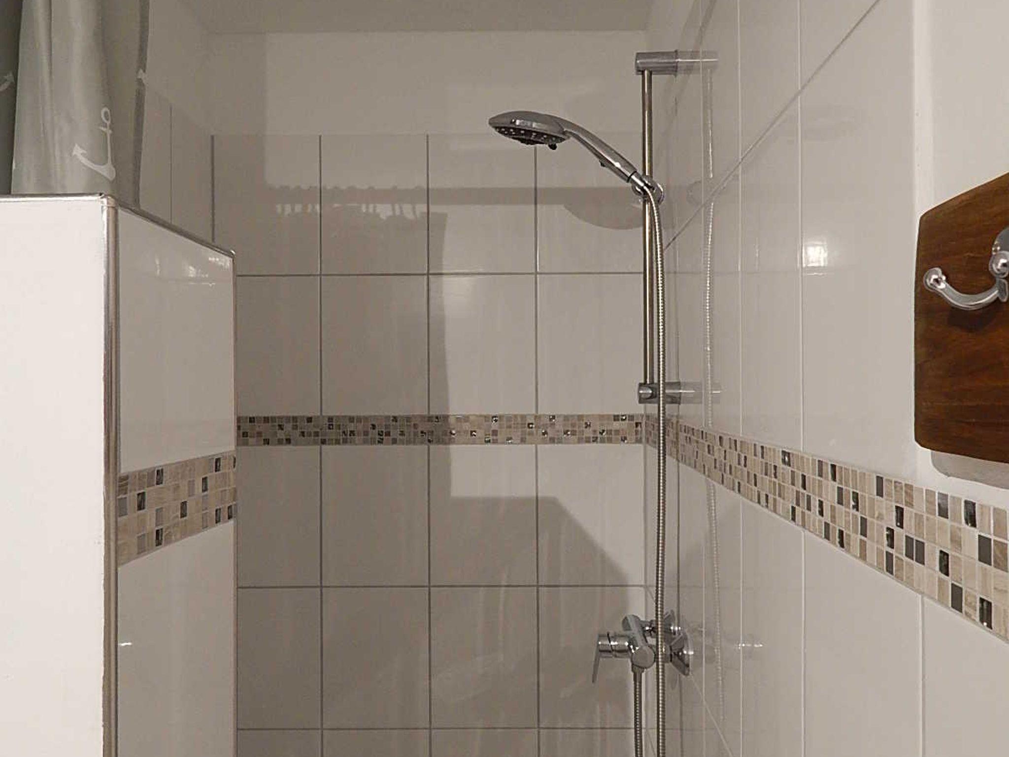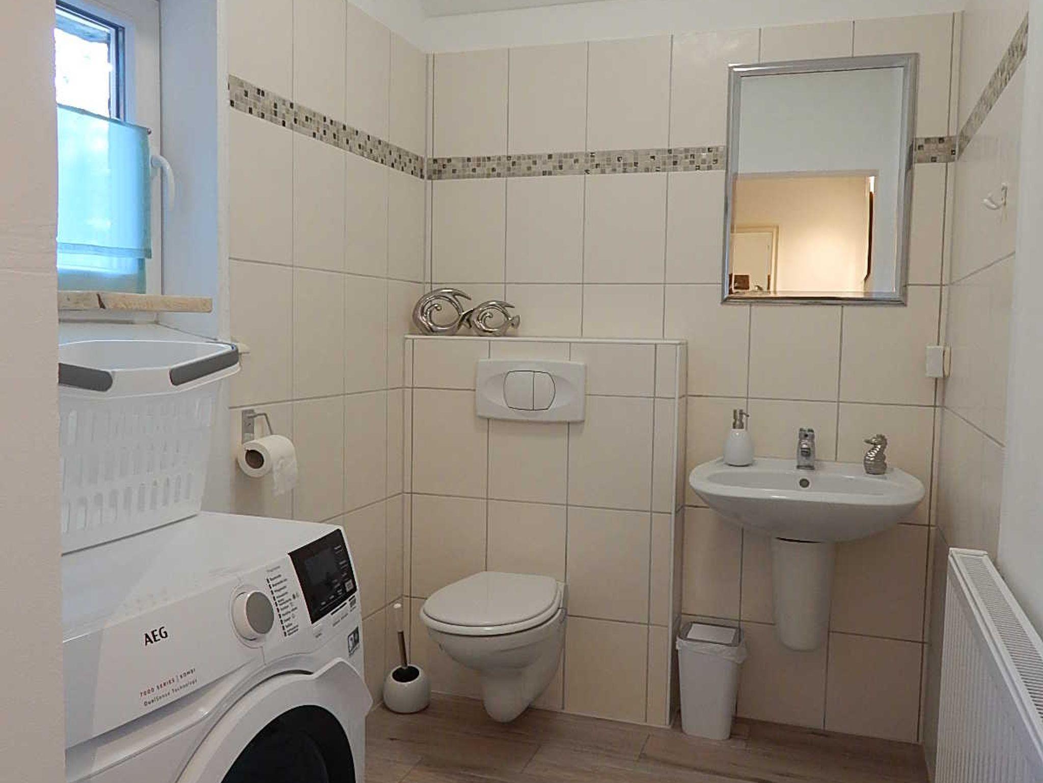 Im Untergeschoß befindet sich die großzügige Küche, ein Schlafzimmer mit einem Doppelbett von 180 x 200 und angrenzendem Badezimmer mit großer Dusche. Der Waschtrockner ist in diesem Badezimmer aufgestellt.