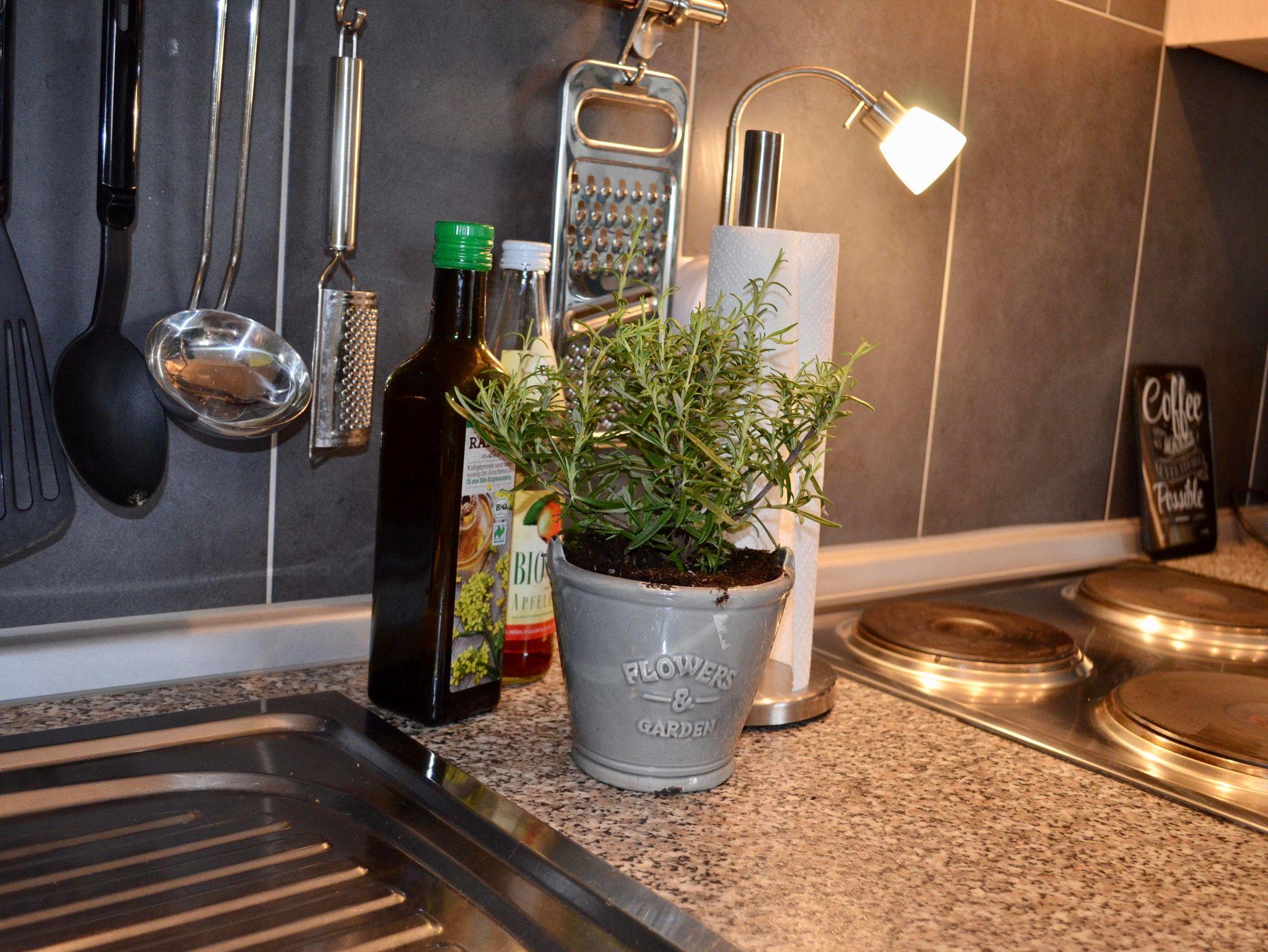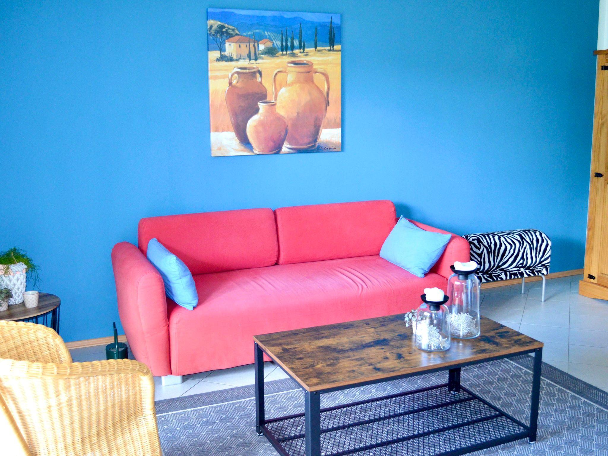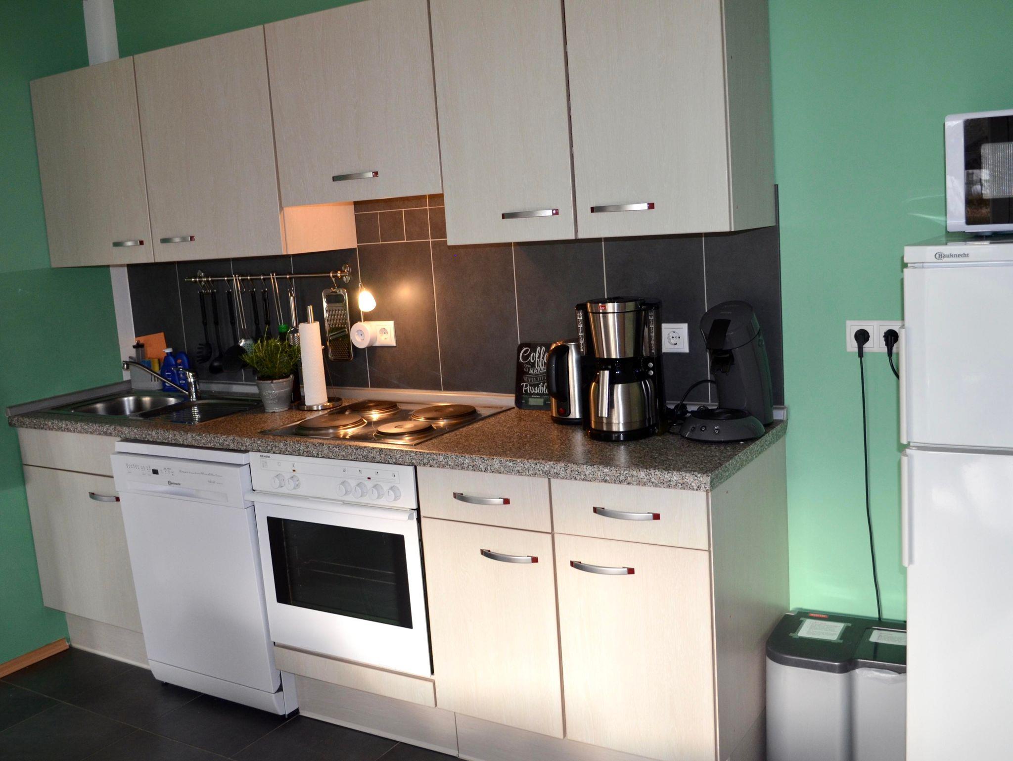 Schlafzimmer mit Doppelbett, 44 m² großer, lichtdurchfluteter Wohn-/Essbereich mit gemütlicher Schlafcouch und sehr umfangreich ausgestatteter Küche inkl. Spülmaschine. Bad mit Dusche, Wanne und Waschmaschine.