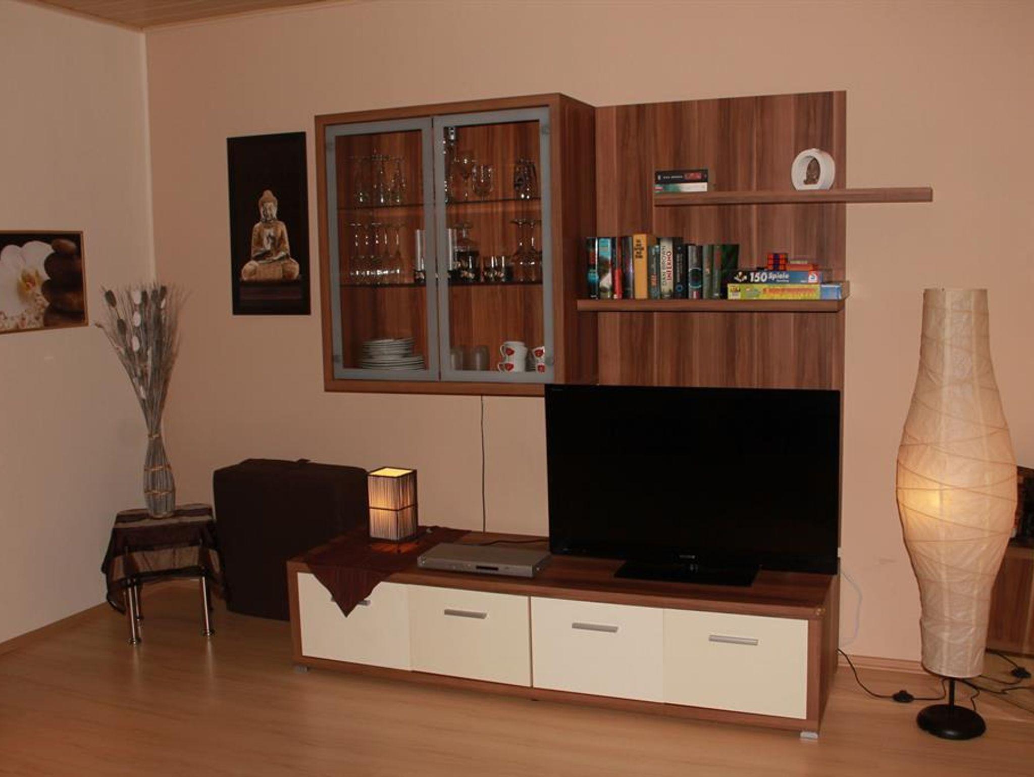 Das Wohnzimmer mit einem großen Flachbildfernseher und DVD-Player lädt zu gemütlichen Stunden ein. Die ausziehbare Schlafcouch bietet Platz für weitere Gäste.