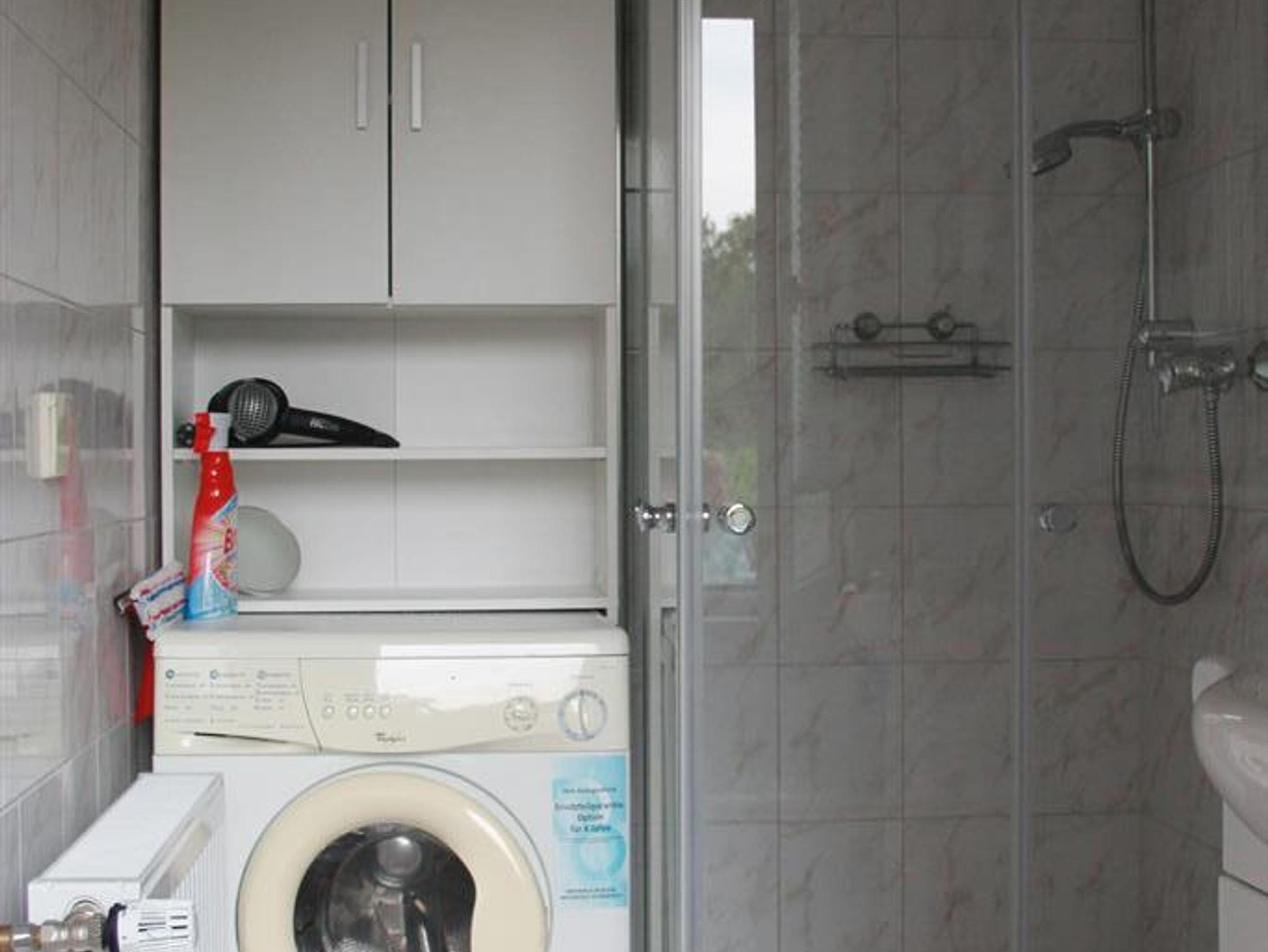Das Badezimmer verfügt über ein WC, Waschtisch, Dusche und Waschmaschine. Ebenso werden vor Ort ein Fön und Handtücher gestellt.