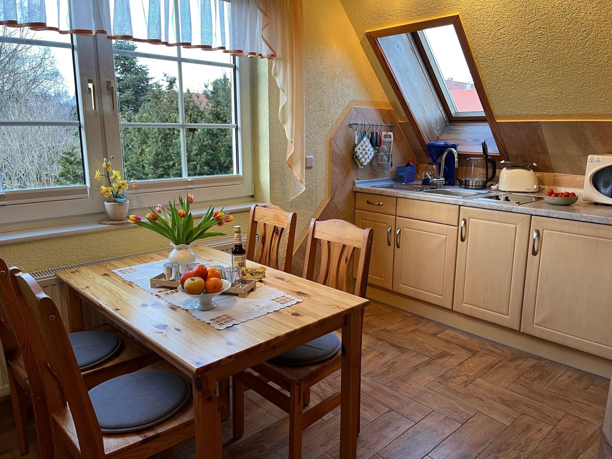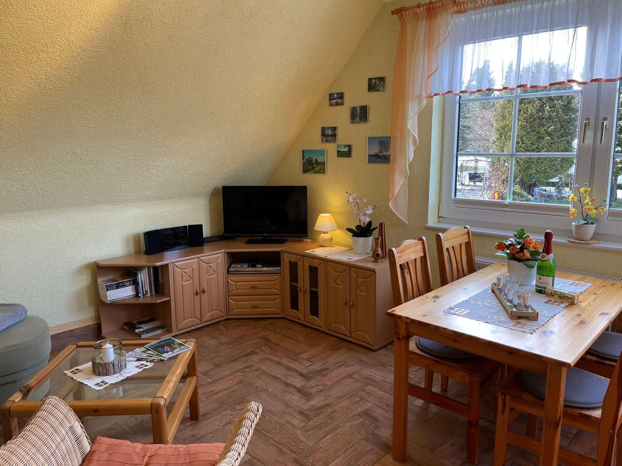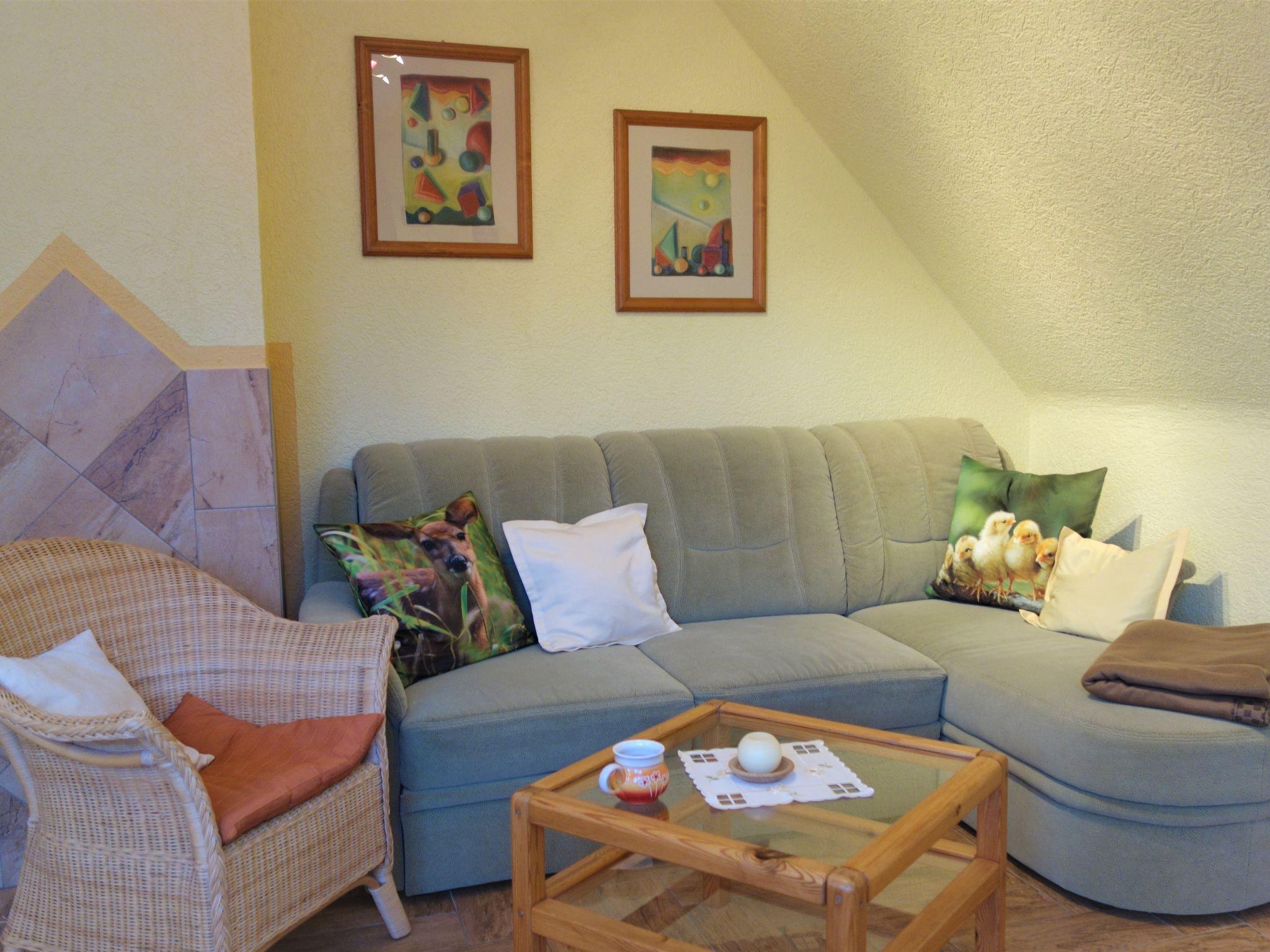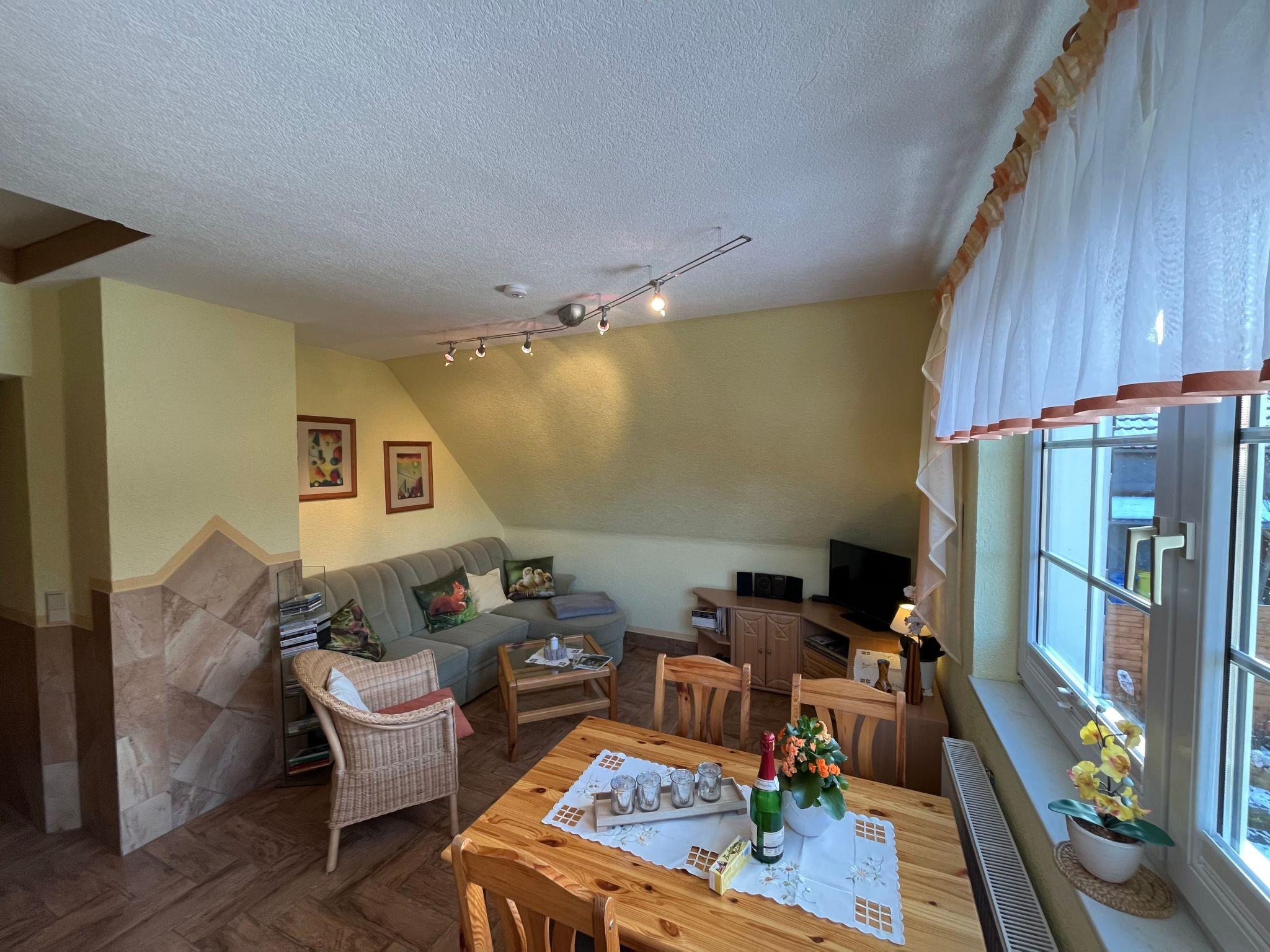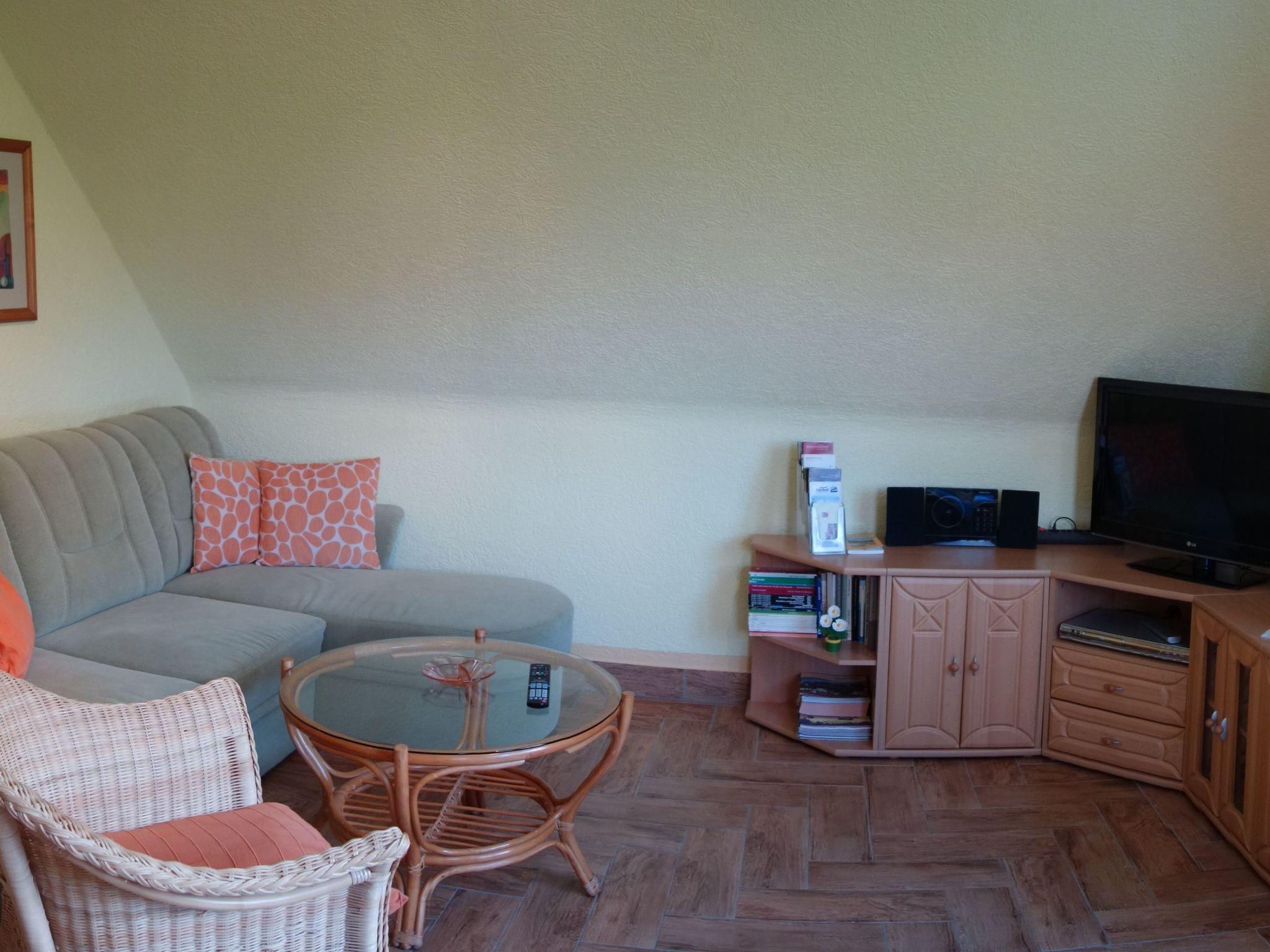 The interior of the holiday flat "Dorle" consists of 2 separate rooms on a living space of approx. 40 sqm on the 1st floor (attic). The cosy living area is furnished with a comfortable sofa set, satellite TV, radio, CD and DVD player. Adjacent is the dining area with a dining table and 4 chairs by the window with a view of the large garden and an open-plan kitchen with a skylight. The kitchen equipment includes a ceramic hob (2 hotplates), a fridge (with freezer compartment), coffee machine, toaster, kettle and microwave. Board games, books, CDs and DVDs provide entertainment on long evenings or rainy days. The bedroom has a comfortable double bed, ample storage space and a large south-facing window with a blackout blind. A daylight shower room completes the living area.