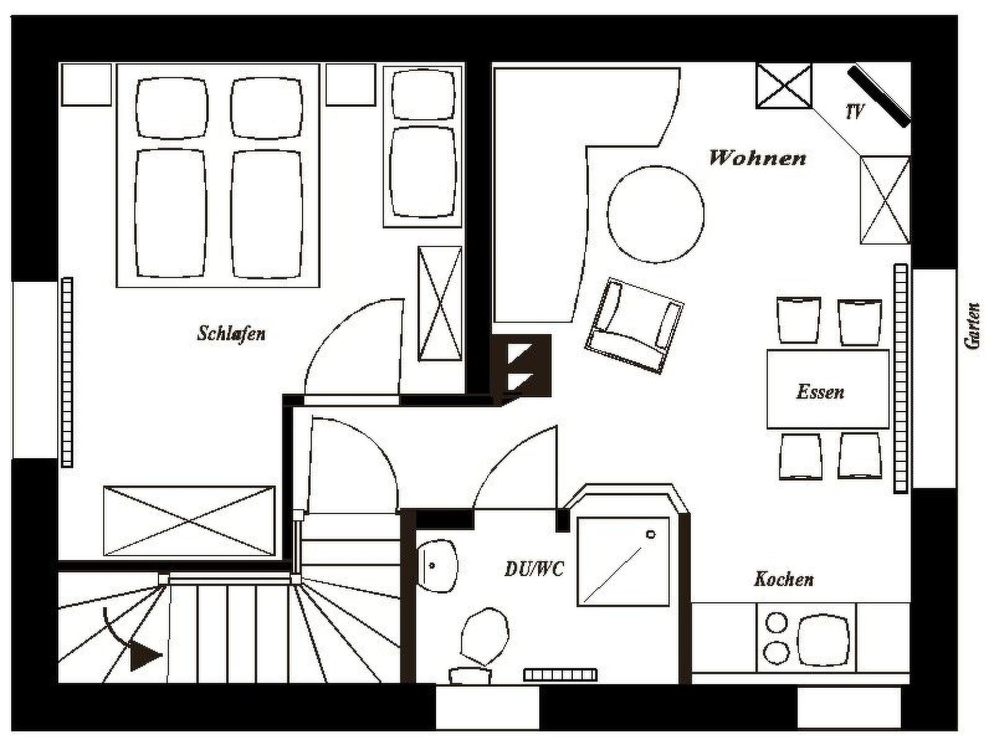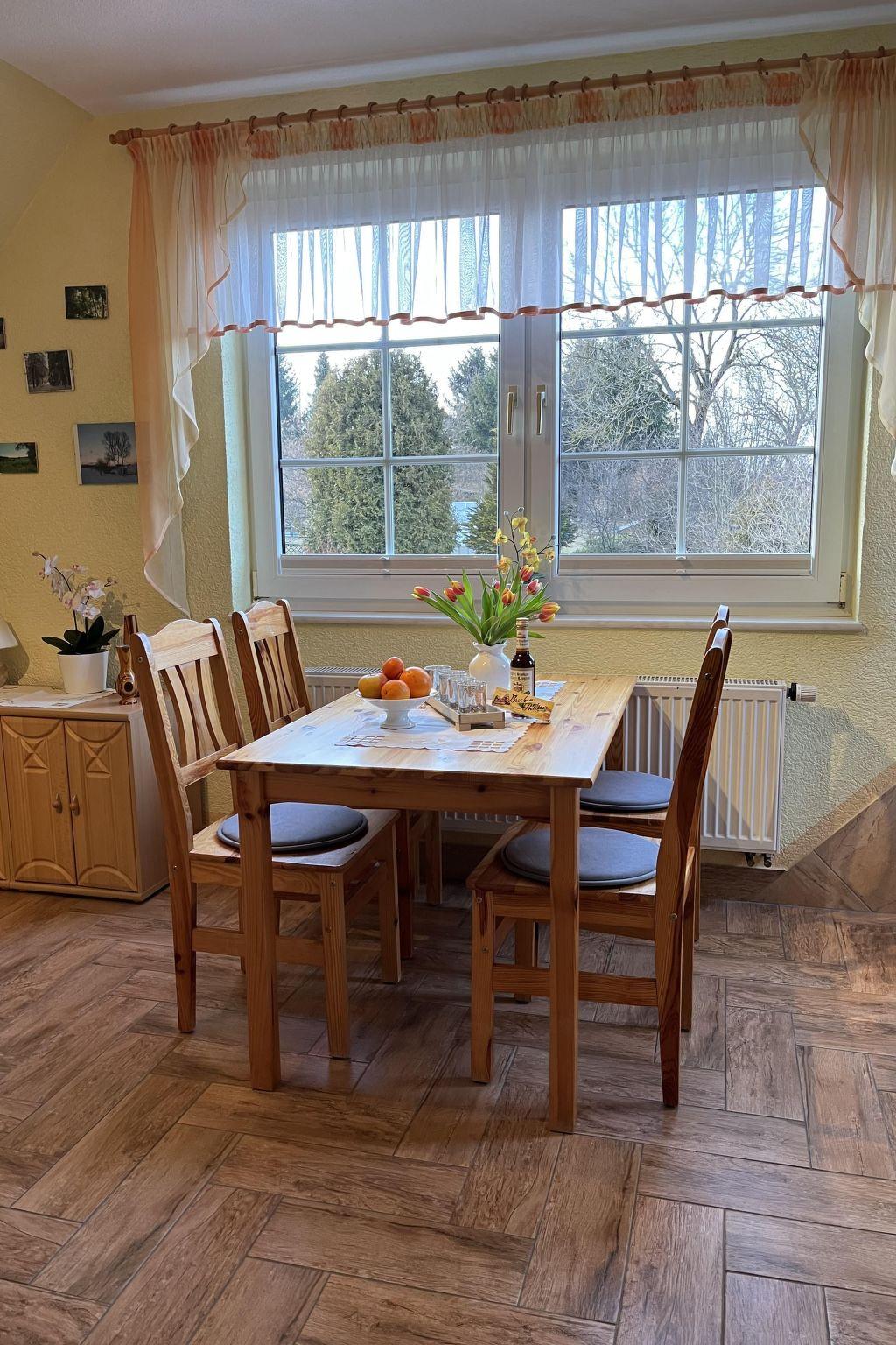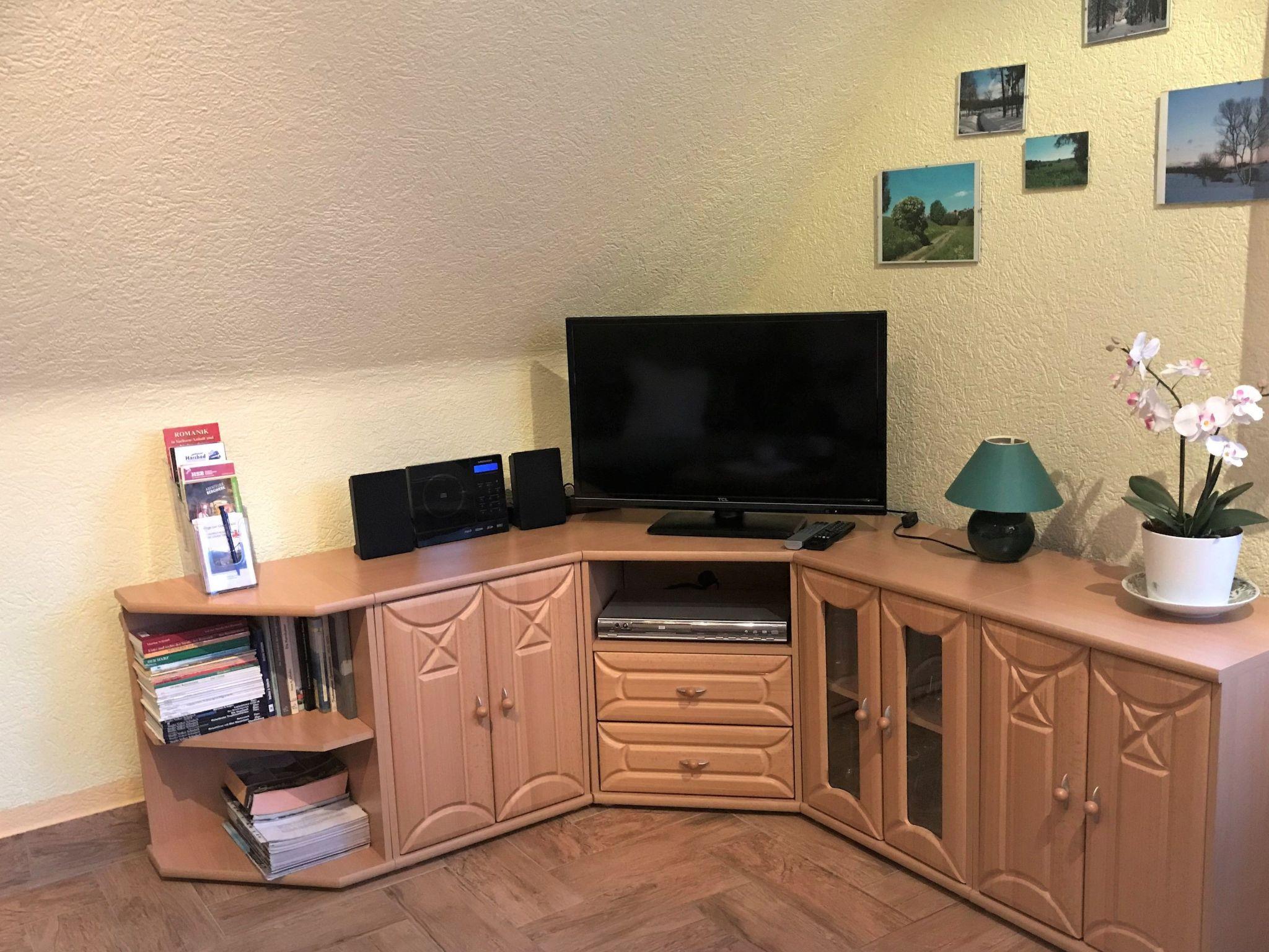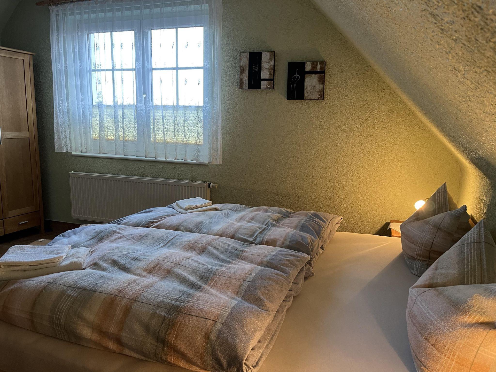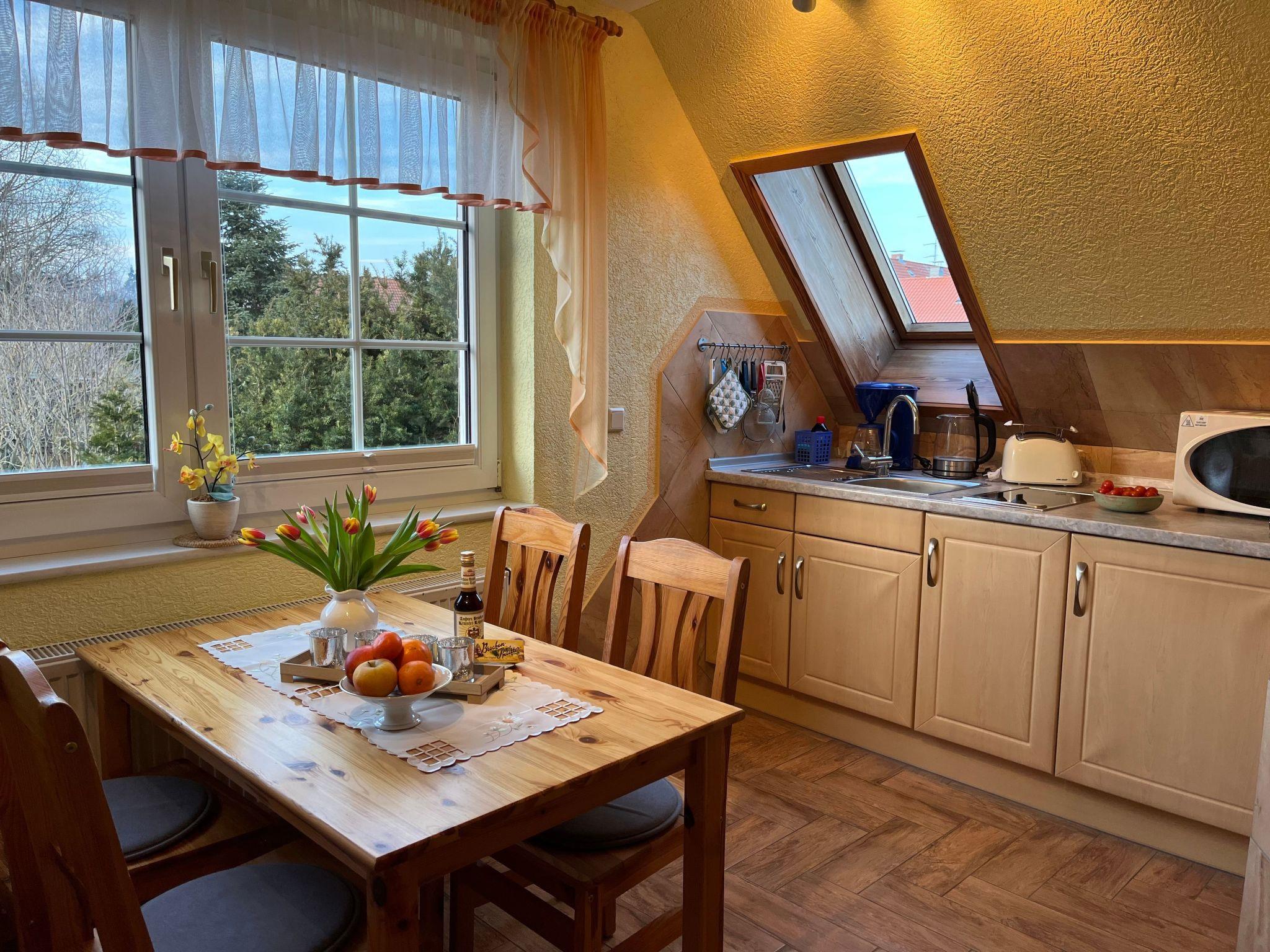 The interior of the holiday flat "Dorle" consists of 2 separate rooms on a living space of approx. 40 sqm on the 1st floor (attic). The cosy living area is furnished with a comfortable sofa set, satellite TV, radio, CD and DVD player. Adjacent is the dining area with a dining table and 4 chairs by the window with a view of the large garden and an open-plan kitchen with a skylight. The kitchen equipment includes a ceramic hob (2 hotplates), a fridge (with freezer compartment), coffee machine, toaster, kettle and microwave. Board games, books, CDs and DVDs provide entertainment on long evenings or rainy days. The bedroom has a comfortable double bed, ample storage space and a large south-facing window with a blackout blind. A daylight shower room completes the living area.
