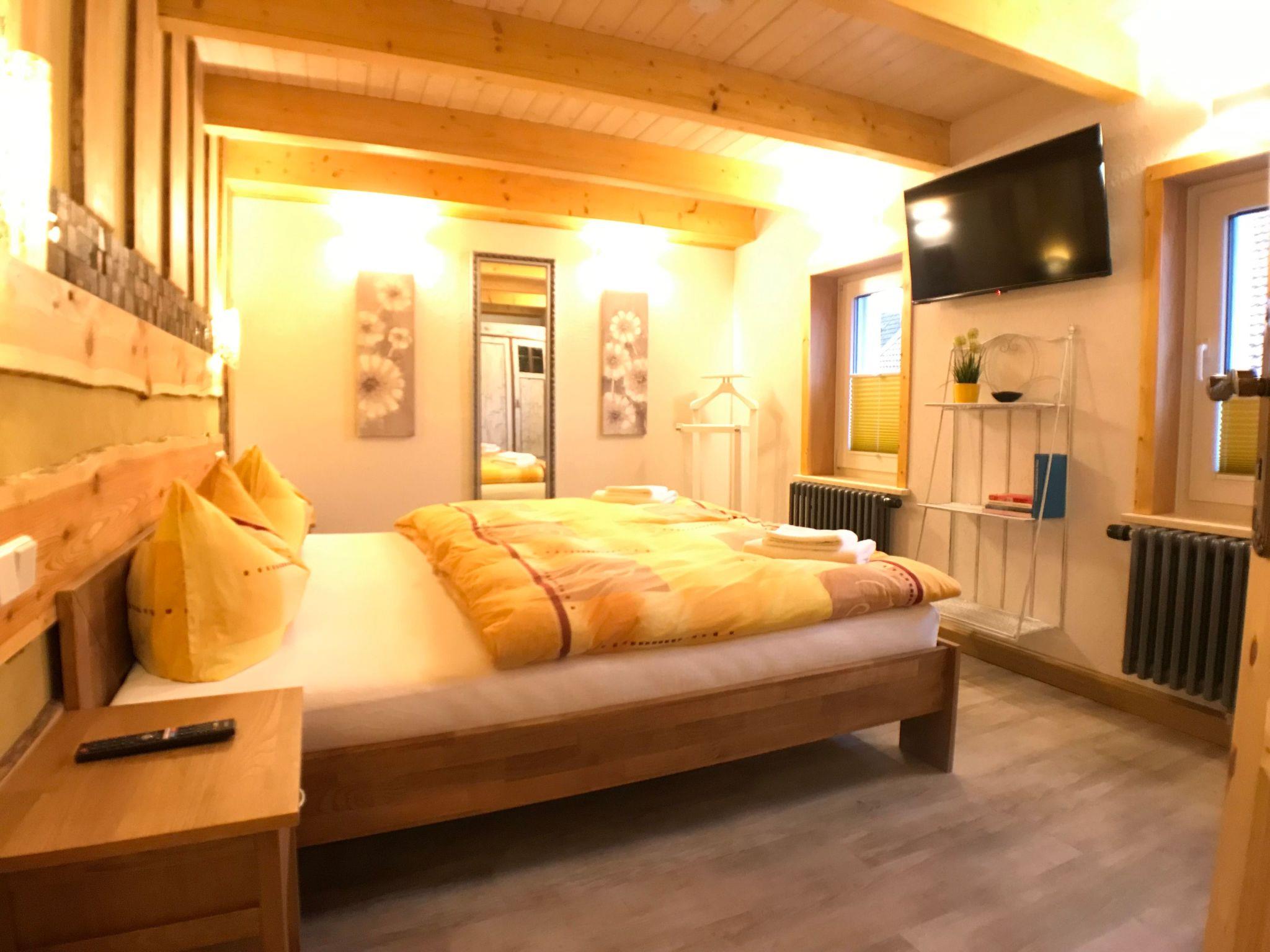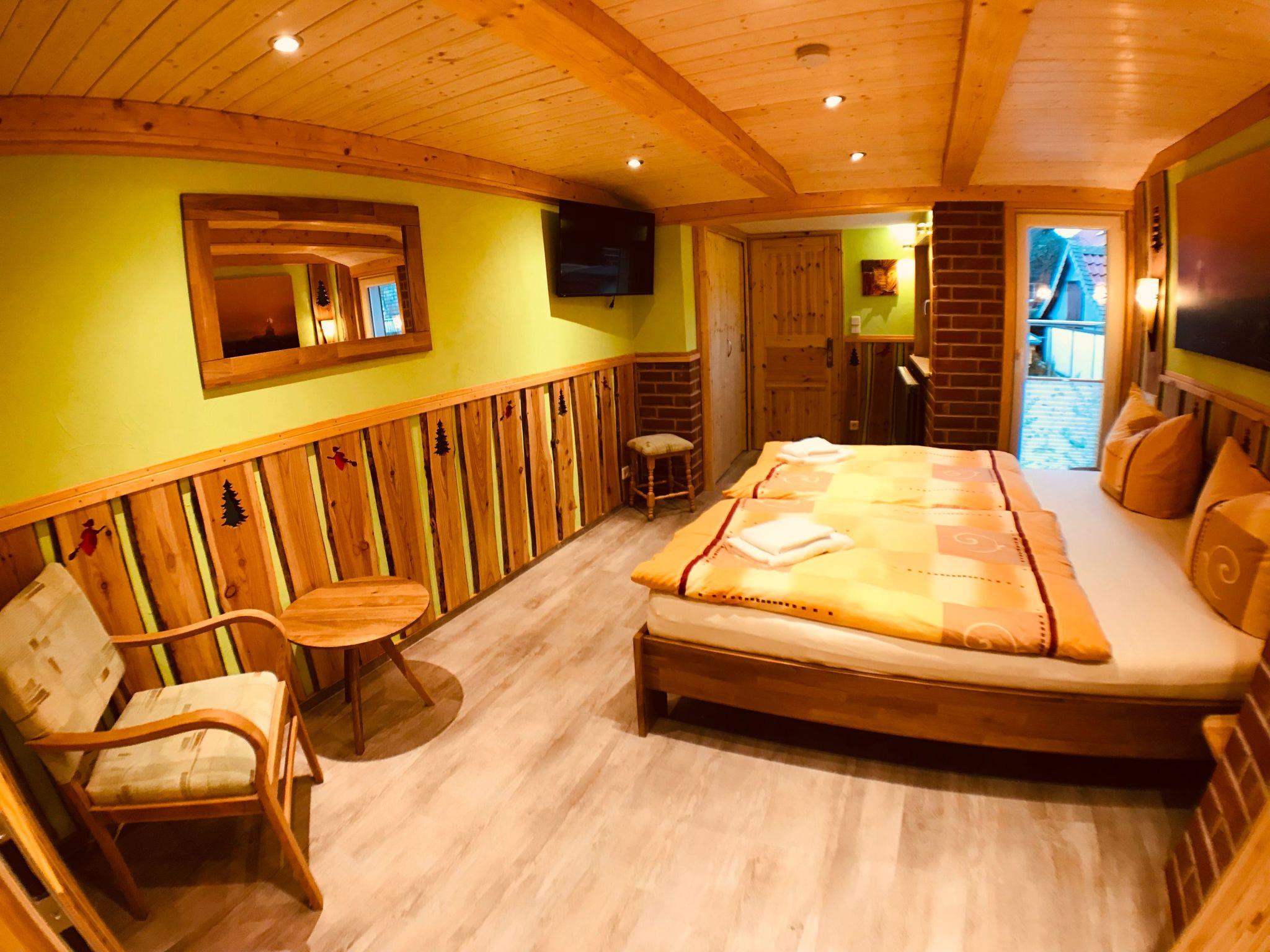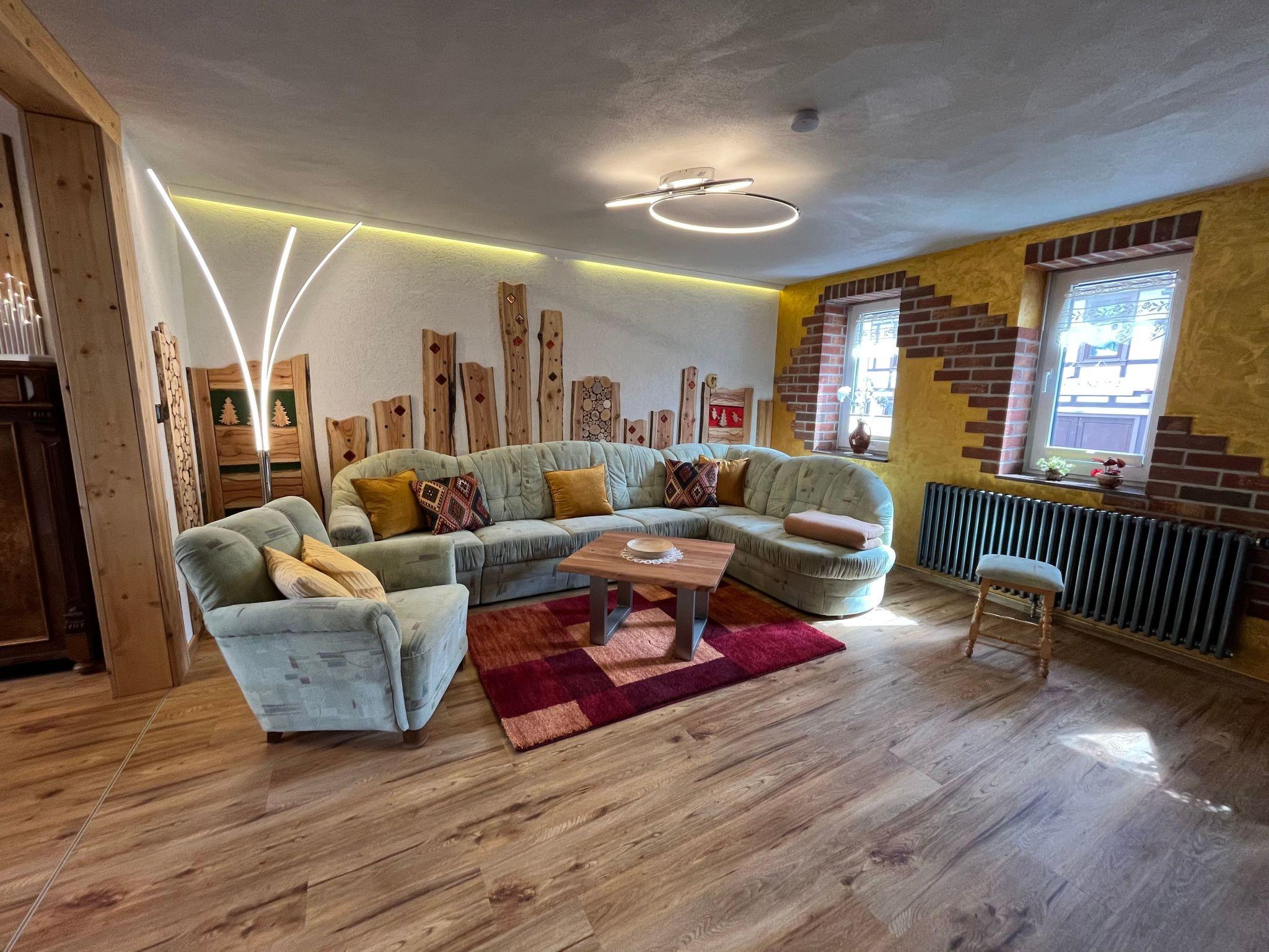 There is only this one holiday flat in the house, so you will not be disturbed by any other guests and can use the house and property for yourself. The holiday flat has two floors. On the ground floor there is a living room, dining room, kitchen, shower/WC and hallway. The living and dining areas are open to the kitchen. The living room facing south or the street is dominated by a cosy sitting area with a couch, armchair and small table, the area is completed with satellite TV, radio and playback facilities for CDs and DVDs and a wood-burning stove, which is appreciated by guests in the winter months for cosy evenings. CDs, DVDs, books, board games and information material on the sights of the Harz are a welcome change on relaxing evenings, a rainy day or to get you in the mood for the next day of your holiday. A large dining table with comfortable chairs and a dining bench for 6 people and a restored vertico are located in the dining room, which is situated between the living room and kitchen. The open-plan kitchen includes a spacious kitchenette with a 4-burner ceramic hob and sink, as well as a fridge with freezer compartments, a microwave with baking function, dishwasher, coffee machine, toaster and kettle. Of course, you will also find plenty of crockery, glasses, cutlery, pots and pans, as well as tea towels and additional storage space for your food. On this level you will also find one of 3 bathrooms, which is equipped with a shower, washbasin, toilet and washing machine. Through the hallway you reach the upper floor (1st floor) via an equally new staircase. There are 3 bedrooms here. As this is a very old house, it was unfortunately not possible to raise all the ceilings as part of the refurbishment, so the ceiling heights vary between 2.00 m and 2.30 m. One bedroom is located on the south or street side and is furnished with a double bed (180 x 200), bedside cabinet and a 3-door wardrobe with built-in safe. A further bedroom with double bed (180 x 200) and 2-door wardrobe with built-in wardrobe safe, armchair and small table is located on the north or courtyard side. This bedroom has a separate bathroom with WC and washbasin. The third bedroom has two single beds and a small wardrobe. On this floor there is another bathroom with shower, toilet and washbasin, so that there are 2 showers and 3 toilets in the whole house. In the hallway there is another chest of drawers for your personal belongings and a small cupboard safe. There is satellite TV and WLAN in all three bedrooms.