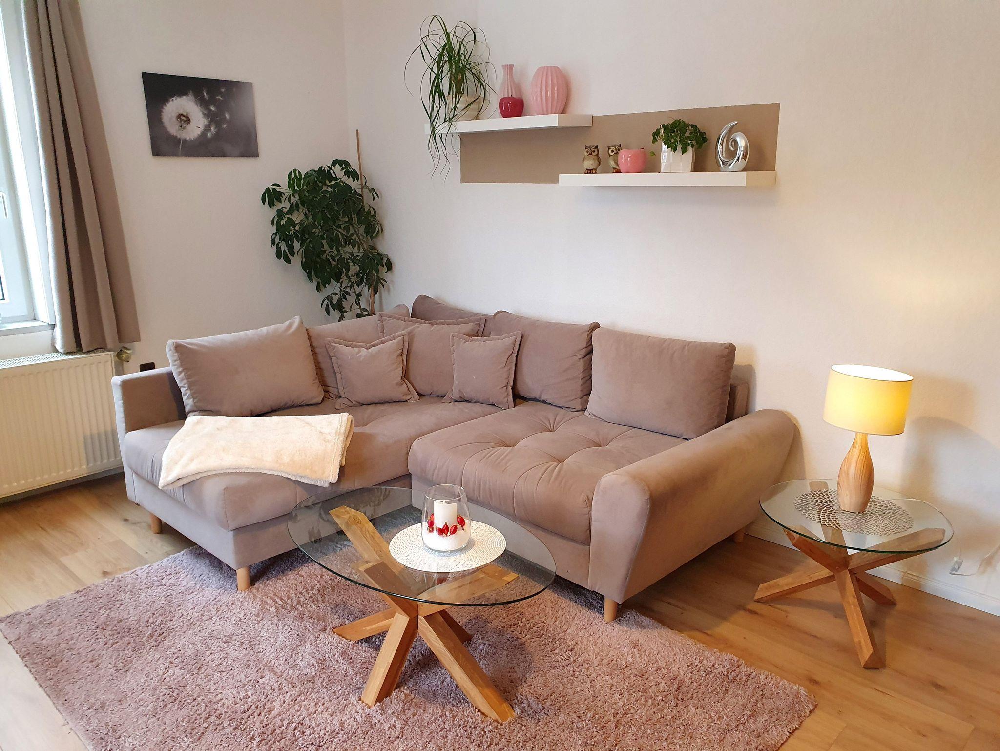 Zusätzlich zu der Größe von 80 m² zählt auch ein großer Balkon, welcher an das große Wohnzimmer mit Couch, Sat TV und offener Küche angrenzt.