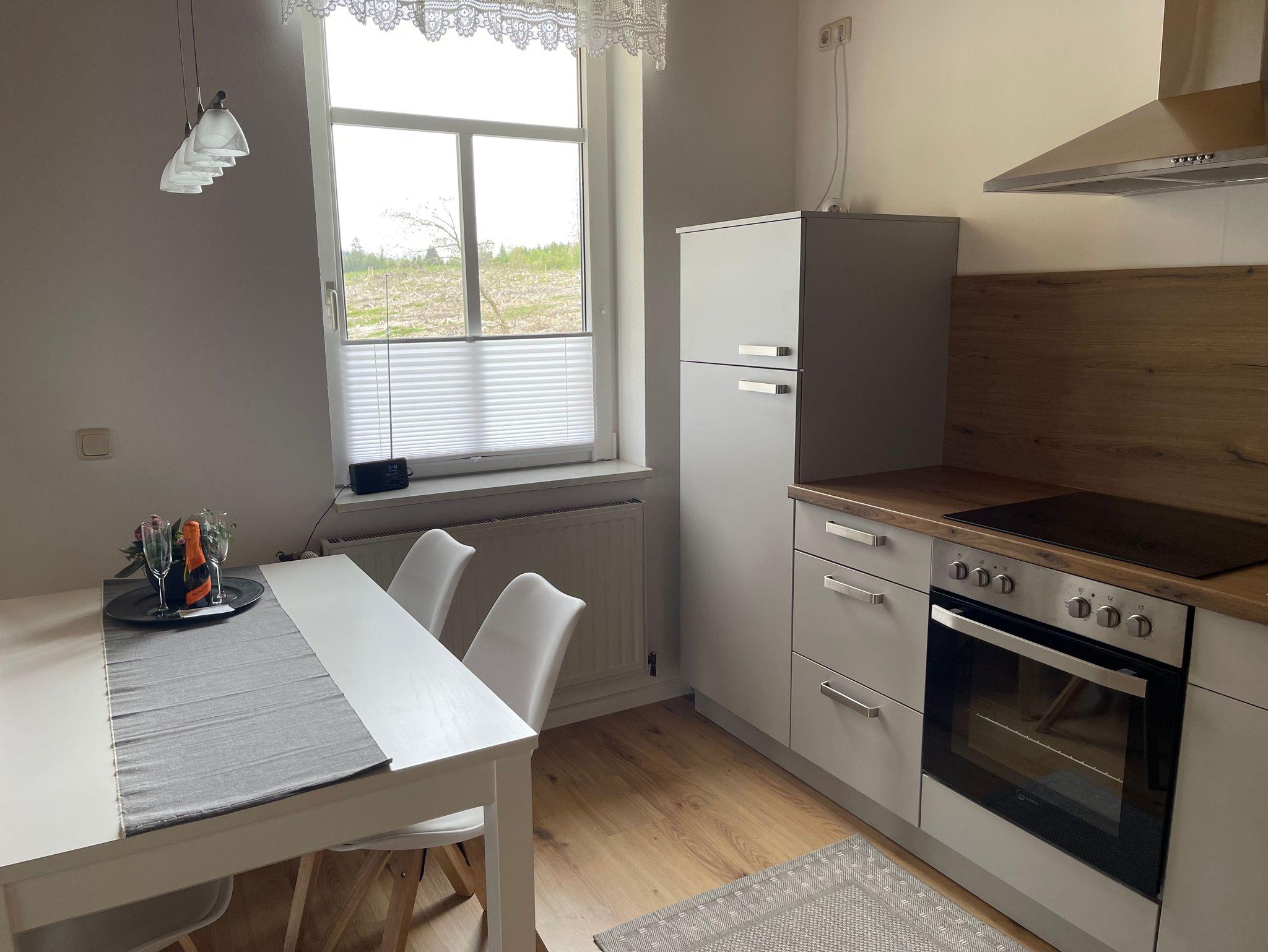Ein toller Ausblick in die Natur erwartet Sie in der Einbauküche , die mit einem vier Plattenherd, einer Mikrowelle und einem Esstisch ausgestattet ist.