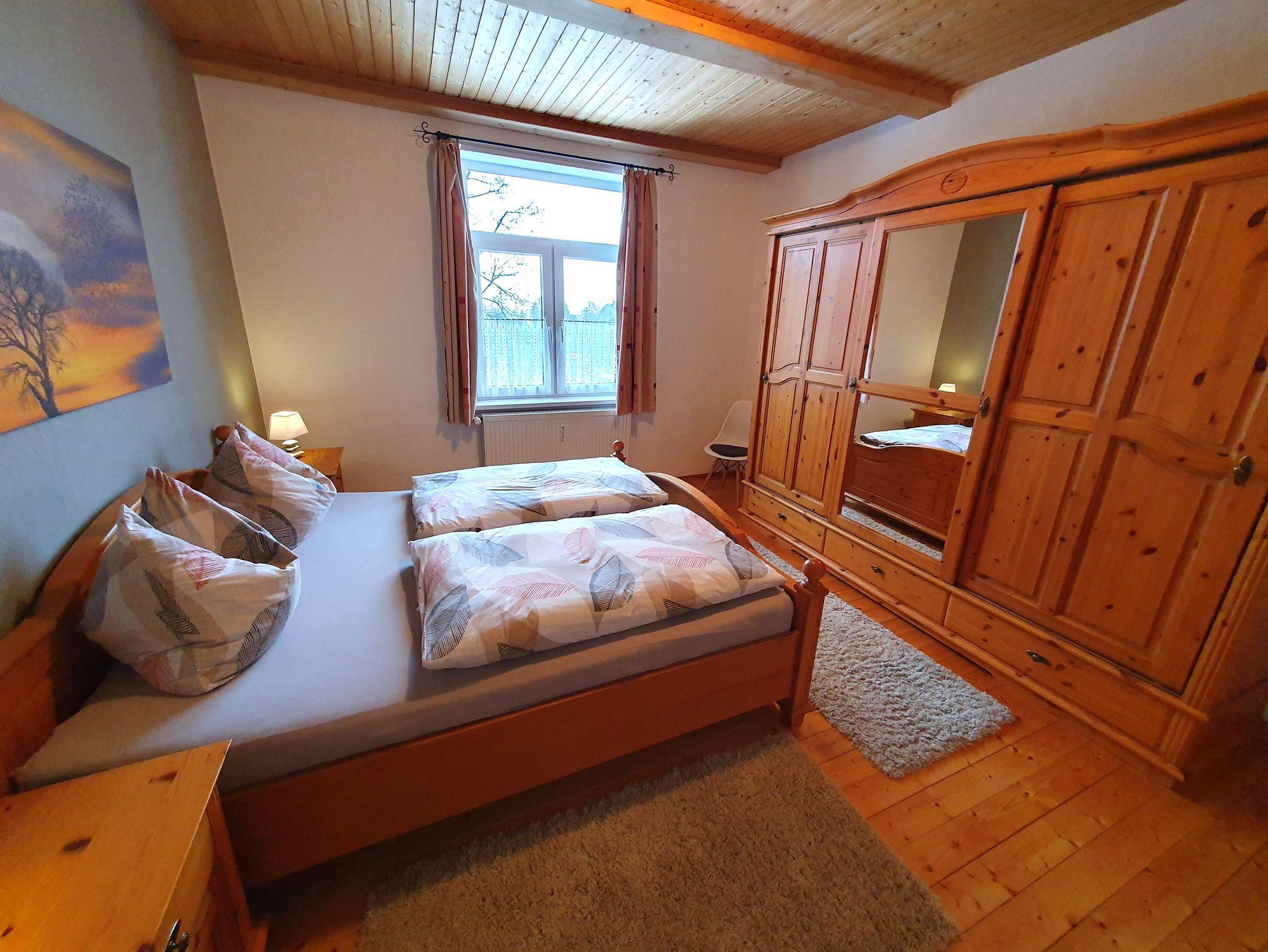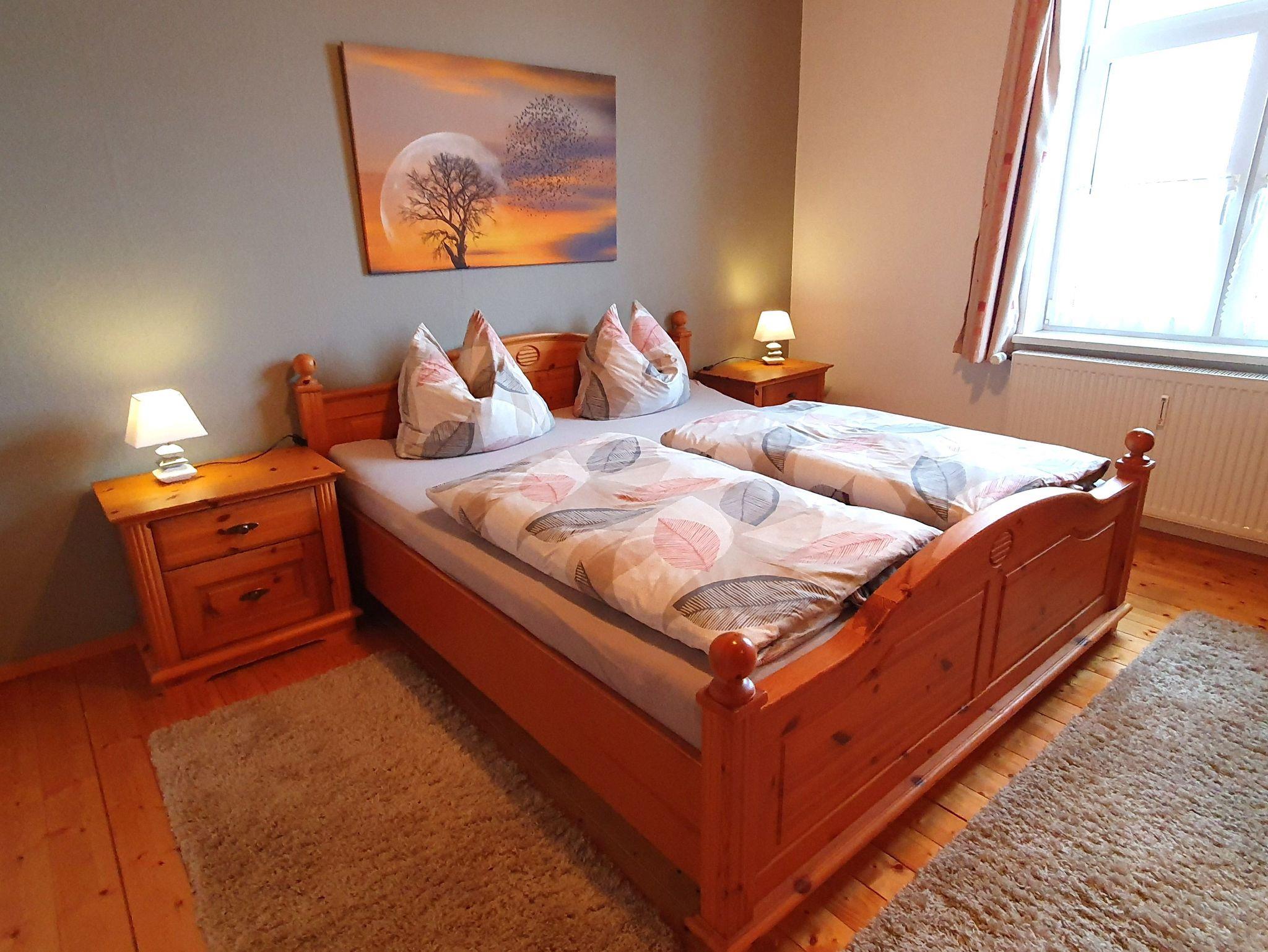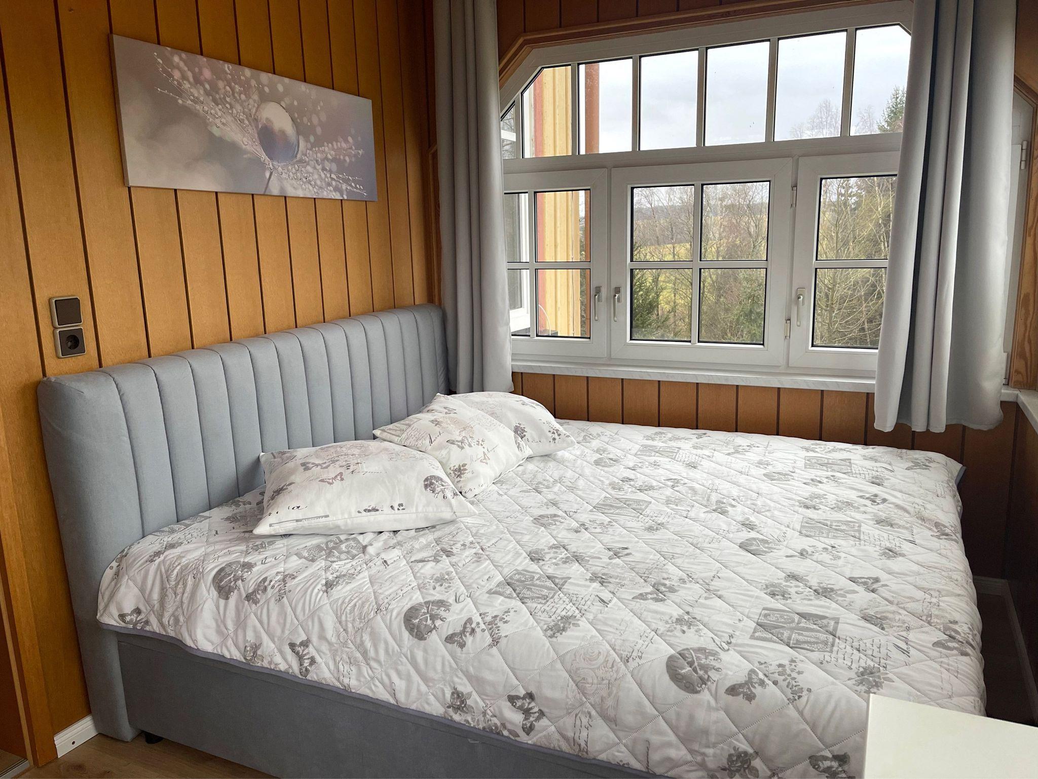 Zu der Ferienwohnung gehören zwei Schlafräume, ein Elternschlafzimmer mit einem Doppelbett und großen Kleiderschrank und eine weitere Schlafmöglichkeit in einer lichtdurchfluteten Veranda mit einem Boxspringbett. (Separater Raum)