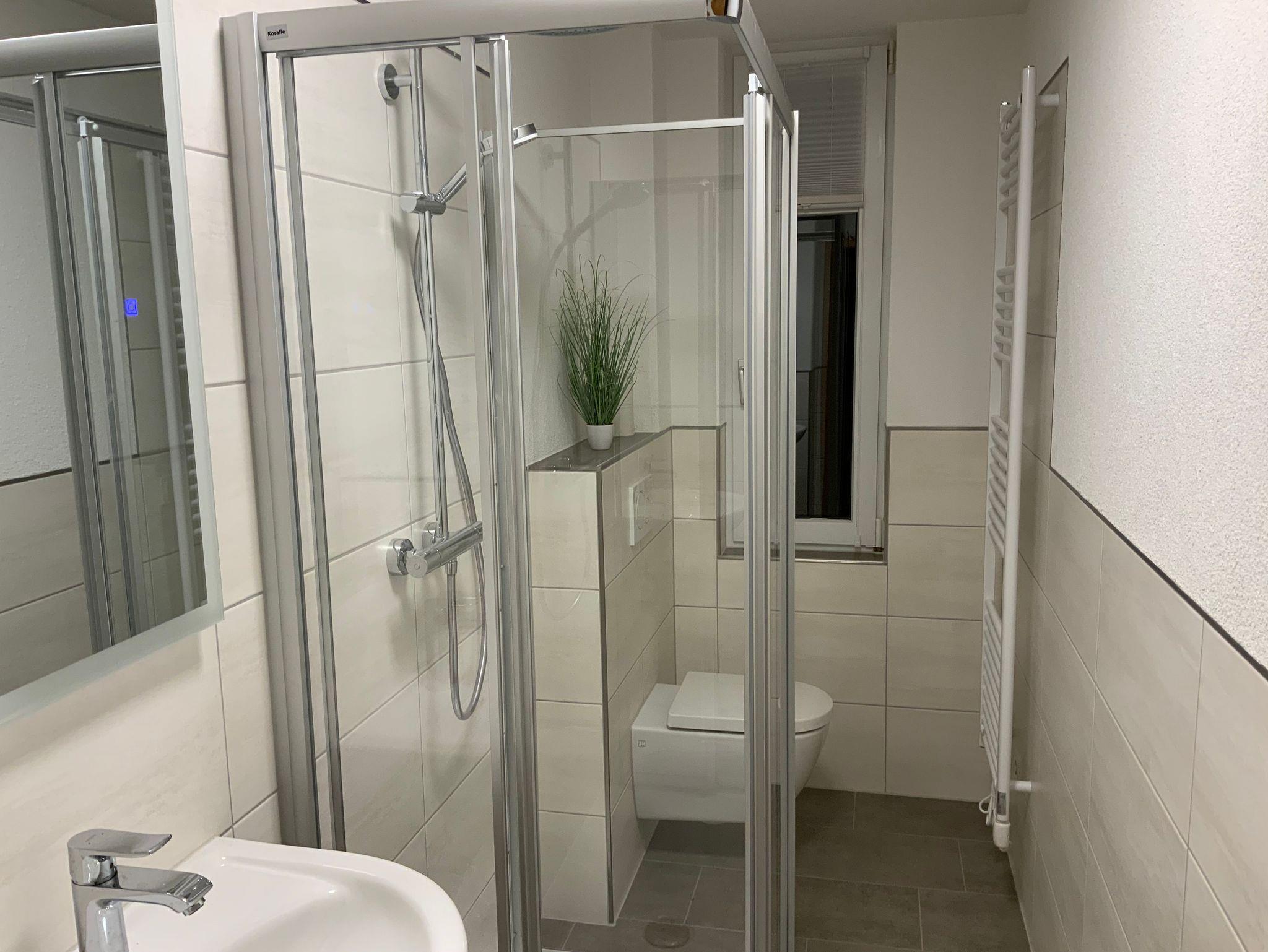 Im Bad befindet sich neben einem Tageslichtfenstern, eine Wanne mit Duschfunktion.