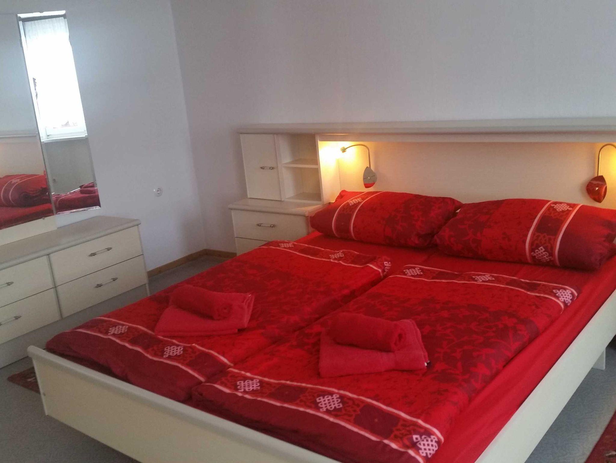 Die erste Ferienwohnung wurde 2012 komplett neu renoviert und eingerichtet und befindet sich im Erdgeschoss des Hauses. Sie verfügt über ein Wohnzimmer mit Schrankwand, Couchgarnitur 3/2/1, SAT-TV mit DVD-Player und Radio. Im ersten Schlafzimmer befinden sich ein Doppelbett (180x200) und eine bequeme Schlafliege (90x200), ein Kleiderschrank und Nachttische. Im zweiten Schlafzimmer sind ein Etagenbett (90x200) und ein Einzelbett (90x200) ein Kleiderschrank und Nachttische vorhanden. In der Küche befindet sich neben einem Esstisch mit 6 Stühlen, auch die komplett eingerichtete Einbauküche mit Vier-Plattenherd, Backofen, Mikrowelle, Kaffeemaschine, Wasserkocher und Toaster sowie Geschirr, Gläser und Bestecke für 12 Personen. Im Badezimmer sind eine Dusche und ein WC vorhanden.