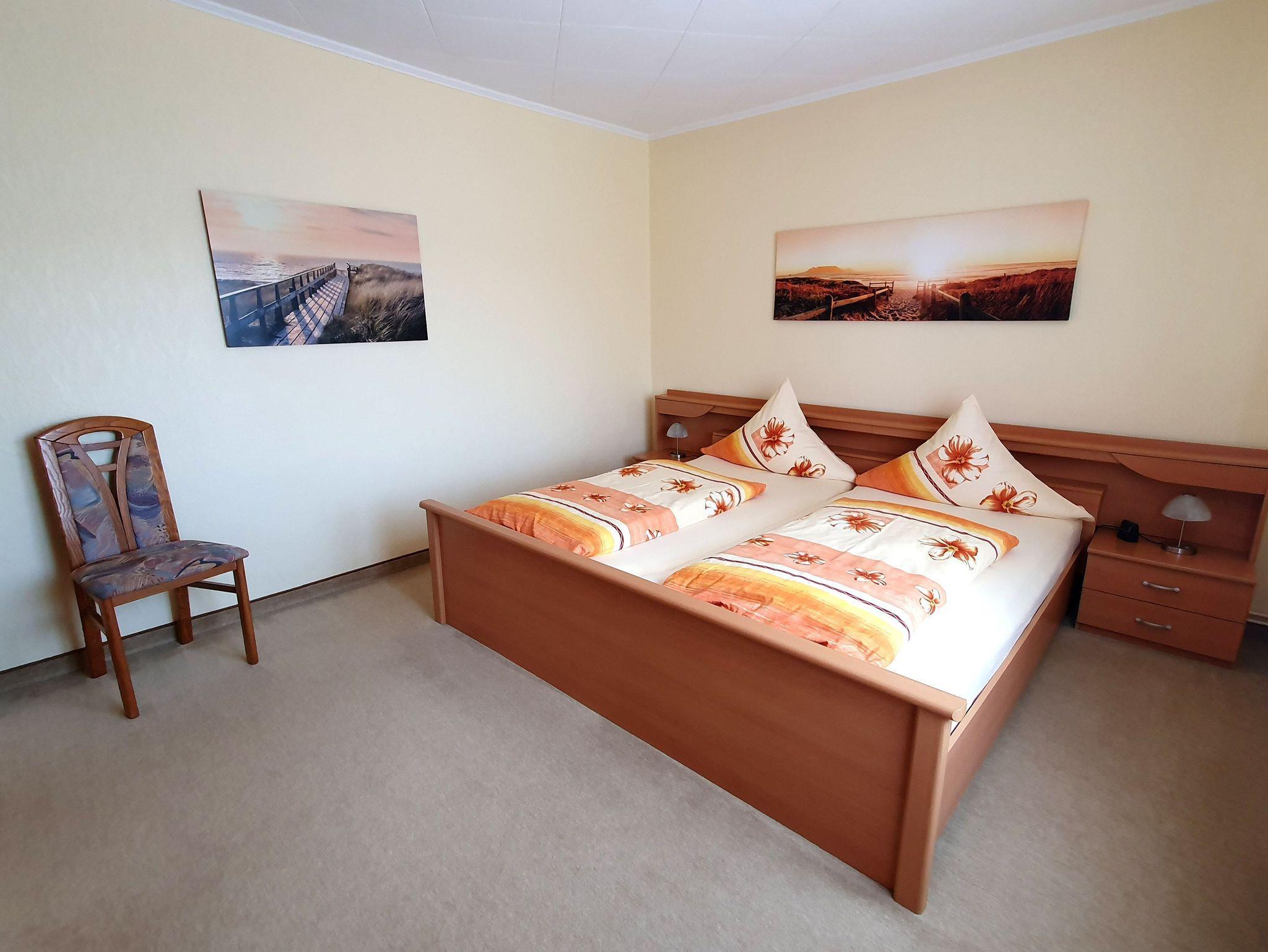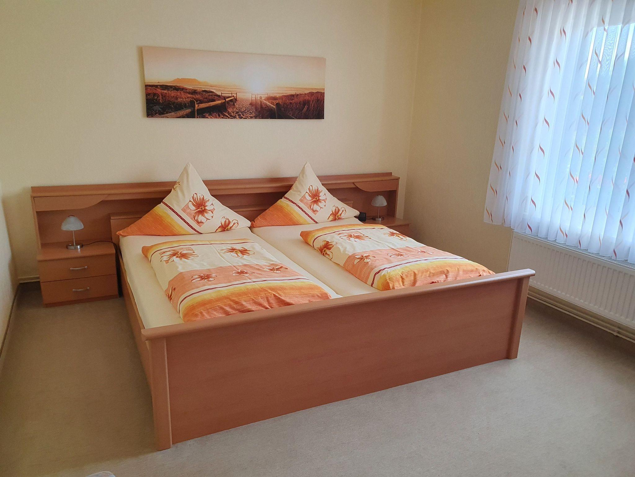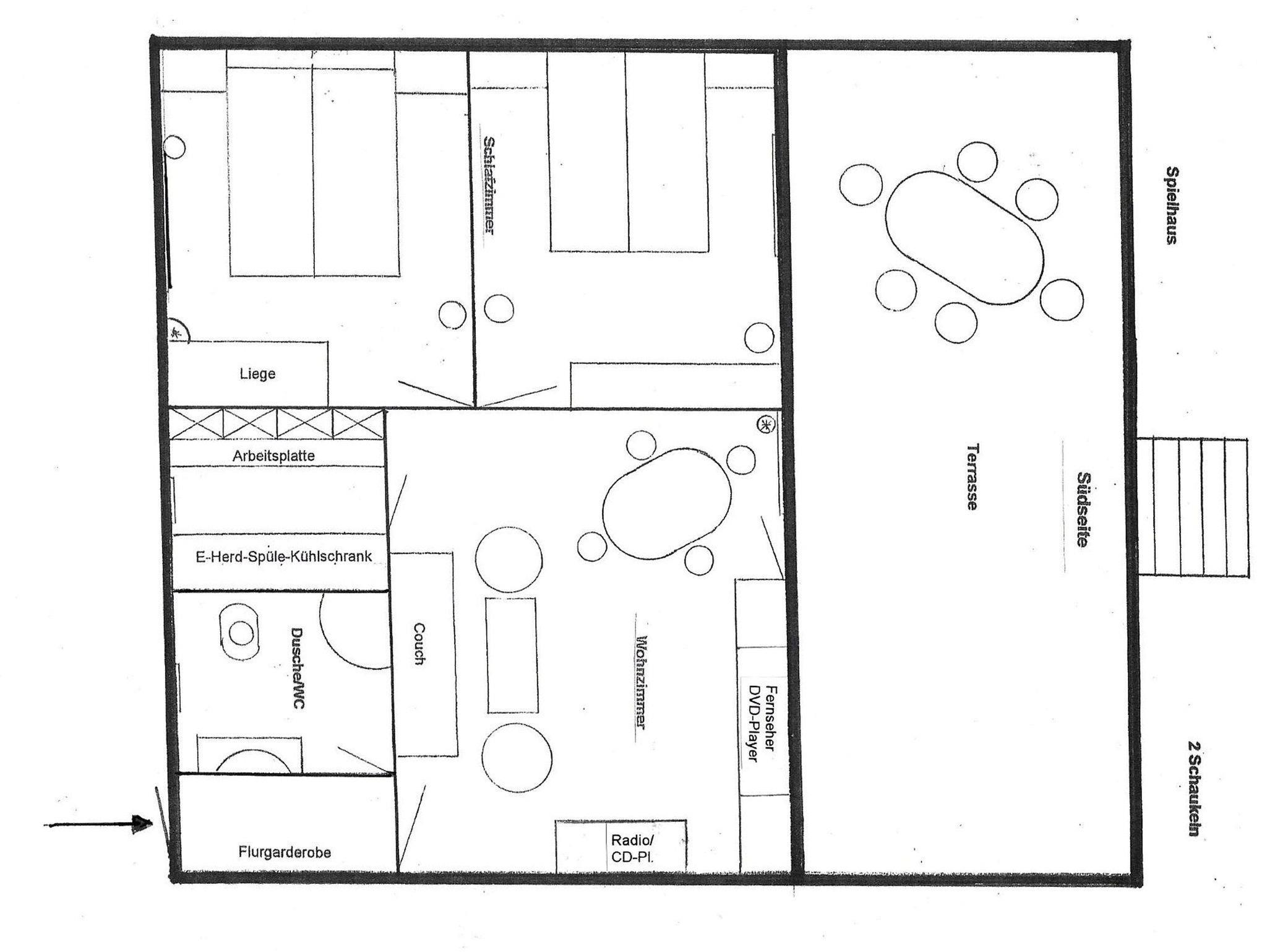 Das Ferienhaus (Nichtraucherwohnung) hat eine Wohnfläche von 70 qm, inkl. Küche sowie Dusche/WC. Es ist ebenerdig, von der Terrasse in den Garten befindet sich eine Treppe mit 5 Stufen. Flur, Bad und Küche sind gefliest, Wohn- und die 2 Schlafzimmer mit Teppichboden ausgelegt. Die Fenster von Bad, Küche und einem Schlafzimmer (1 Doppelbett + Schlafcouch) sind auf der Nordseite, Richtung Südseite befindet sich das Wohnzimmer mit Zugang zur Terrasse und das 2. Schlafzimmer (mit Doppelbett, jeweils 1 x 2 m). Im 3-Bettzimmer befindet sich ein 2. Fernseher.