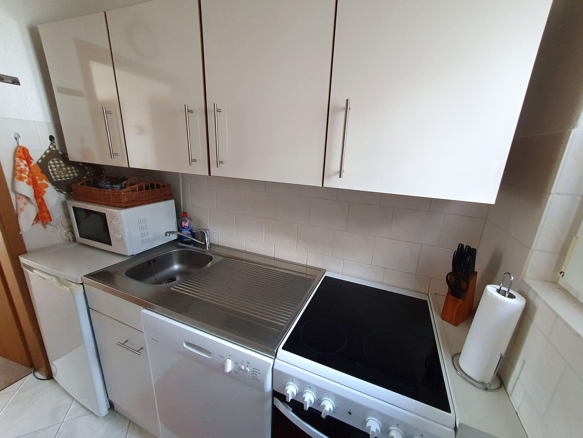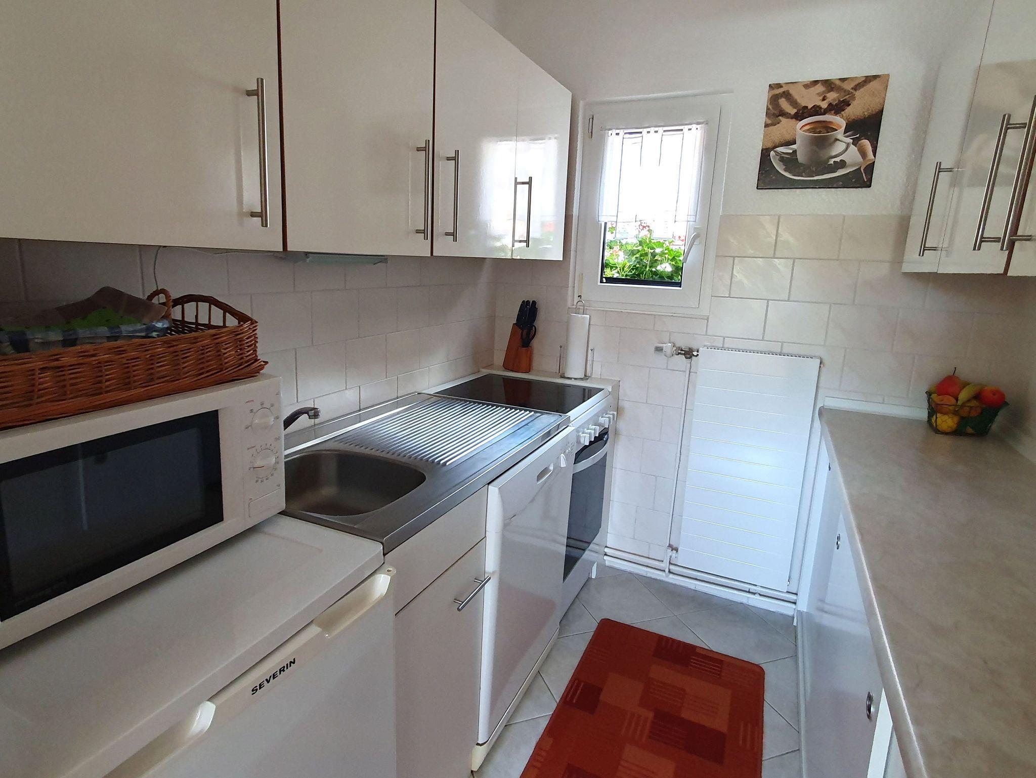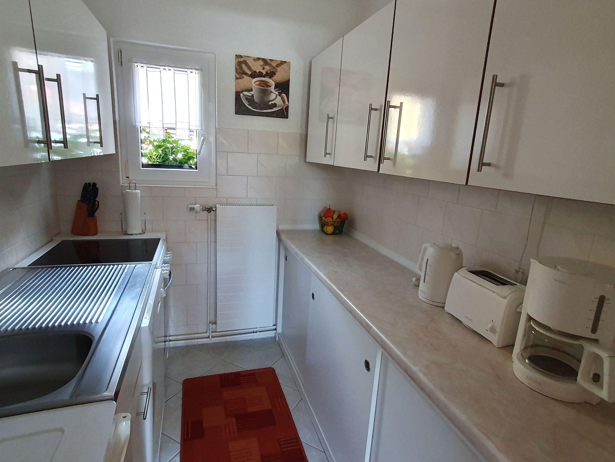 Das Ferienhaus (Nichtraucherwohnung) hat eine Wohnfläche von 70 qm, inkl. Küche sowie Dusche/WC. Es ist ebenerdig, von der Terrasse in den Garten befindet sich eine Treppe mit 5 Stufen. Flur, Bad und Küche sind gefliest, Wohn- und die 2 Schlafzimmer mit Teppichboden ausgelegt. Die Fenster von Bad, Küche und einem Schlafzimmer (1 Doppelbett + Schlafcouch) sind auf der Nordseite, Richtung Südseite befindet sich das Wohnzimmer mit Zugang zur Terrasse und das 2. Schlafzimmer (mit Doppelbett, jeweils 1 x 2 m). Im 3-Bettzimmer befindet sich ein 2. Fernseher.