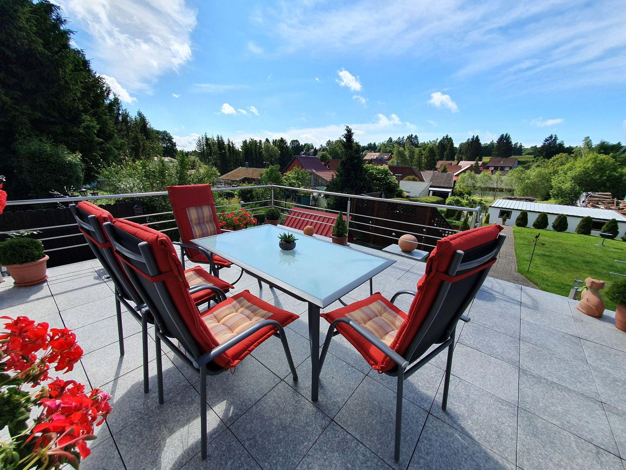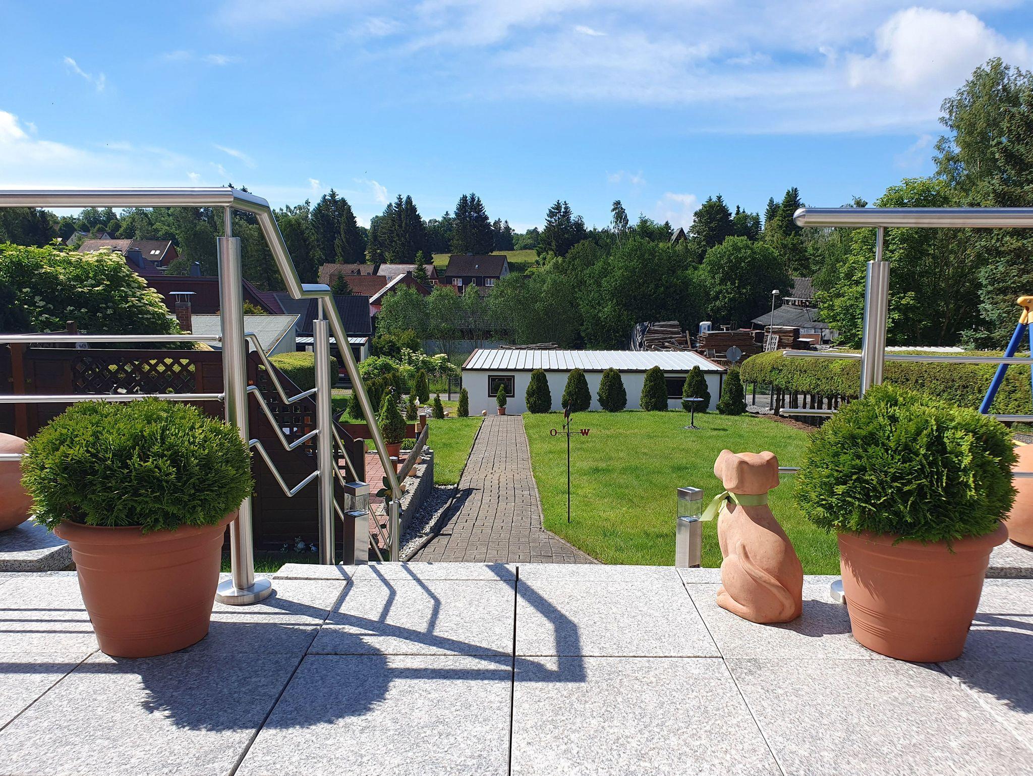 Das Ferienhaus ist ein massiv gebautes, eingeschossiges Haus, zentral beheizt. Es befindet sich oberhalb unseres Gartens in ruhiger Lage. Die große Terrasse (Südseite), mit Gartenmöbel und Grill, ist vom Wohnzimmer direkt zugänglich, man hat einen sehr schönen Blick auf Teile des Ortes und die grünen Hänge der Bergwiesen.