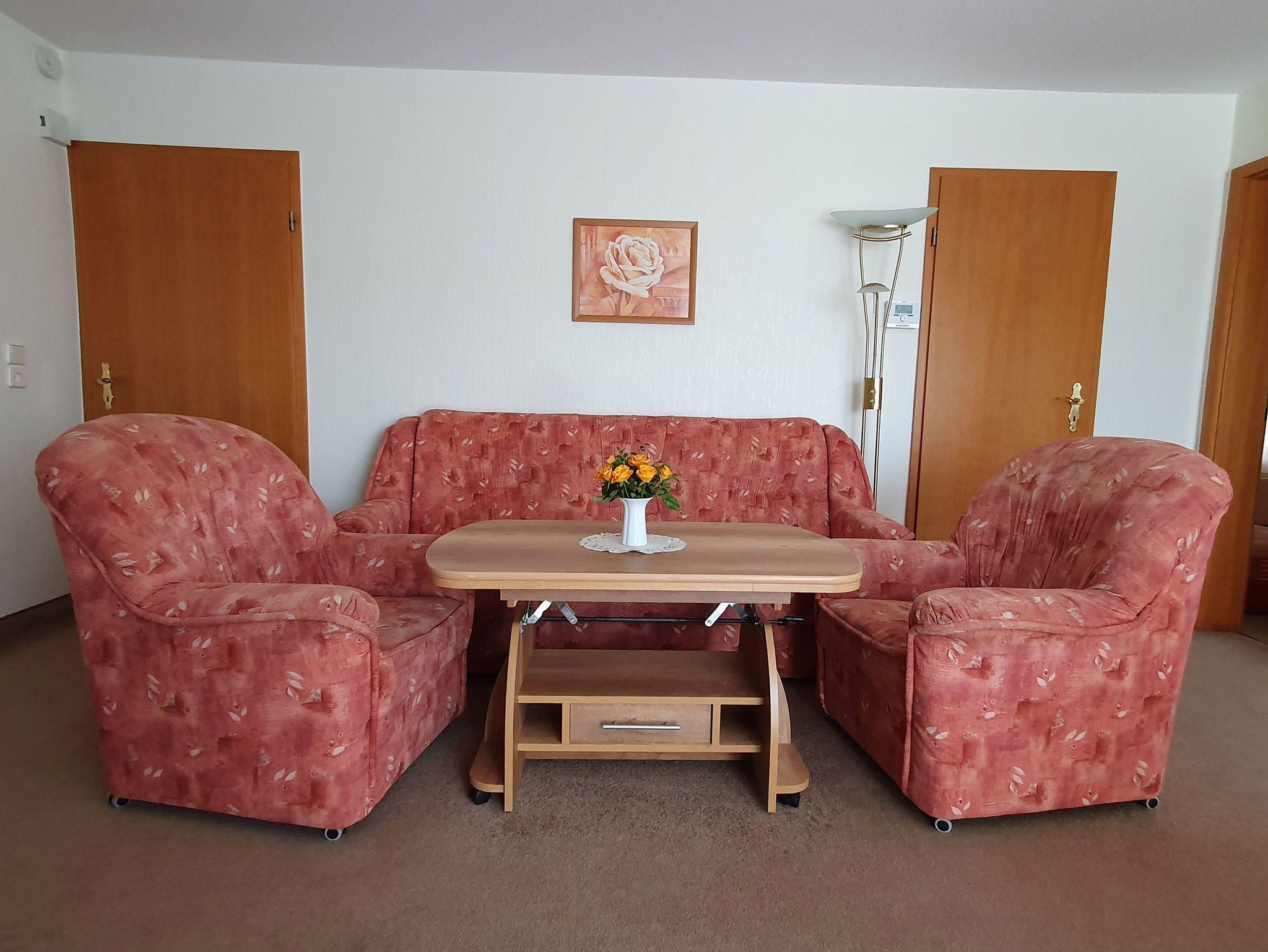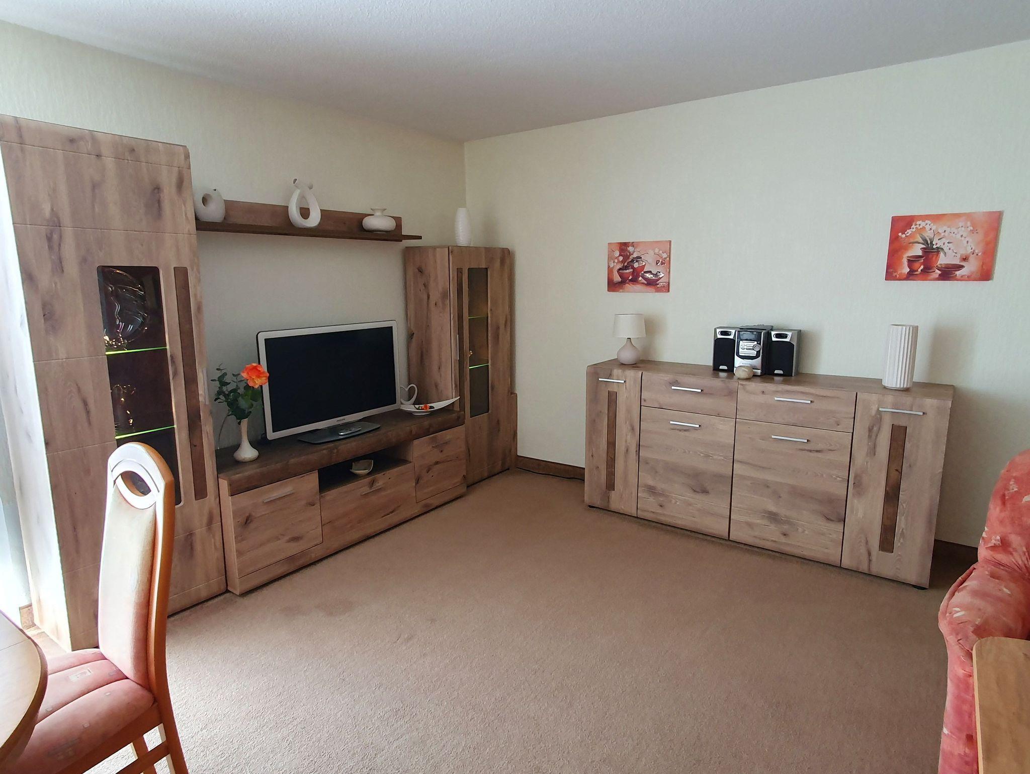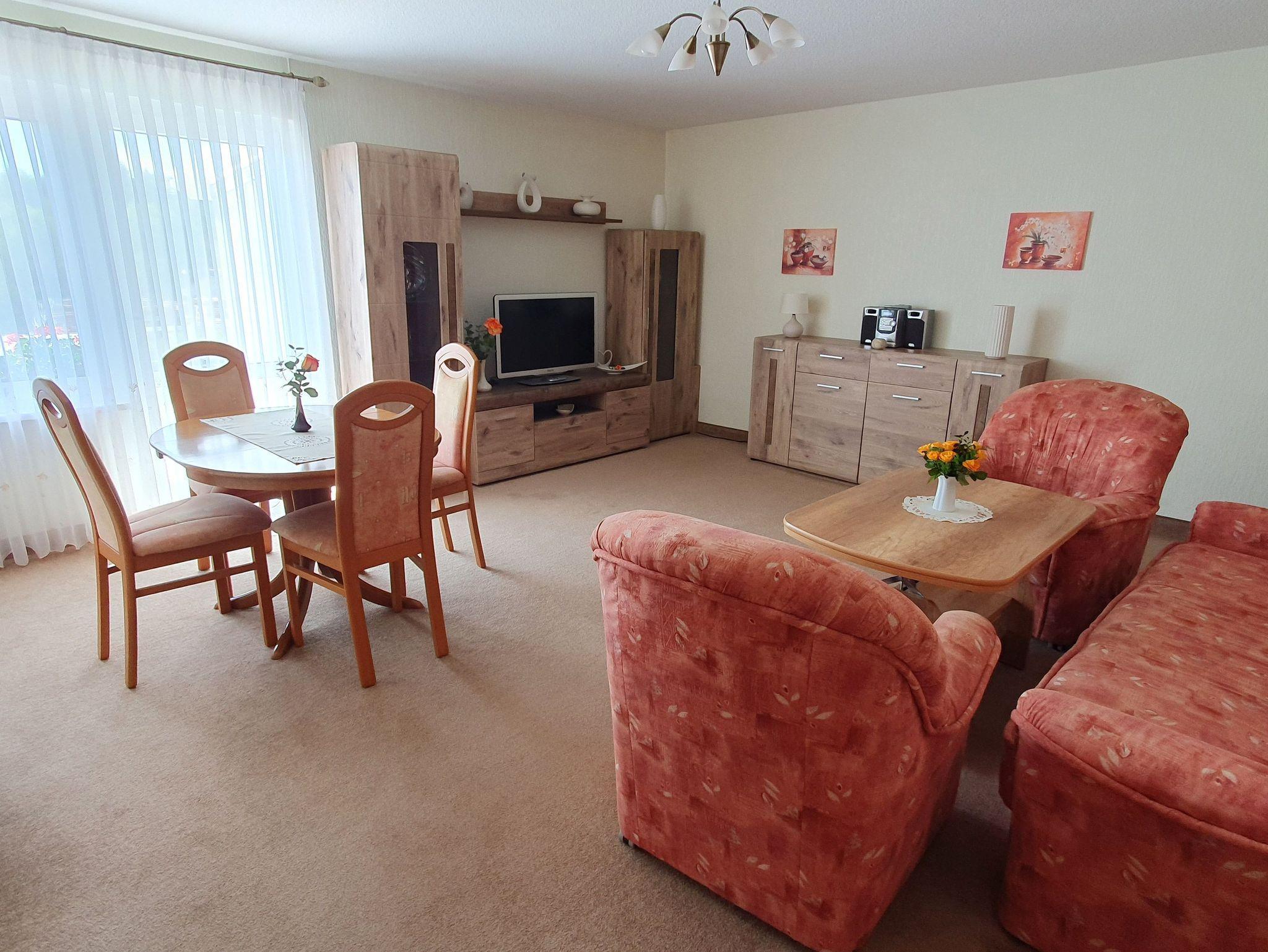 Das geräumige, gemütliche Wohnzimmer ist mit Couchgarnitur, Essplatz, SAT-TV, DVD-Player sowie Stereo-Radio mit CD-Player ausgestattet.