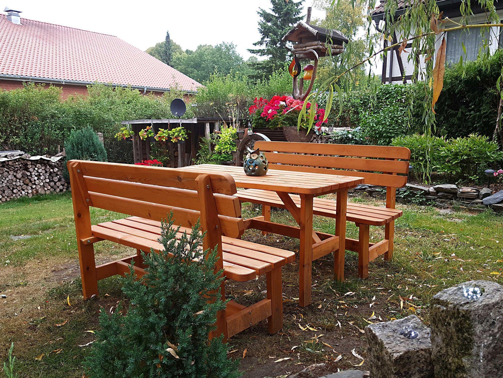 - im Garten eine Liegewiese mit separater Holzsitzgruppe mit Sonnenschirm