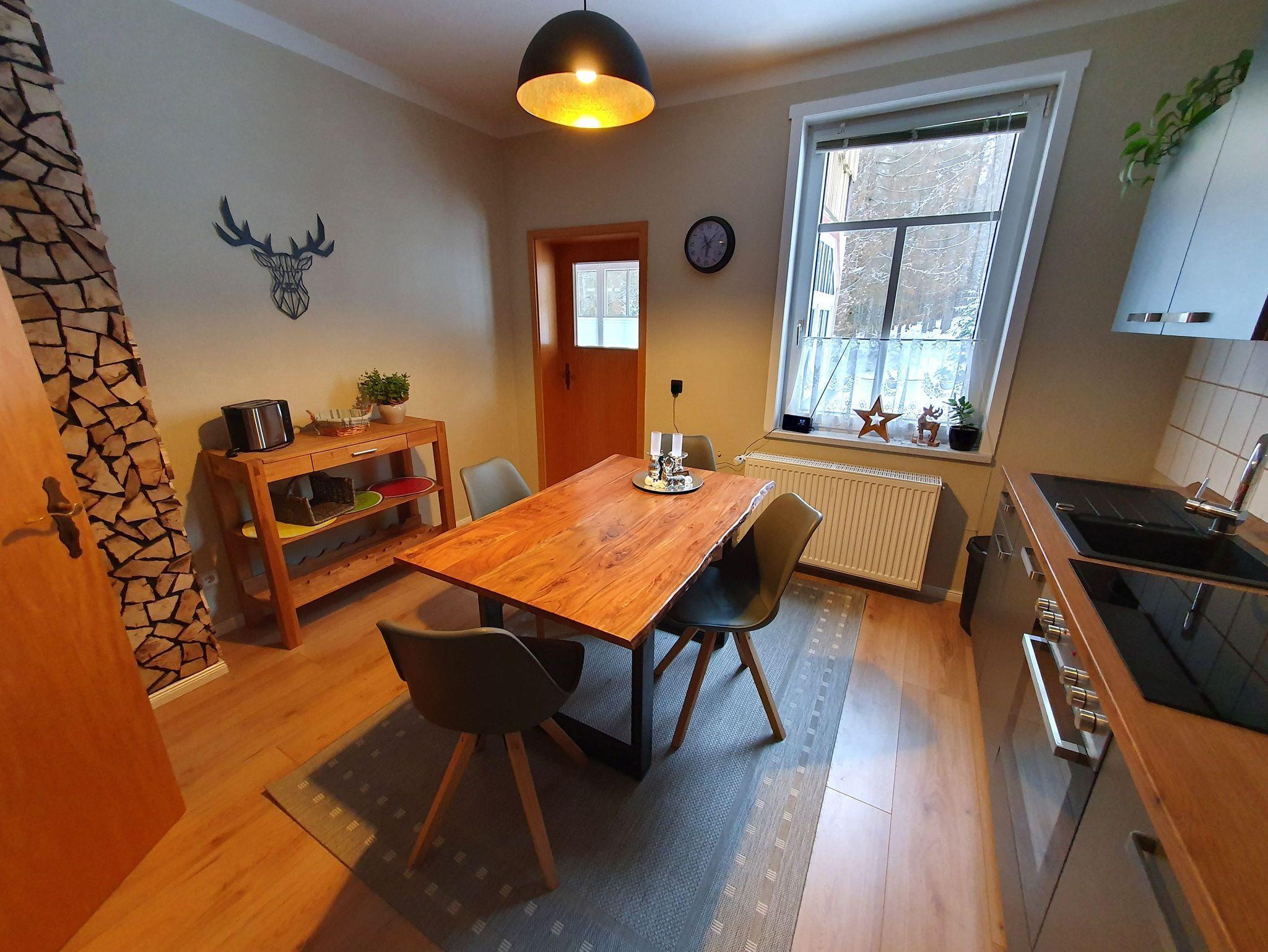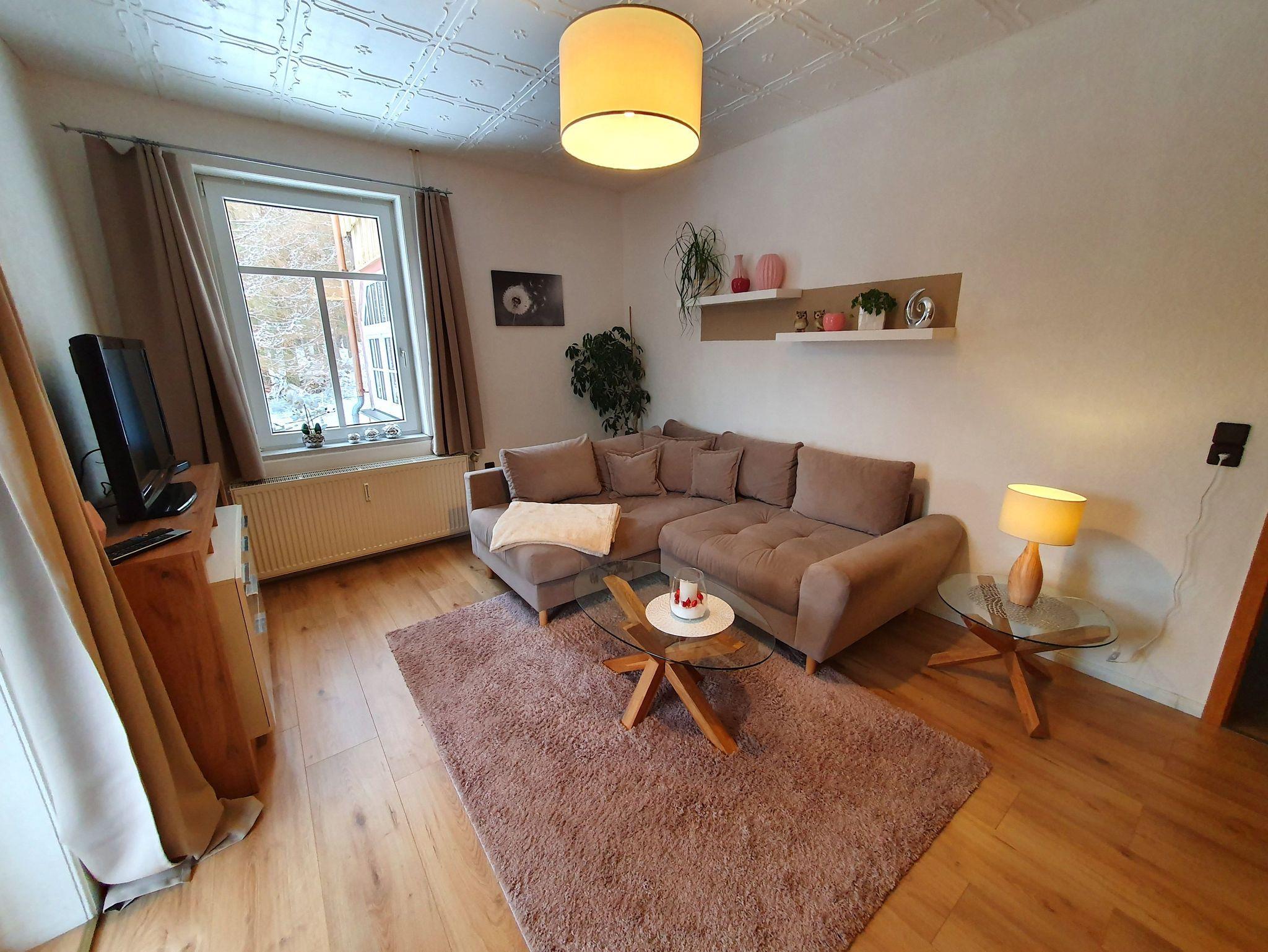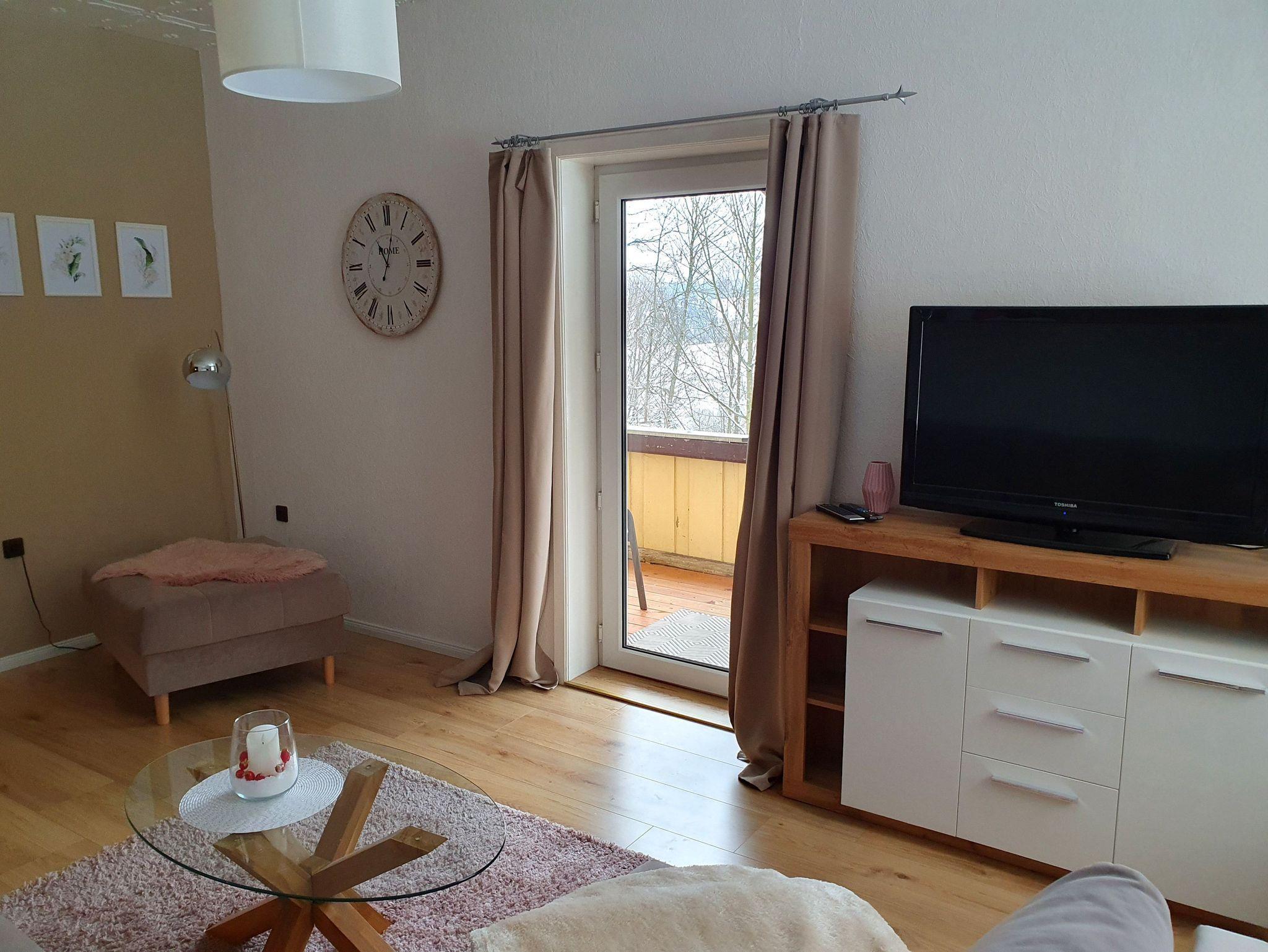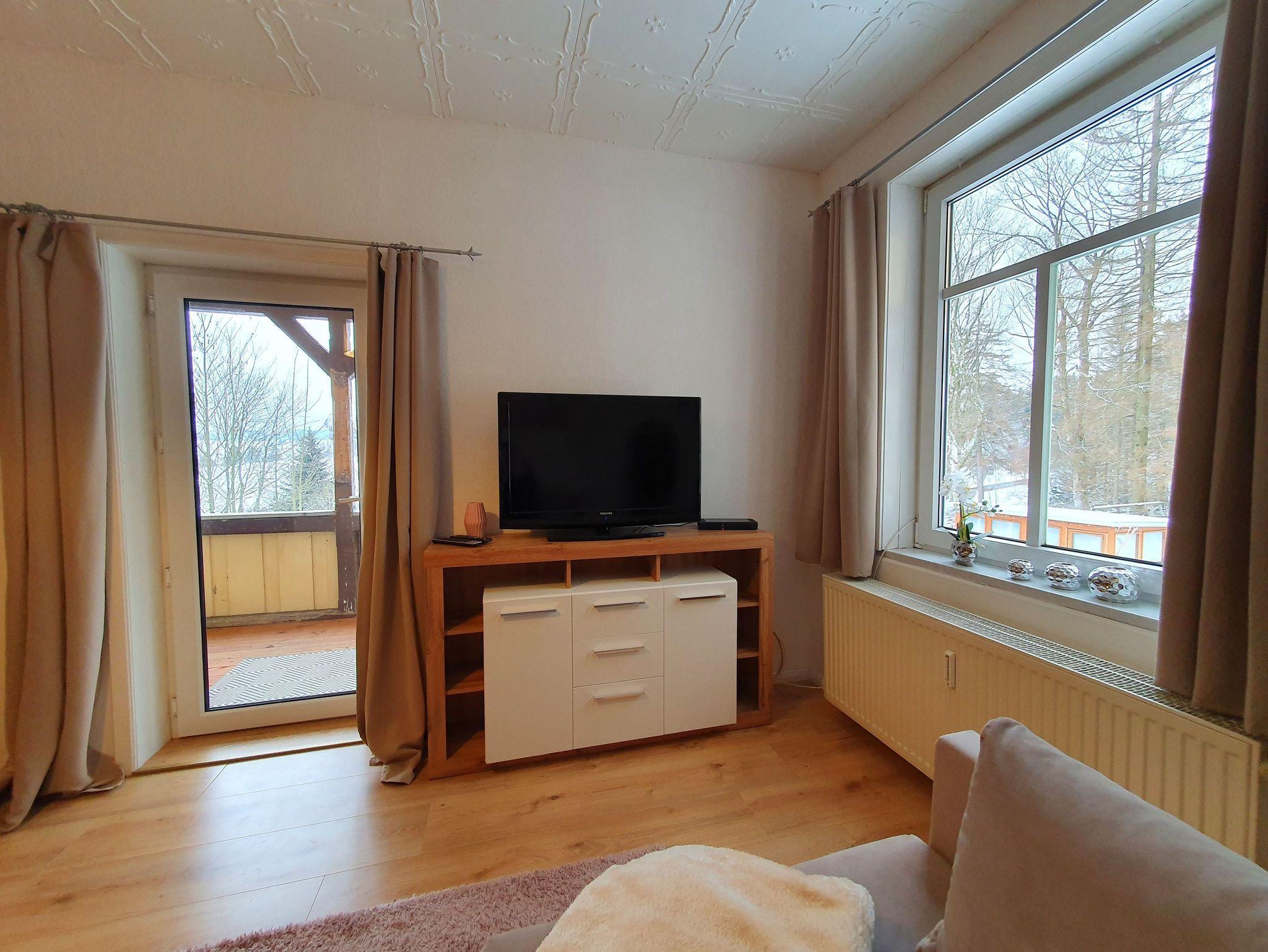 Zeit zum Erholen ermöglicht auch das große Wohnzimmer. Die Kombination aus einer gemütlichen Eckcouch und einem Flachbildfernseher eignet sich perfekt für einen Ausklang nach einem erlebnisreichen Tag bei uns im Oberharz.