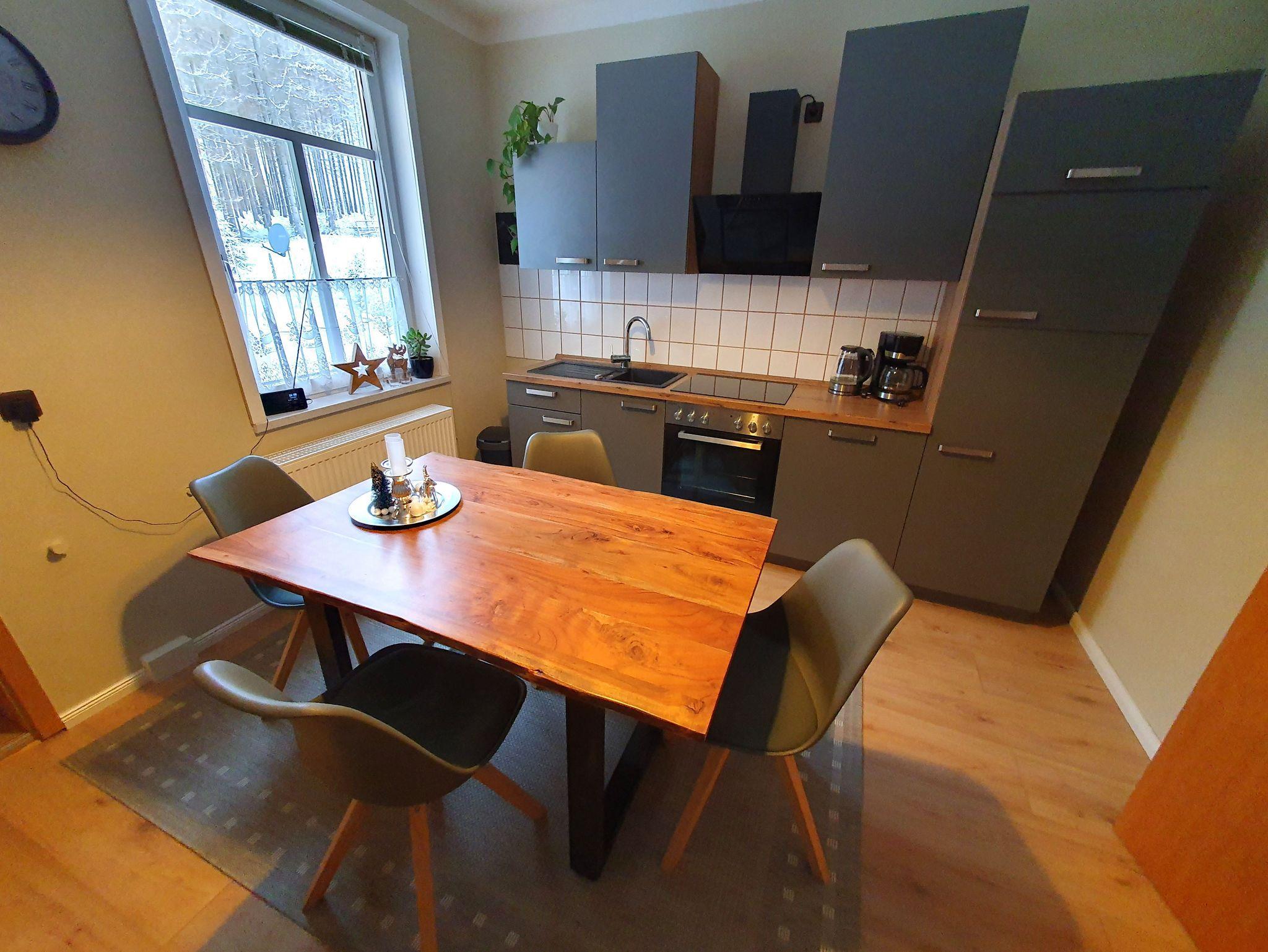 Es erwartet Sie eine hochwertige Einbauküche inklusive Ceranfeld, Kühl- und Gefrierkombi, Geschirrspüler und Esstisch. Die modern abgestimmten Holzoptiken sorgen für einen angenehm warmen Flair.