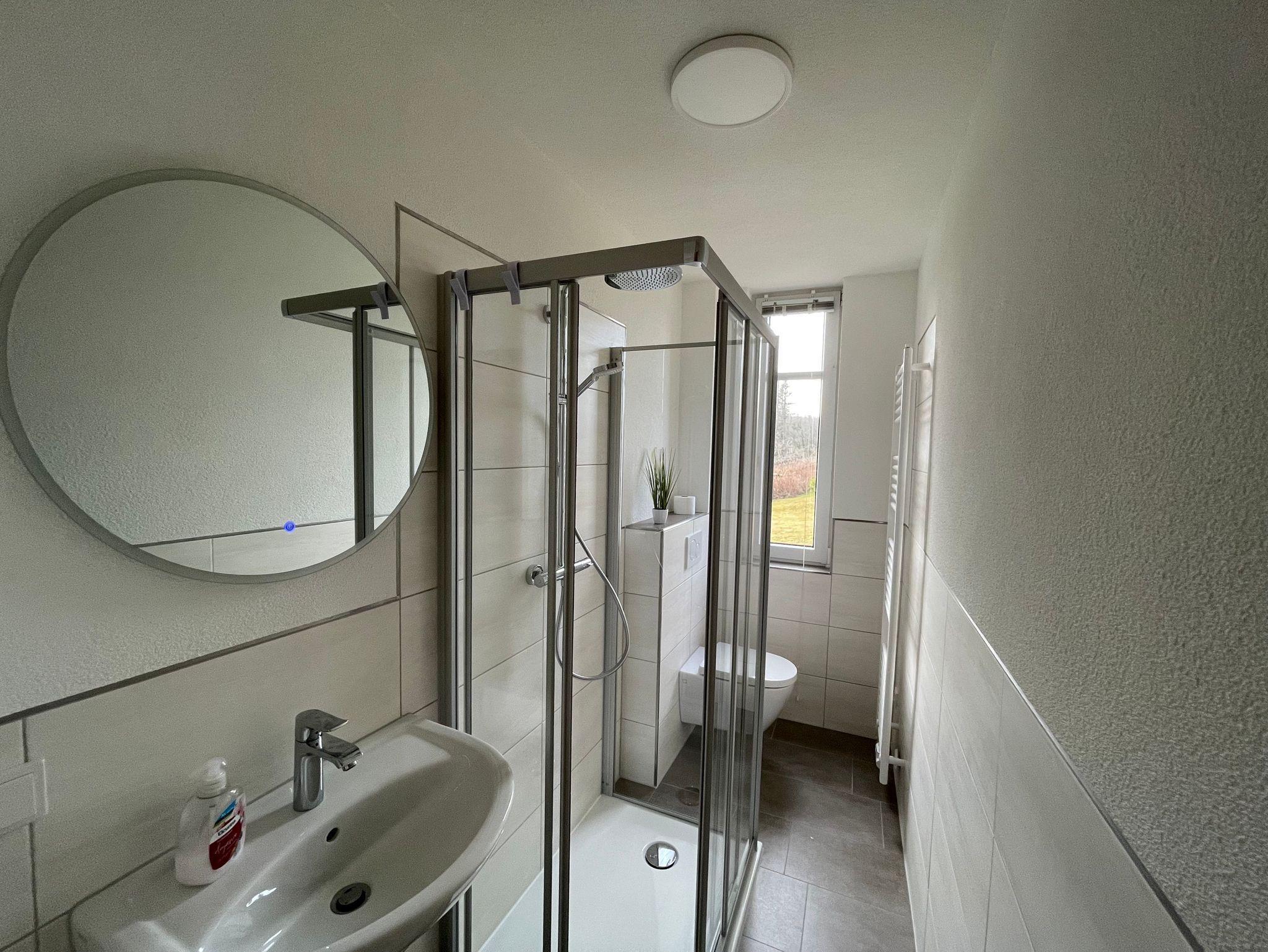 Das Badezimmer ist mit einer Dusche ausgestattet und verfügt über ein Tageslichtfenster.