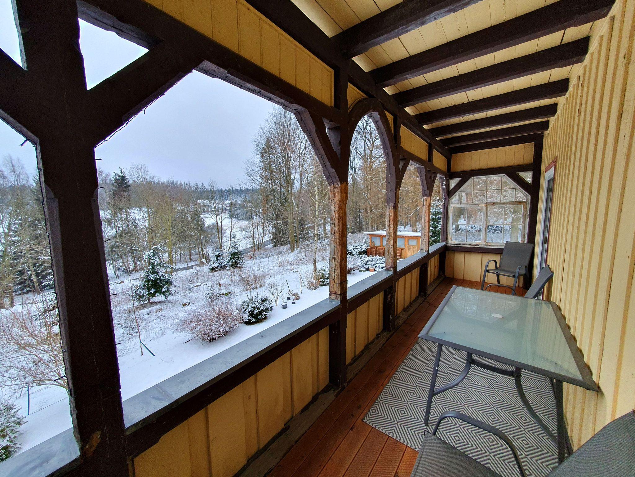 Zusätzlich kommen sie vom Wohnzimmer auf den großen überdachten Balkon mit Sitzgelegenheiten. Ganz ab vom Lärm der Städte lauschen sie hier der Natur.