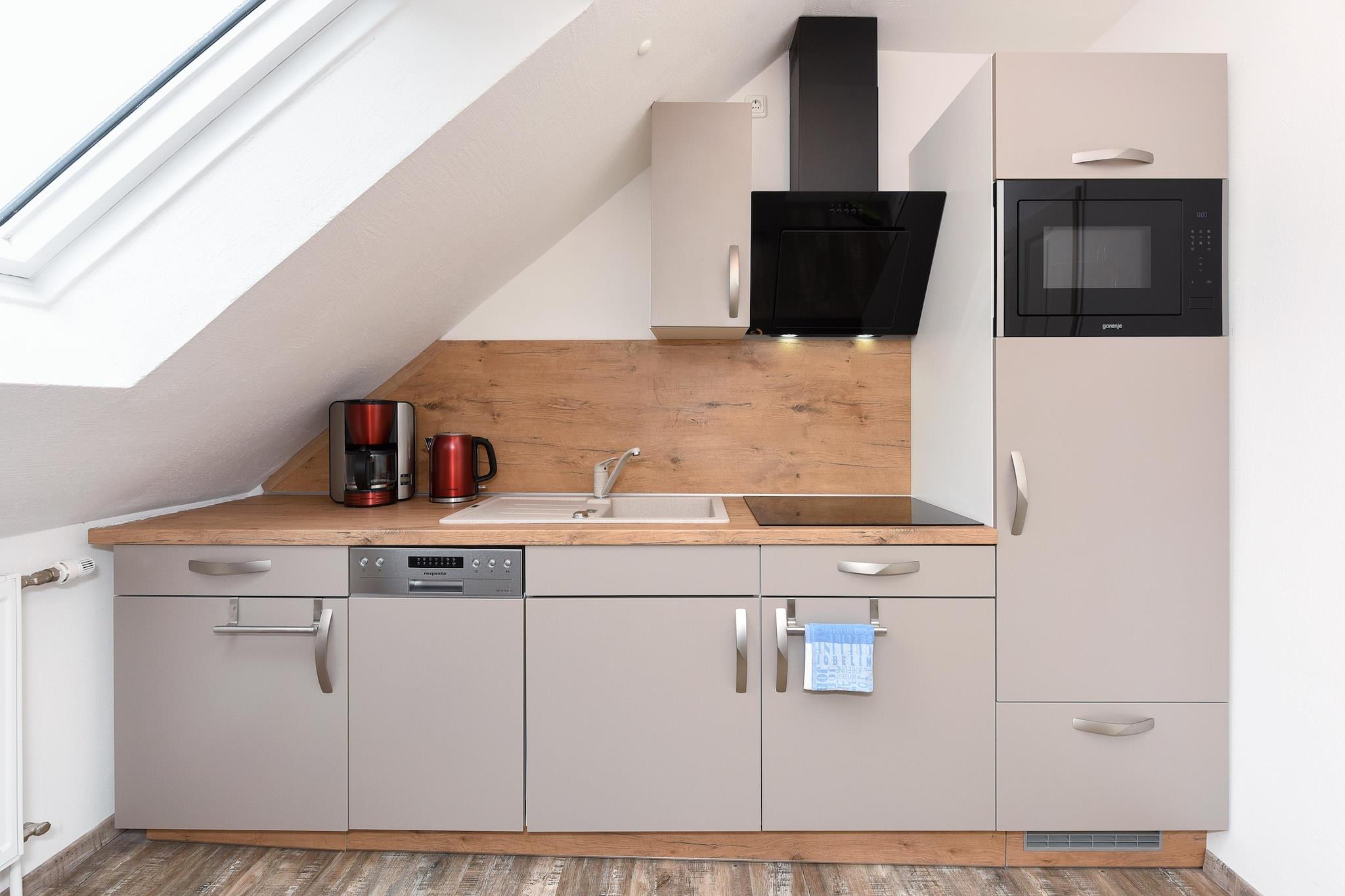 Loft: (Køkken(kogeplade(Komfur med fire kogeplader), elkedel, brødrister, kaffemaskine, mikrobølgeovn, opvaskemaskine , køleskab), Stue/soveværelse(dobbeltsovesofa, Fjernsyn, spisebord, sofahjørne), soveværelse(dobbeltseng, Fjernsyn), badeværelse(bruser, håndvask, toilet, føntørrer)) balkon, havemøbler, grill(deles med andre gæster), parkering, Vaskeripakke inkl.