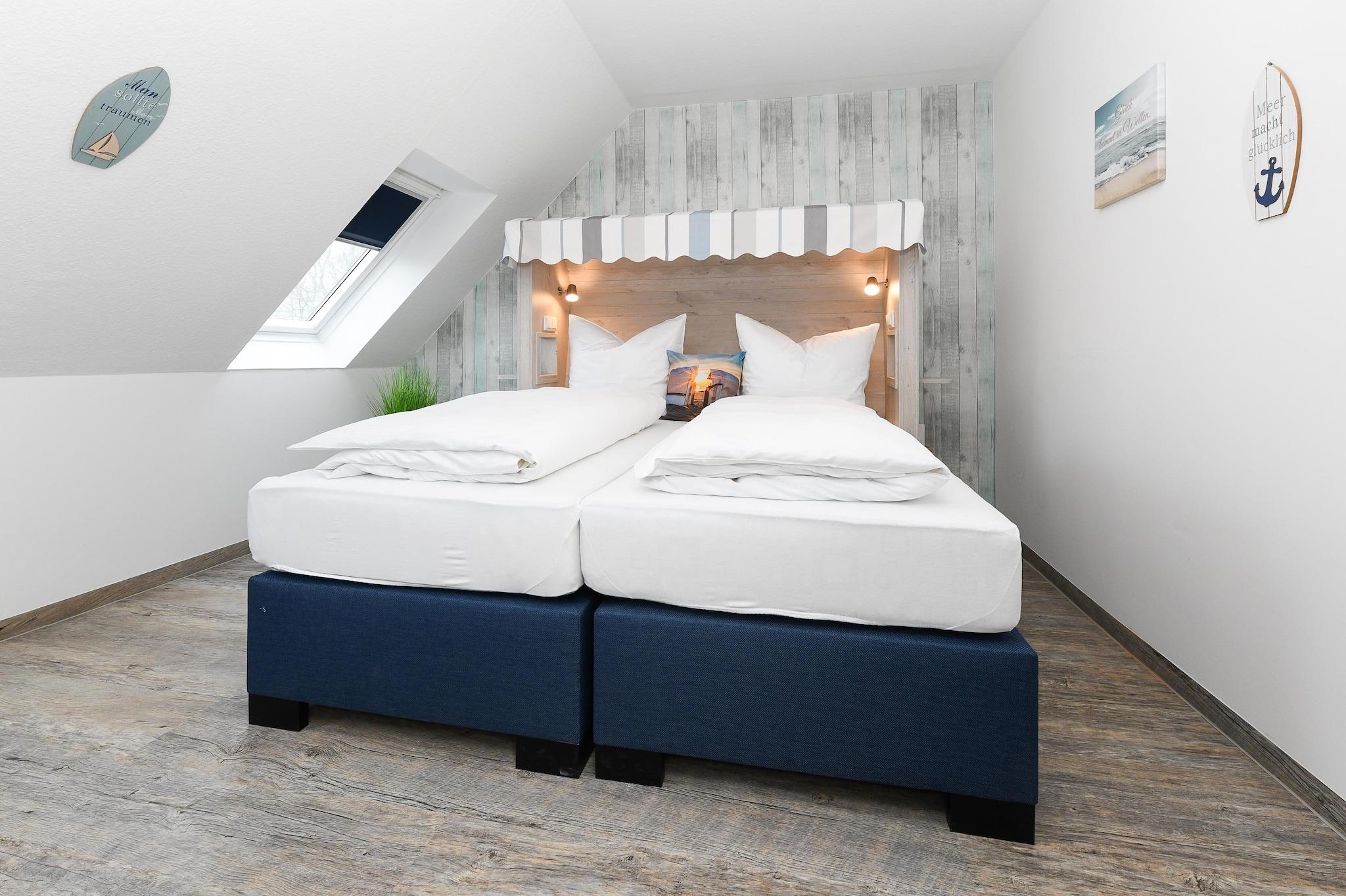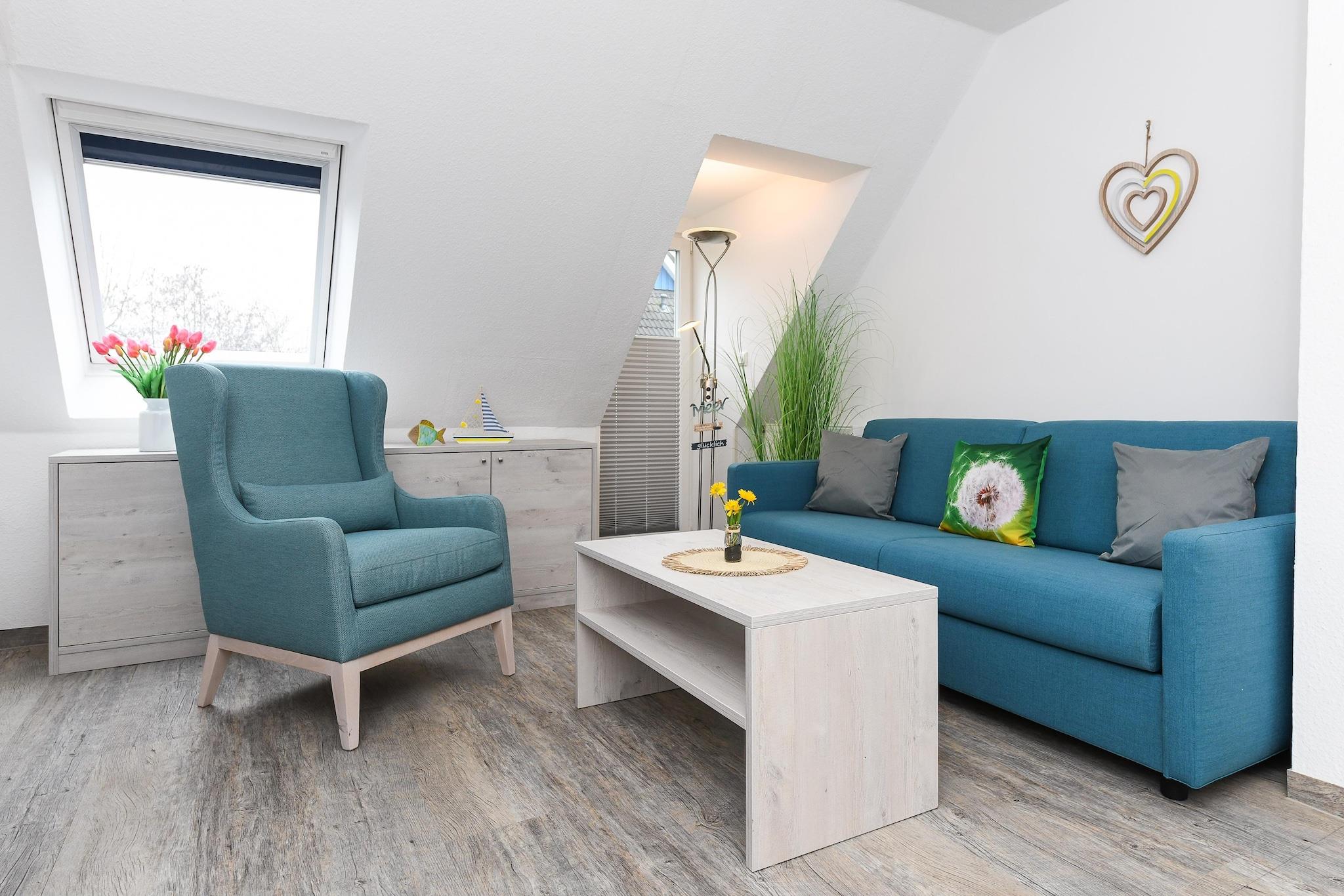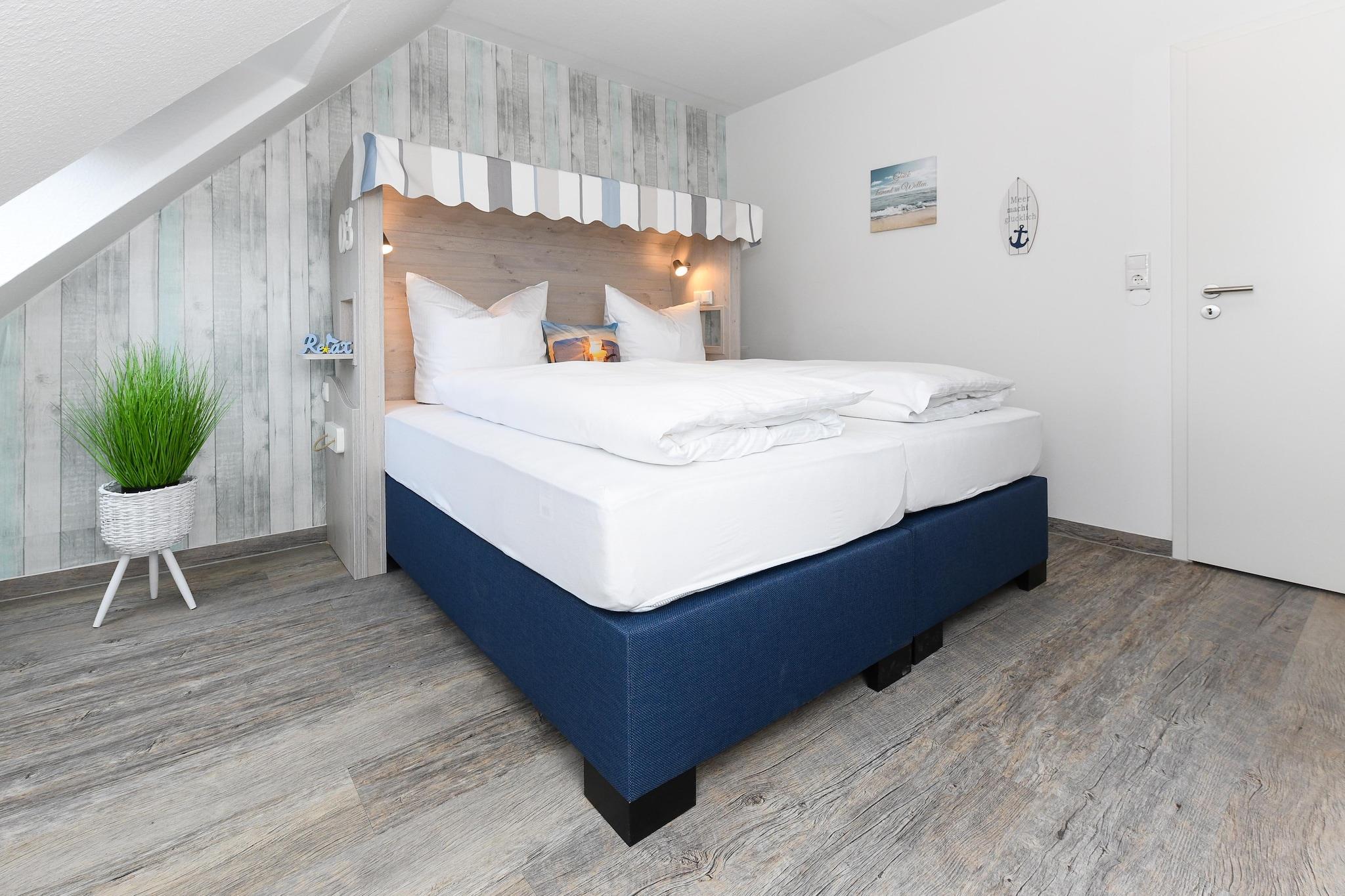 Denne hyggelige lejlighed i stueetagen på cirka 50 m² tilbyder alt, hvad familier og dem, der søger afslapning, har brug for til en afslappende ferie ved Nordsøen. Lejligheden er ideel til 1 til 4 personer plus et ekstra lille barn. Den har en lys opholdsstue med integreret køkken, et separat soveværelse, et børneværelse og et moderne badeværelse med bruser og toilet. Den private terrasse inviterer til at nyde solrige morgenmader eller afslappende aftener udendørs. Gratis Wi-Fi, moderne køkkenapparater, et fladskærms-tv og madrasser af høj kvalitet sikrer komforten i hjemmet. Særligt praktisk for familier: Der er vaskemaskine og tørretumbler i fællesområdet. Den velholdte have bag huset tilbyder rigelig plads til leg og afslapning. Takket være den rolige beliggenhed og nærheden til stranden, bymidten og fritidsaktiviteter er lejligheden ideel til par eller børnefamilier, der ønsker at nyde deres ferie ved Nordsøkysten. Højdepunkter: Wi-Fi, forbrugsbaserede energiomkostninger og en linnedpakke inkluderet. Bemærkning om slutrengøring: Ved ophold på mindre end 5 nætter betales et gebyr på EURO80; ellers er slutrengøring inkluderet.