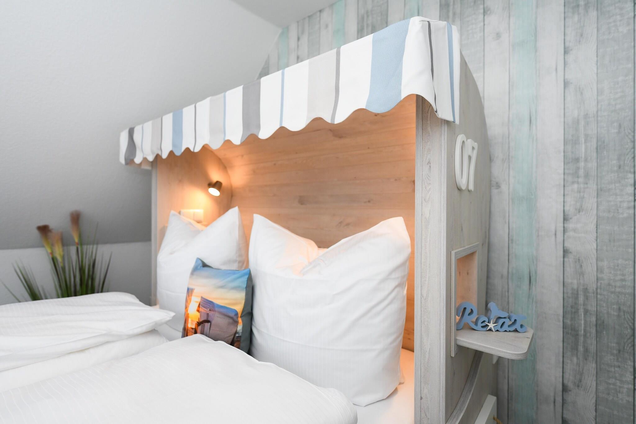 Denne kompakte lejlighed på øverste etage tilbyder cirka 34 m² plads, alt hvad du behøver for et afslappende ophold ved Vesterhavet. Den er ideel til en til to personer plus et ekstra lille barn. Lejligheden har en hyggelig opholdsstue med integreret køkken, et separat soveværelse med en madras af høj kvalitet og et moderne badeværelse med bruser, toilet og håndvask. Wi-Fi og fladskærms-tv giver ekstra komfort. En vaskemaskine og tørretumbler deles med gæsterne. Den store have bag huset tilbyder masser af plads til at slappe af eller til at børnene kan lege. Takket være den rolige beliggenhed og den korte afstand til stranden er denne lejlighed det perfekte tilflugtssted for par eller solorejsende, der ønsker at nyde afslapning og Vesterhavets luft. Højdepunkter: Wi-Fi, forbrugsbaserede energiomkostninger og en linnedpakke er inkluderet. Bemærkning om slutrengøring: Ved ophold på mindre end 5 nætter opkræves et gebyr på EURO80; ellers er slutrengøring inkluderet.