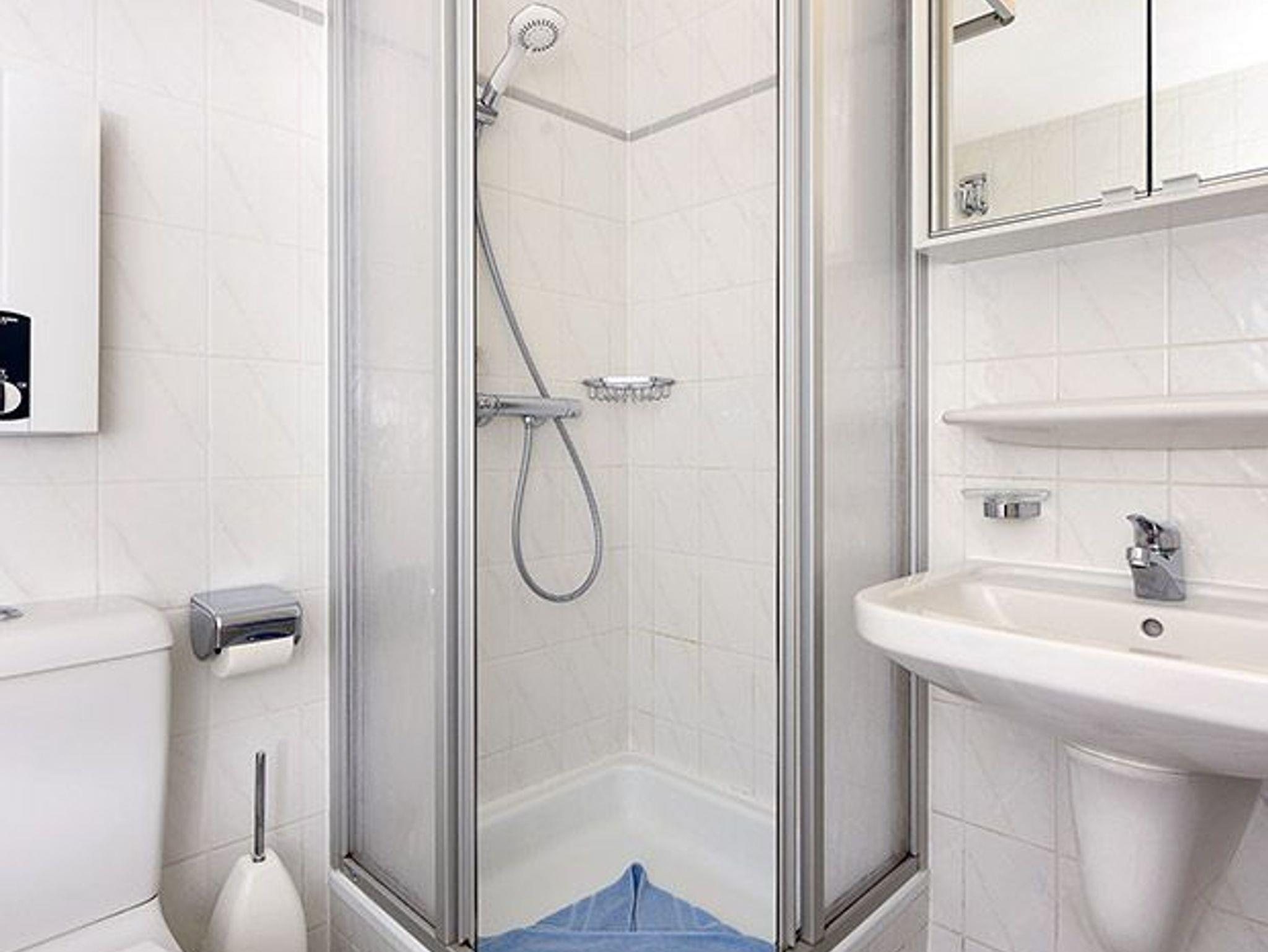 Badezimmer mit Dusche, Waschtisch und WC