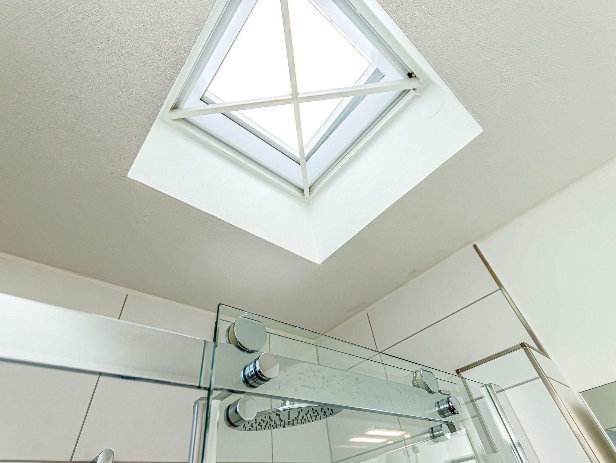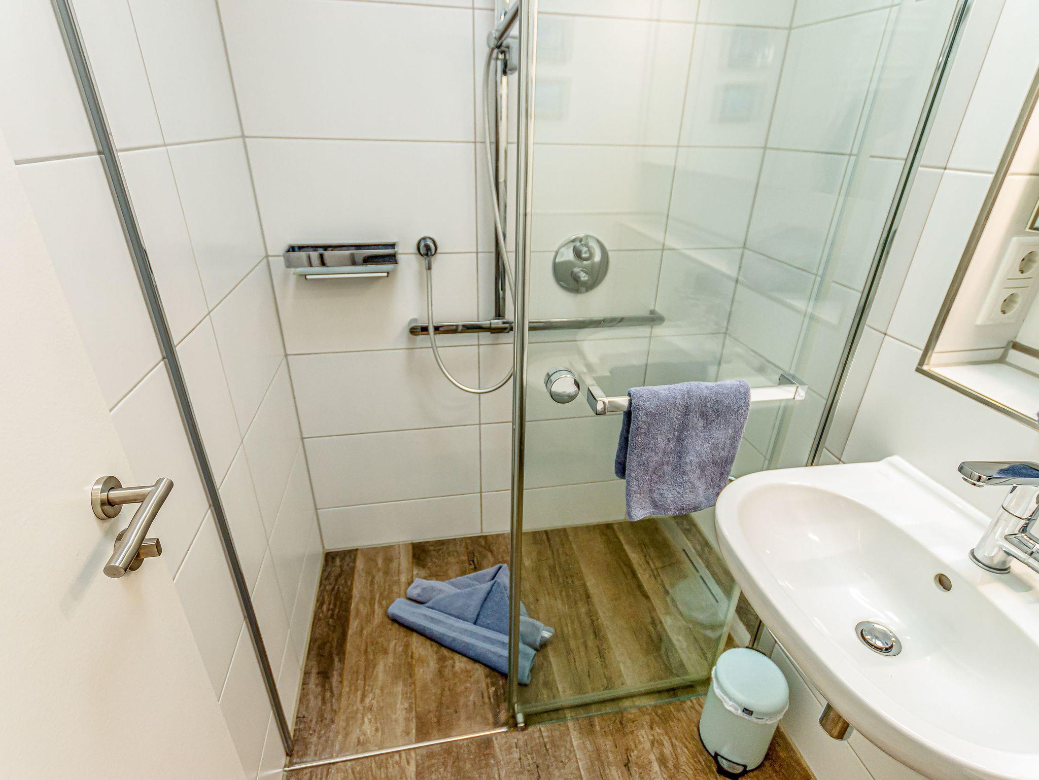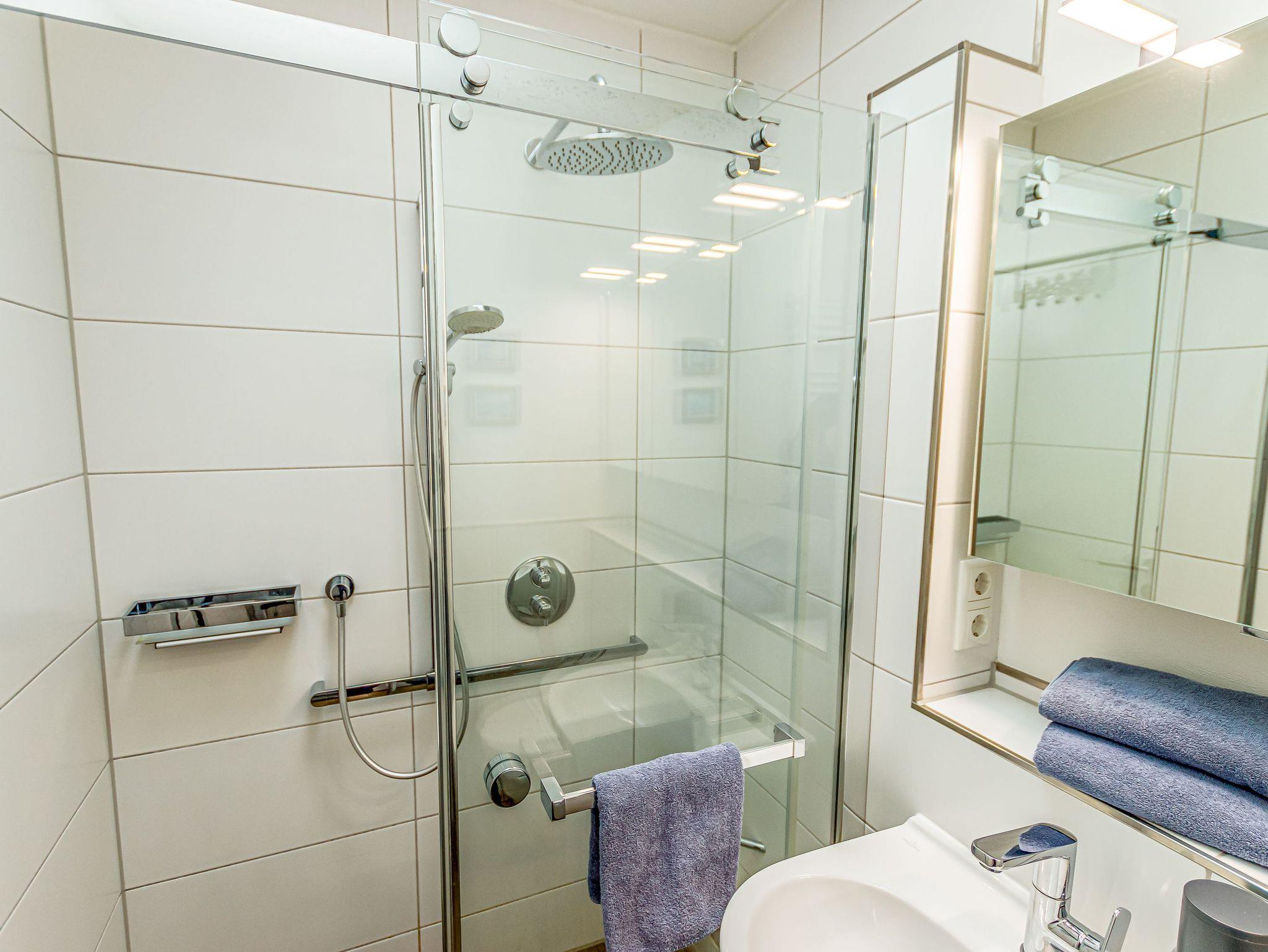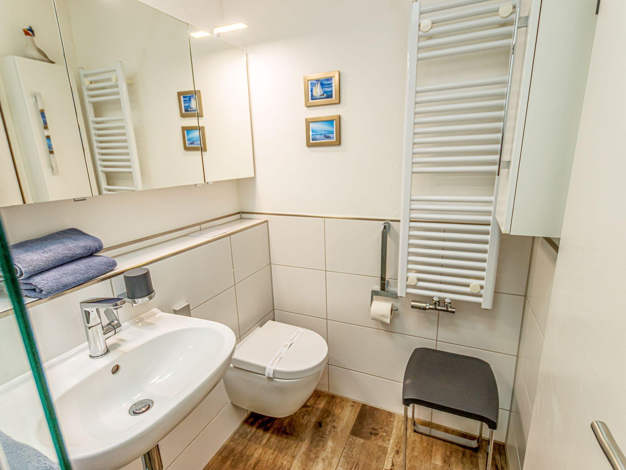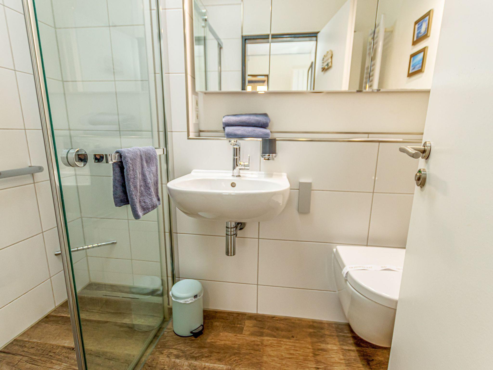 Badezimmer mit Dusche, Waschtisch und WC